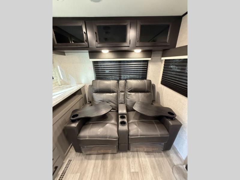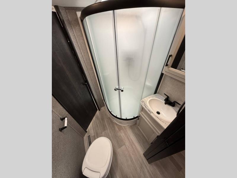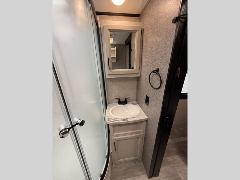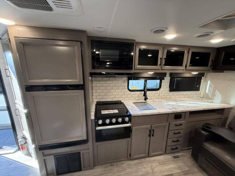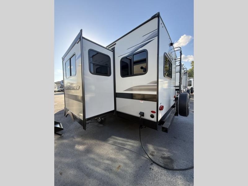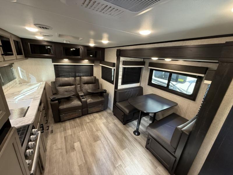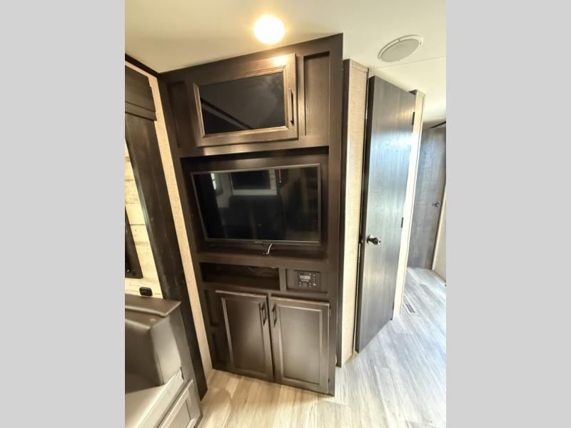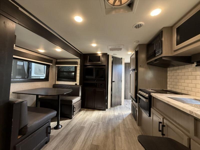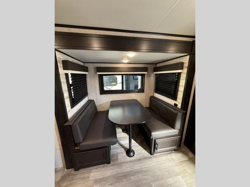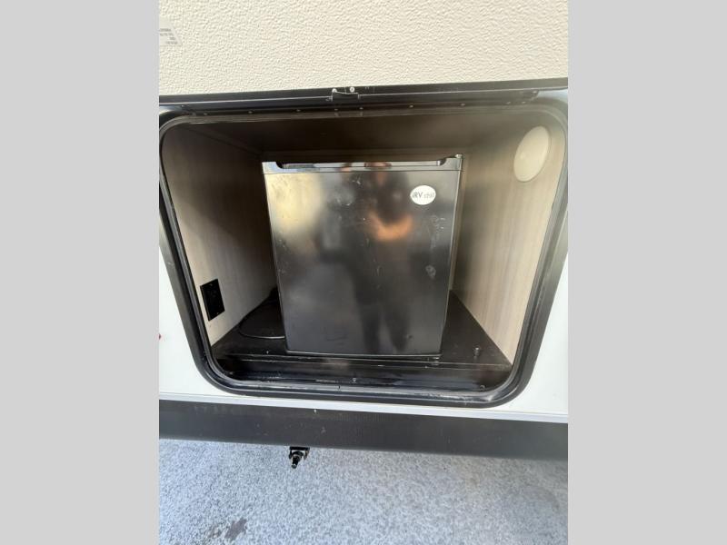 Camp at a local state park or travel to see new places with this trailer that can sleep four when you utilize the furniture as sleeping space. Two can sleep in the front bedroom on a queen bed with dual wardrobes and includes access to the double entry bathroom, while two others sleep on the booth dinette slide out, and the rear jackknife sofa. There is an LED TV in the main area to watch while everyone plans their activities or while the cook makes meals using full amenities. There is an outside fridge to store more cold items which is super handy when you are relaxing outside under the 20' power awning. You might even like to add a few options, take a look at the list.