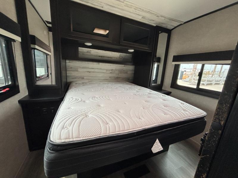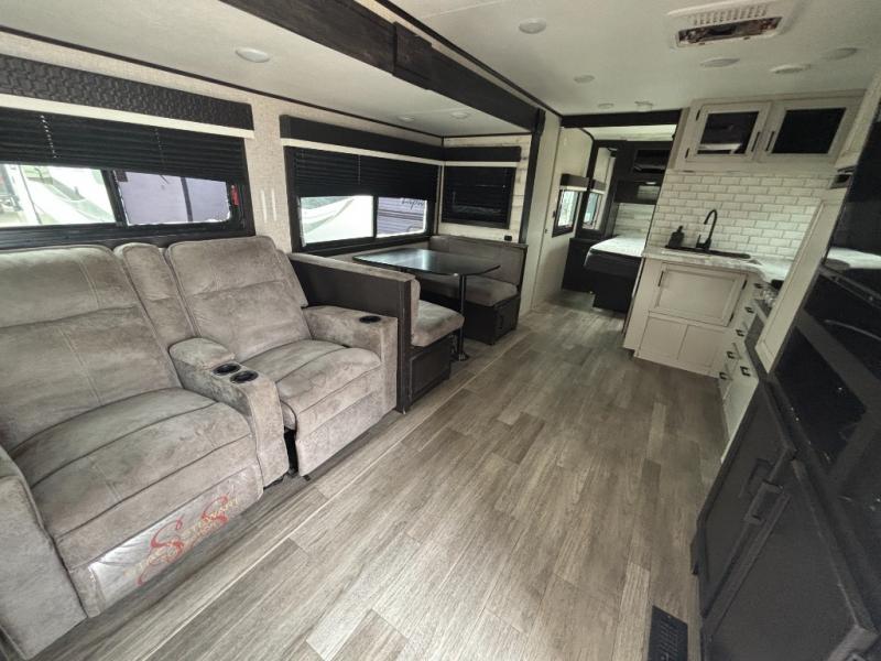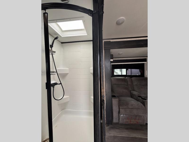 Looking for convenience and privacy in your next RV? Well this full rear bathroom has lots of room for you to move around as you get ready each morning in privacy! The front private bedroom has a walk-around 60" x 75" queen bed with wardrobes on either side to keep your clothes looking their best. You can enjoy home cooked meals while at the campsite thanks to the three burner cooktop and 6 cu. ft. refrigerator, plus there is a walk-in pantry to store all of your favorite snacks. The jackknife sofa and booth dinette within the slide out offer comfortable places to relax, yet you can switch the jackknife sofa out for the optional tri-fold sofa or the optional theater seating. You can even cook breakfast outdoors using the outside kitchen and stay protected from the elements by the 19' power awning!