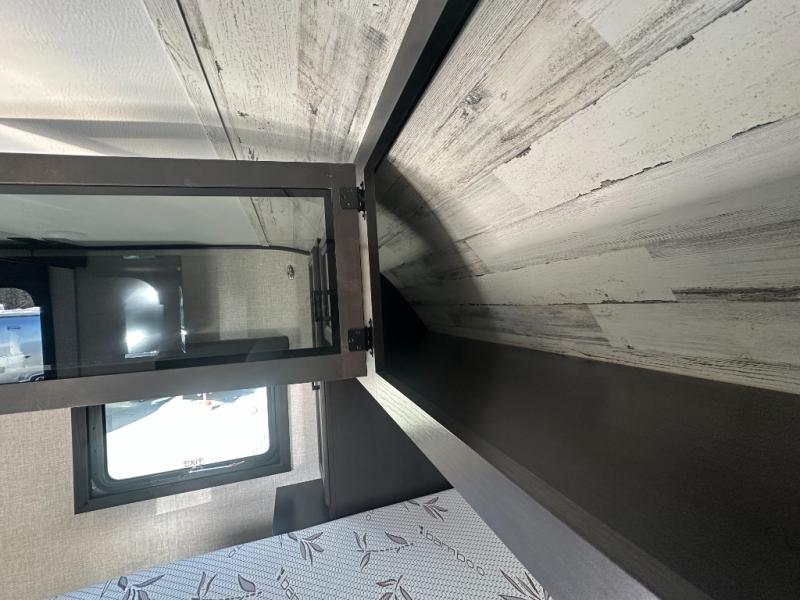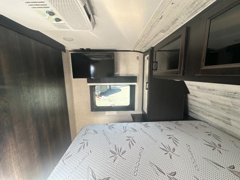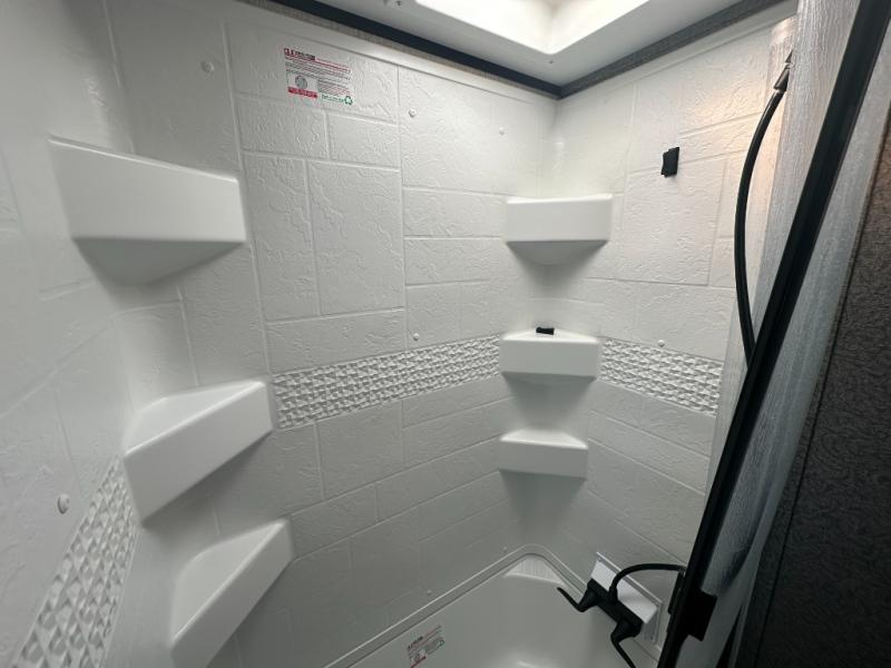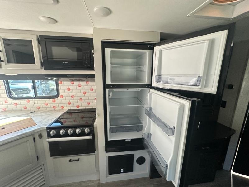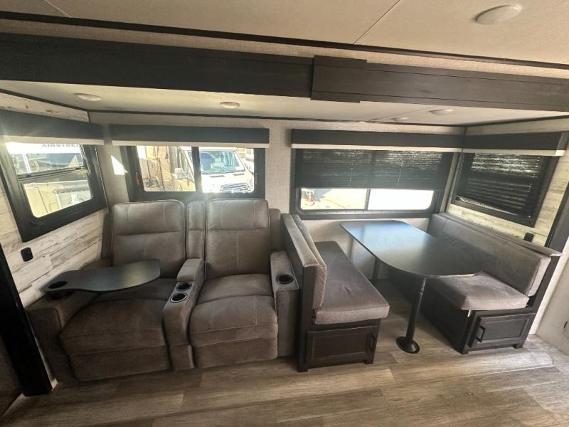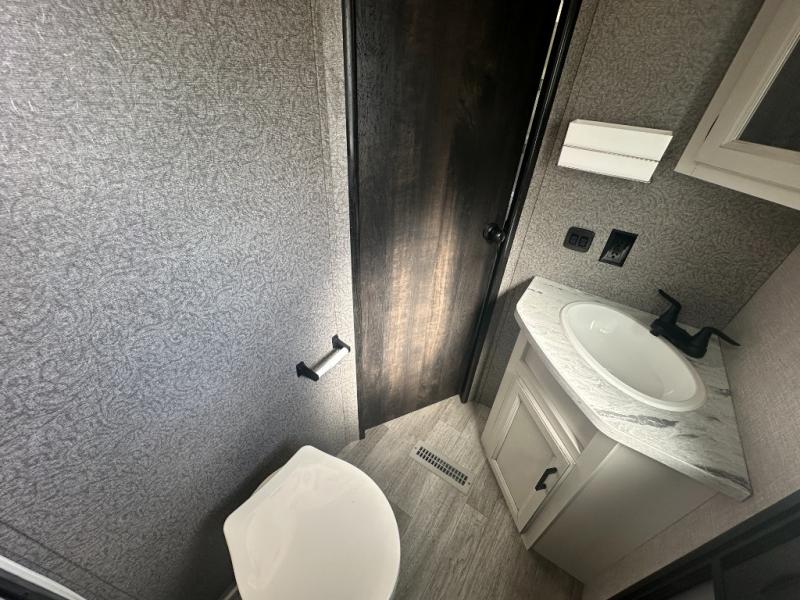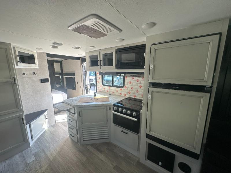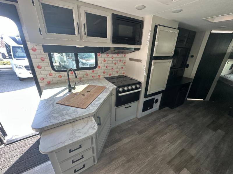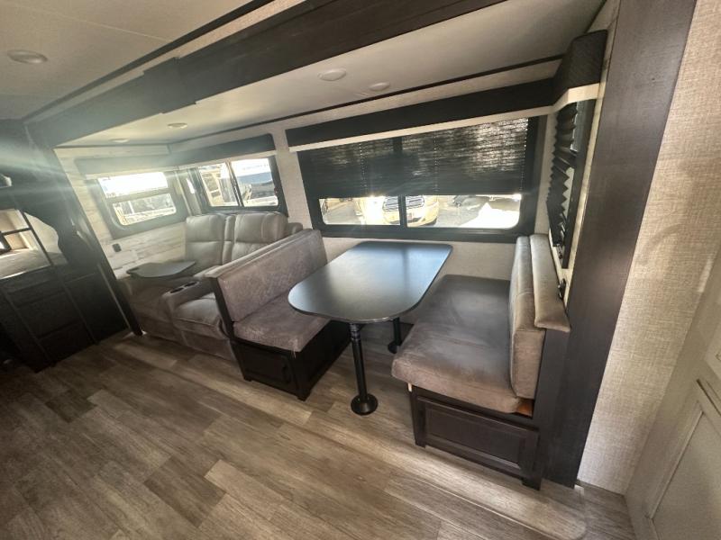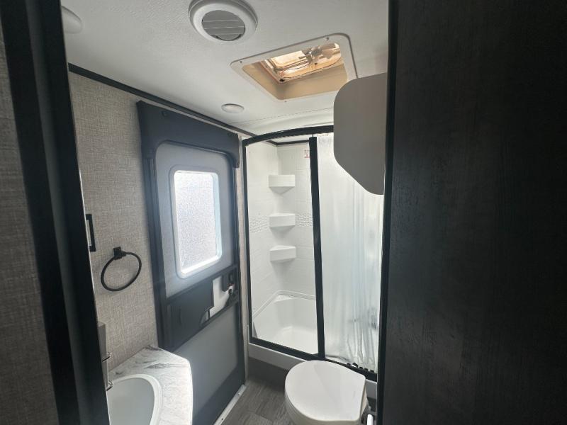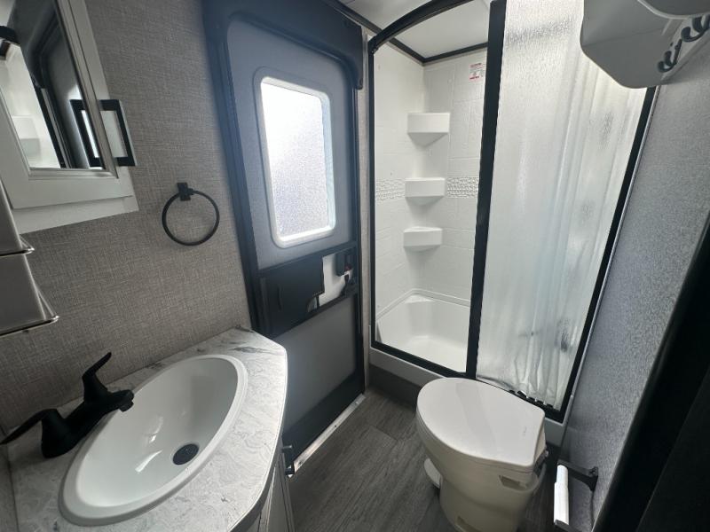 Get out and experience new campgrounds with this spacious trailer that offers a slide out jack knife sofa and booth dinette giving you dining, relaxing and sleeping space as well as more interior floor space to move from the front to the back. The dual entries are a great feature as well when you have eight campers on your trip. And having the second exterior entry/exit to the full bathroom is convenient for all. The cook will love the choice of making meals inside with full amenities or on the outside kitchen when relaxing under the 21' power awning with LED lights. And the front bedroom gives you a queen bed, dual wardrobes and windows for great views when inside. You might like to choose a few options such as theater seating or a tri-fold sofa in place of the jack knife sofa, the 120V heated tank pads for those cooler camping trips, an 8 cu. ft. refrigerator for more cold storage, and/or the Solar Power package if you want to camp off-grid.