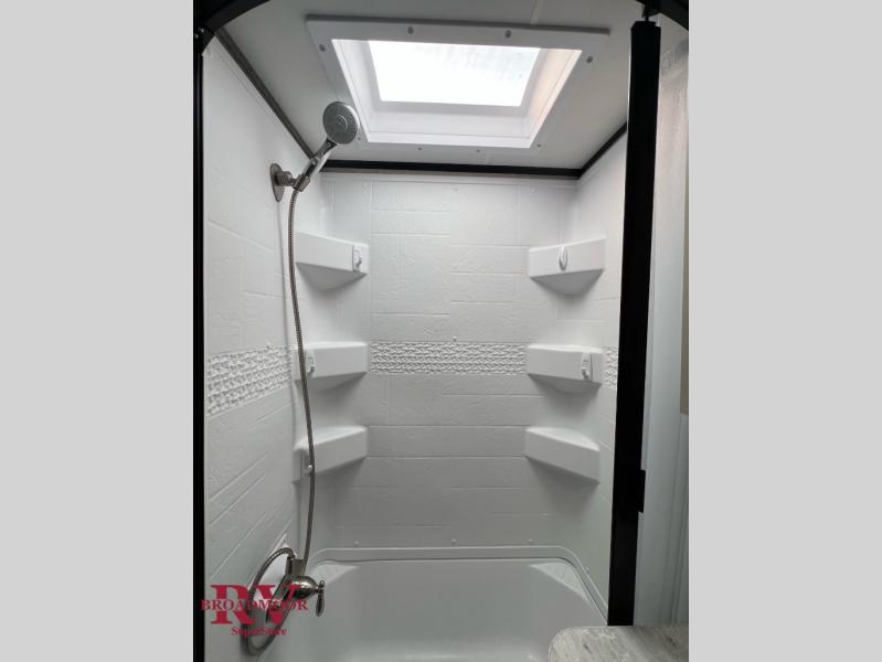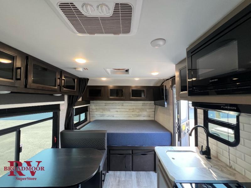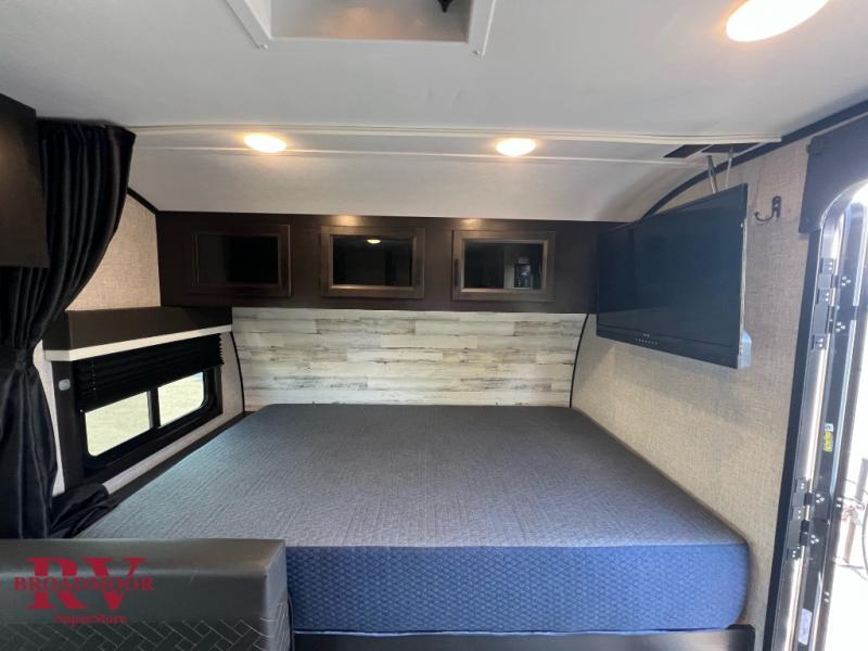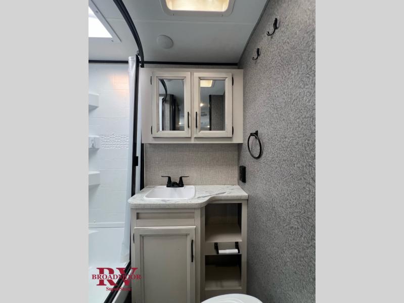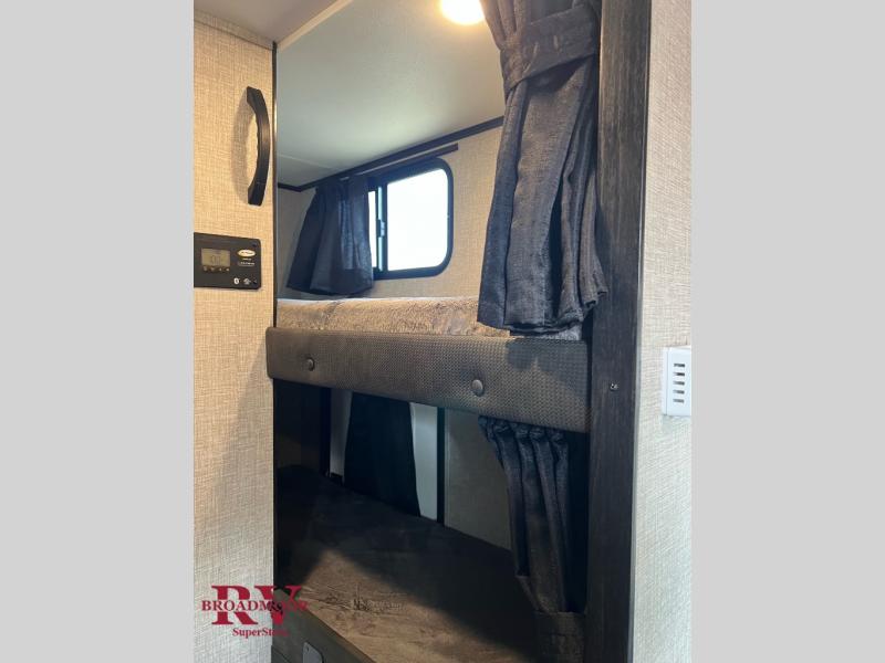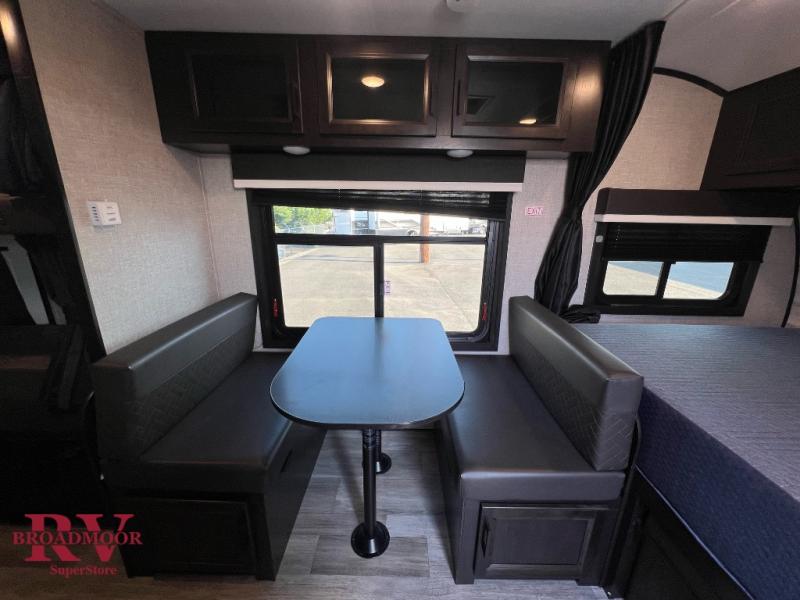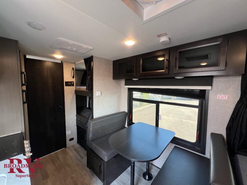 If you've been looking for a lightweight travel trailer with more sleeping space, your search is over with this model! There are bunk beds in the back near the full bath for convenience, a front queen bed, plus a booth dinette that will double as dining and sleeping space. This model also includes overhead compartments for your belongings, plus exterior storage for you fishing poles or tackle boxes.