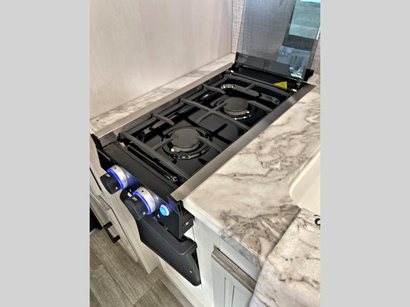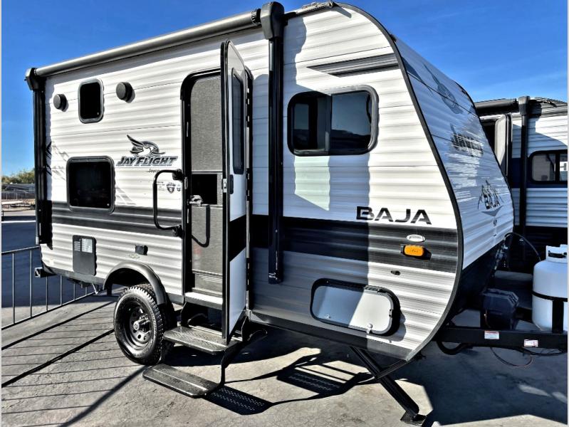 The Jayco Jay Flight SLX 7 travel trailer is quite easy to own because it weighs less than 3,500 pounds, and it comes with a single axle. Built on a fully integrated A-frame with galvanized-steel, impact-resistant wheel wells, the Jay Flight SLX 7 has quality at its very foundation. That quality continues on to the electric self-adjusting brakes, easy-lube hubs, Magnum Truss roof system, friction-hinge entry door with window, and LP quick connect. Some of what the mandatory Customer Value Package includes are two stabilizer jacks with sand pads, American-made Goodyear Endurance tires, Keyed-Alike entry and baggage doors, and JaySMART LED lighting. Buying your trailer in the East versus the West will determine which optional package is available to you. The East offers an optional STX Edition, and the West offers an optional Baja Package. Both packages come with a 30LB LP bottle, a large fresh water tank, Goodyear off-road tires, an enclosed underbelly, a double entry step, four stabilizer jacks, and a deluxe graphics package. Specific to the STX Edition, you will find a wide-stance axle, aluminum rims, a power tongue jack, and powder-coated wheel fenders while the Baja Package offers you a flipped axle and black sidewall skirt.