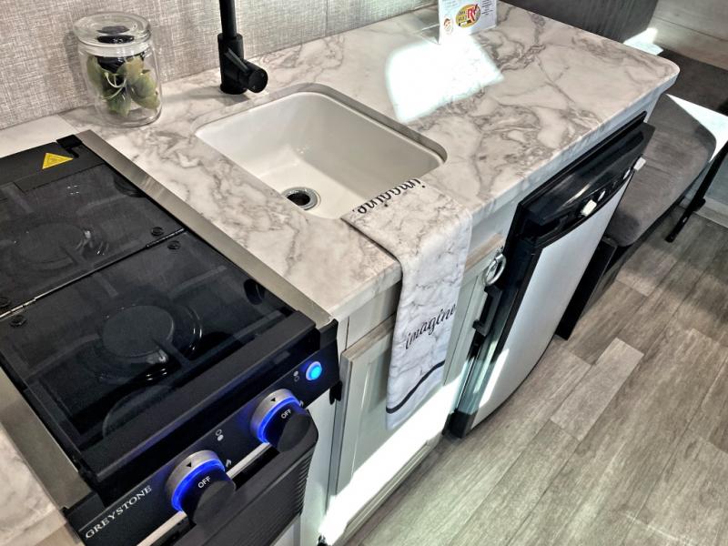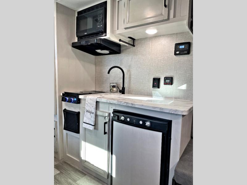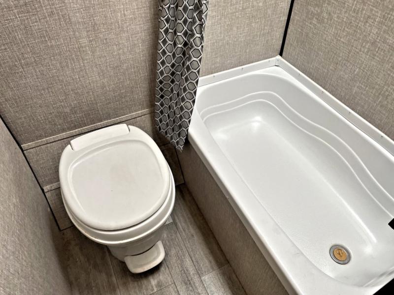 You can spend more time enjoying your surroundings and less time hassling with your RV when you take this Jay Flight SLX 7 travel trailer out to the campsite! There is a set of 29" x 75" bunk beds that will allow you to sleep two people without taking up extra floor space, and the booth dinette can transition from a table into a bed in order to accommodate one other person. The private bathroom includes a tub/shower and toilet so that you don't even need to use the campsite's facilities. A 3-cubic foot refrigerator will store all of your fresh items, and the two-burner range will help you turn those items into a full meal. As soon as you enter this trailer, there is a wardrobe to your left, so you can keep some belongings easily accessible.