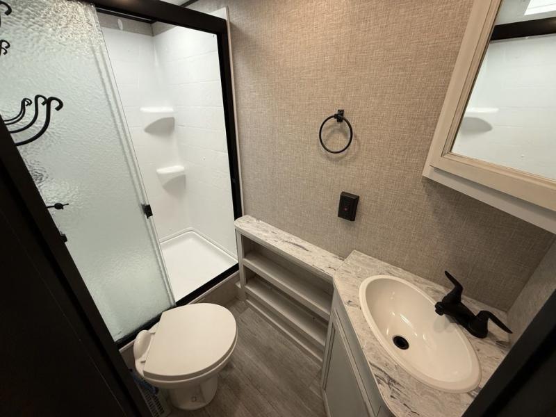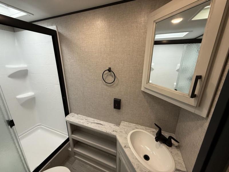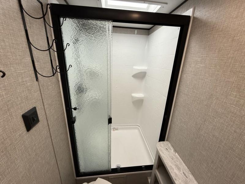 A lot of fun can be had in this Jay Flight travel trailer! There are double-size bunks to add to the sleeping capacity without taking up too much interior space, and the jackknife sofa is a handy piece of furniture that serves as a lounge area and a bed. The queen-size bed is hidden away in the private bedroom, and the bedroom also contains the second exterior entry door for you to come and go as you please. A large slide makes the main living area spacious, so you can work freely in the kitchen without standing on top of those who are sitting on the furniture. As the chef, you can also choose to just work outside at the outdoor kitchen if that suits you better.
