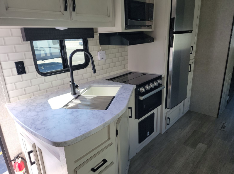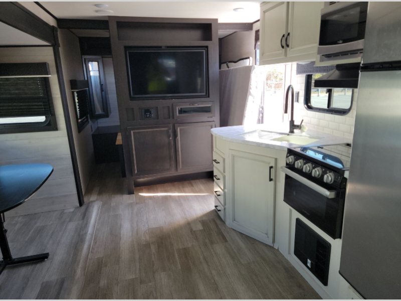 This Jay Flight travel trailer has two private sleeping areas, a private bedroom up front and a private bunkhouse in the back. The bunkhouse even has a slide out for some added space. Two entry doors get you into this trailer quickly from the front or back, and you will also have two kitchens on this unit, one inside and one outside. The entertainment center makes nighttime movie watching easy, and you can always heat up a snack quickly in the microwave. The bathroom skylight will bring in more sunlight as you get ready, and the tub/shower will help you get clean.
