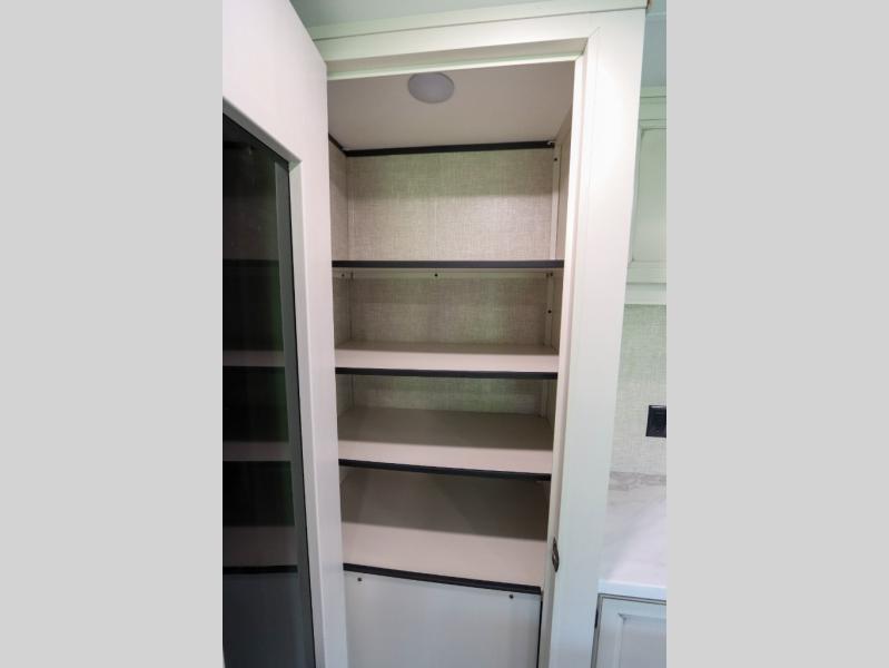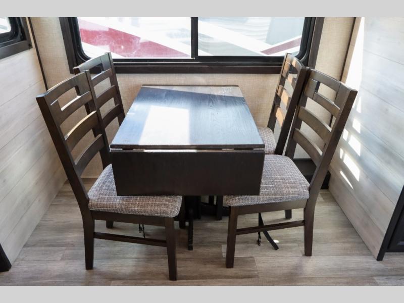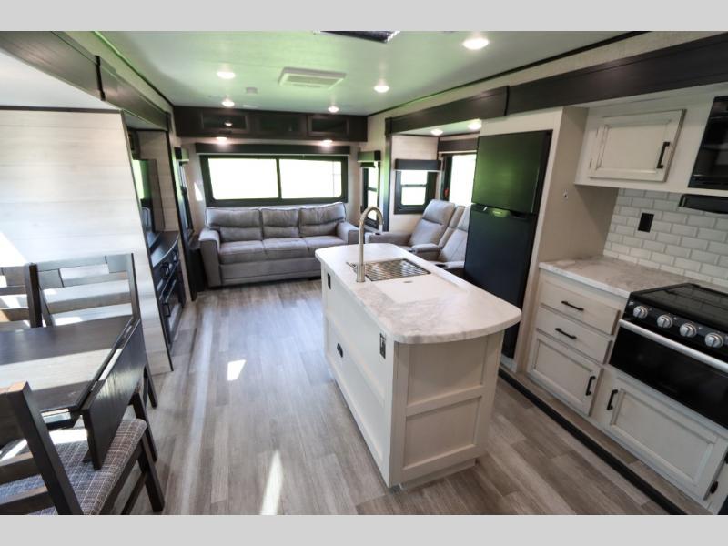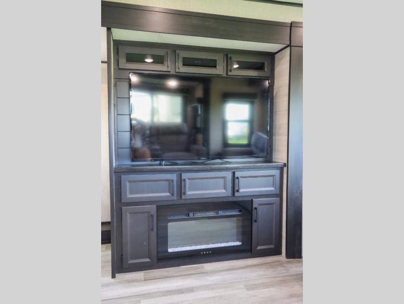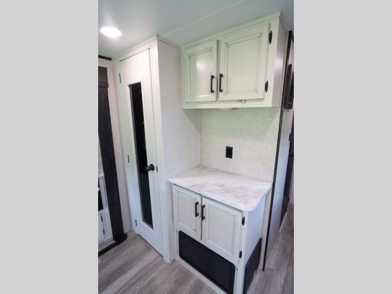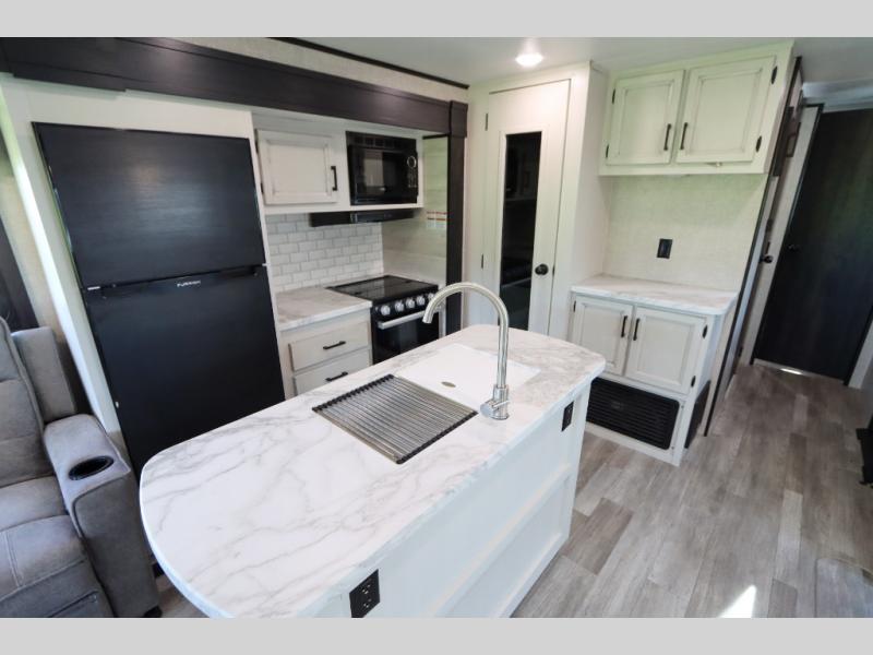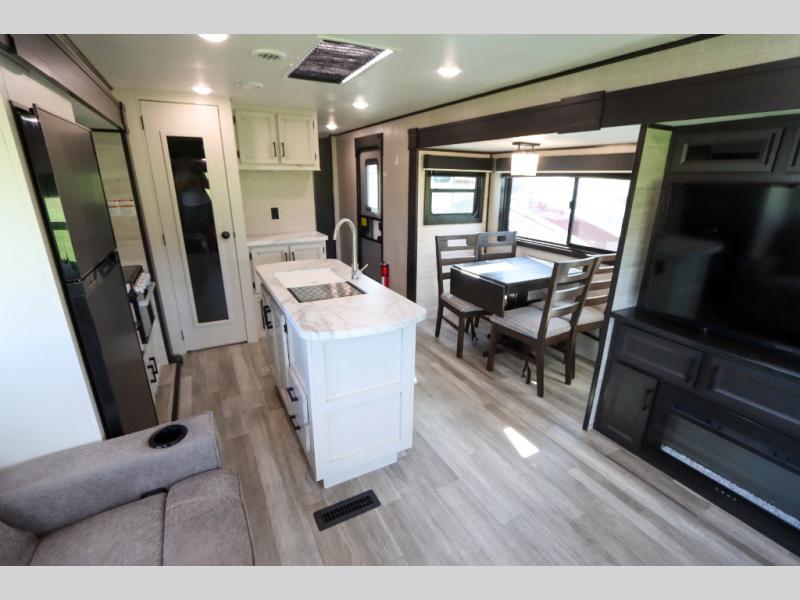 When you travel in the fall or winter, the fireplace on this Jay Flight travel trailer is going to be your favorite feature! It sits below the entertainment center, and both items are across from the theater seating. You'll also have a jackknife sofa right there so that others can join in on the relaxation. A kitchen island adds function to the kitchen, and it also serves as a great dishwashing station. You can cook just about anything on the three-burner range, and the pantry will help you store your snacks. The free-standing table with chairs makes meal time feel like it does at home, and the dual-entry bathroom can be accessed from the main hallway or the front bedroom.