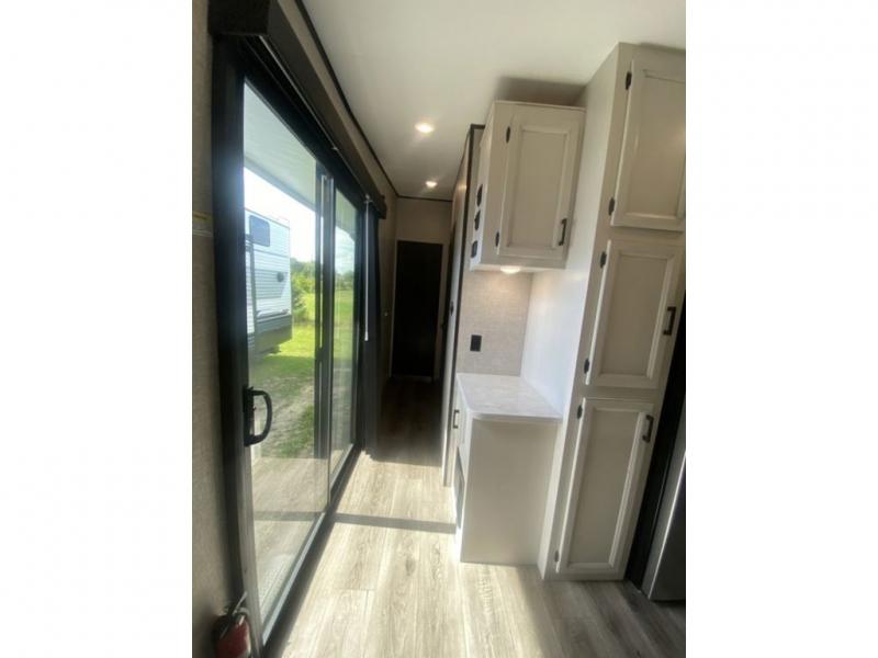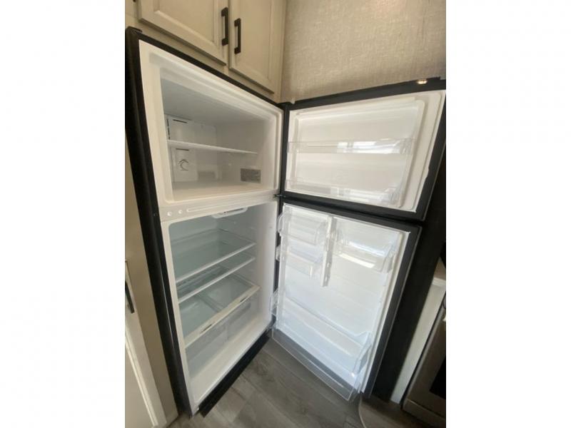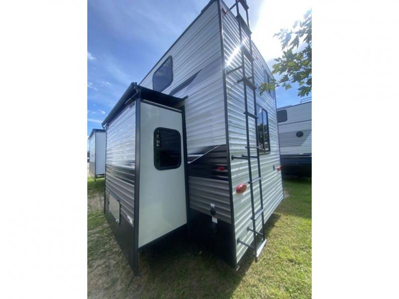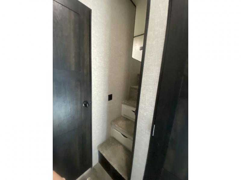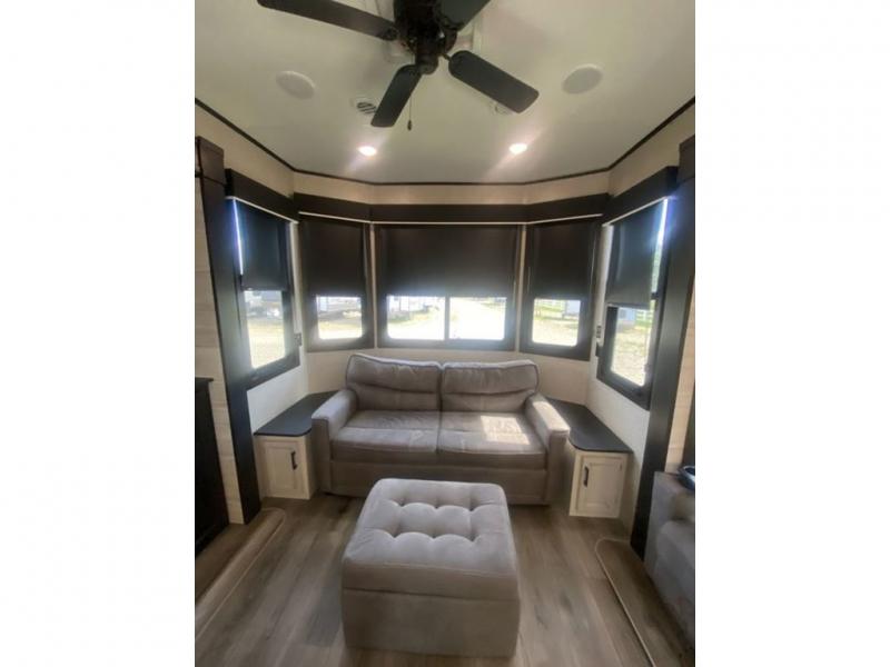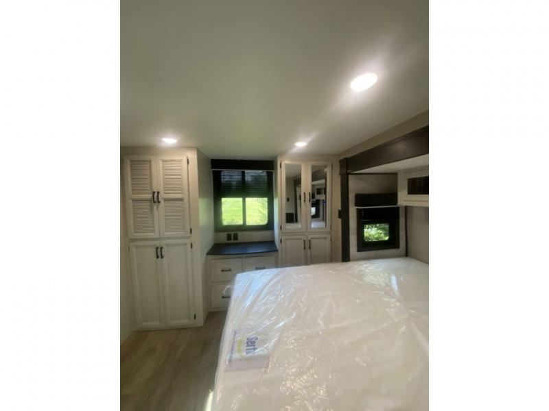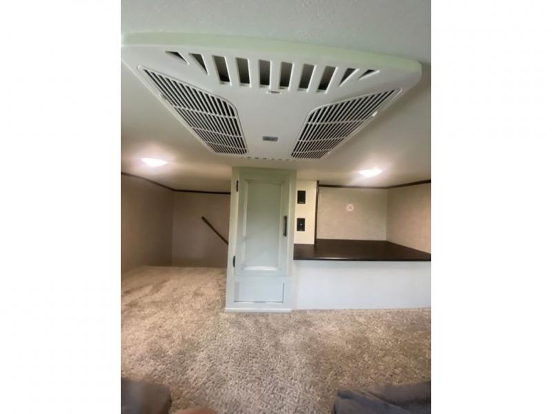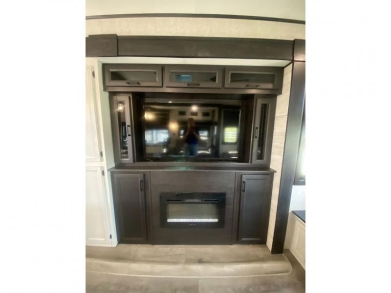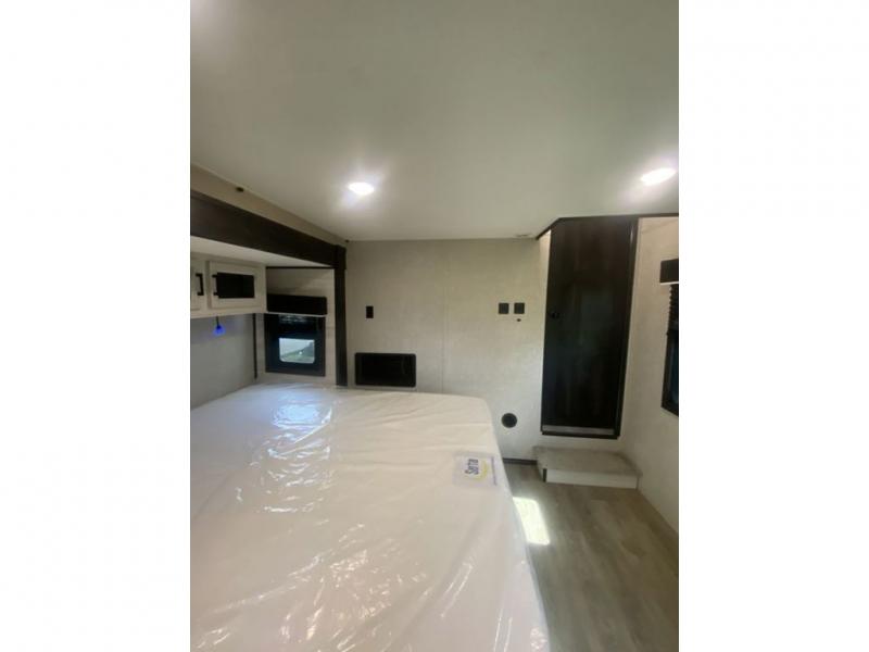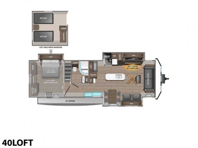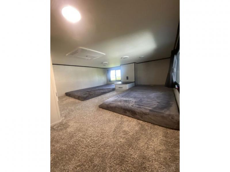 You will love every minute spent in this front living travel trailer. Your crew can get comfortable on the tri-fold sofa with an ottoman by the fireplace, and watch a movie on the TV. The chef of your group can prepare dinner on the four burner cooktop, and the free-standing table will be perfect to dine at. Your guests or grandkids will love the loft with two bed mats and a wardrobe for their clothes, and the full bath on the main floor will allow everyone to stay clean throughout your trip. This model also includes a rear private bedroom with a queen bed slide out, plenty of storage space, plus its own exterior entry door. How convenient!