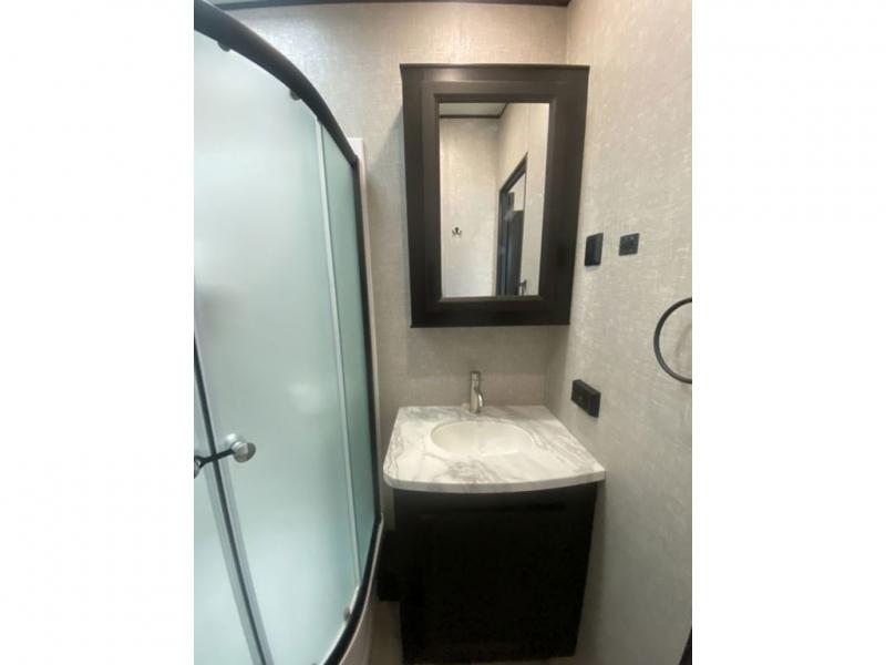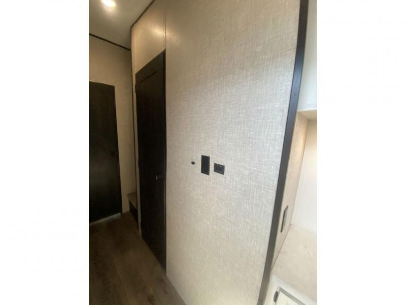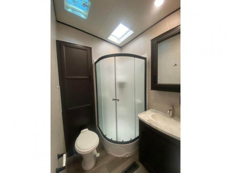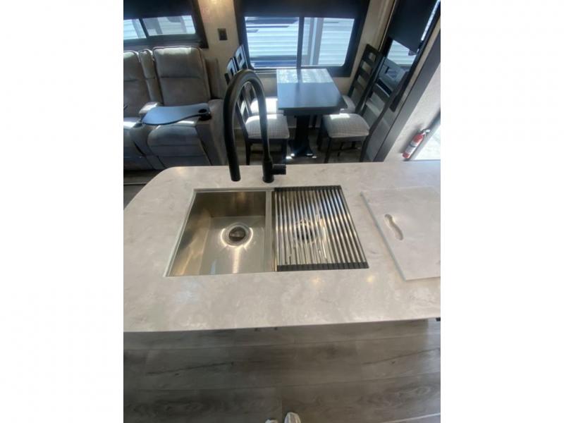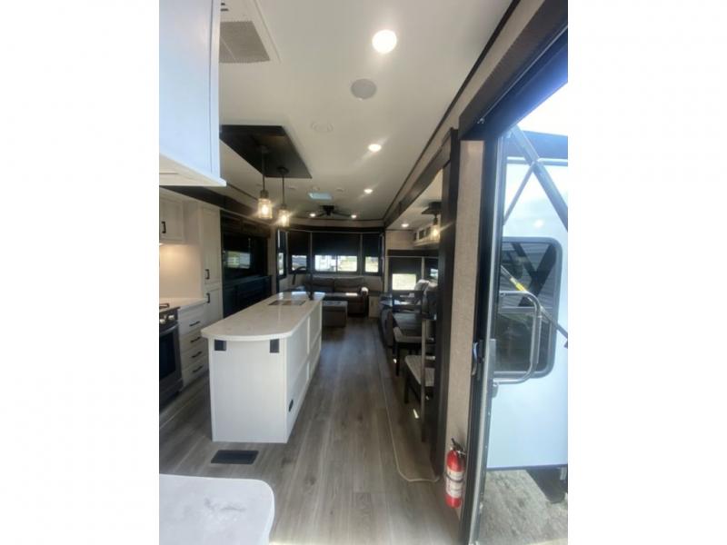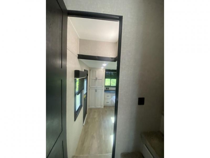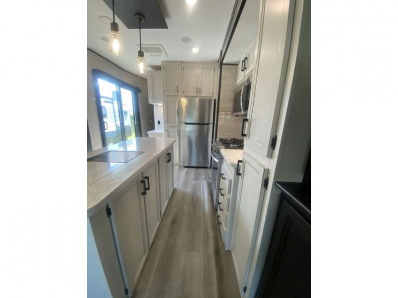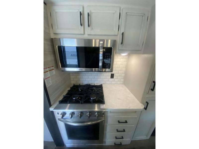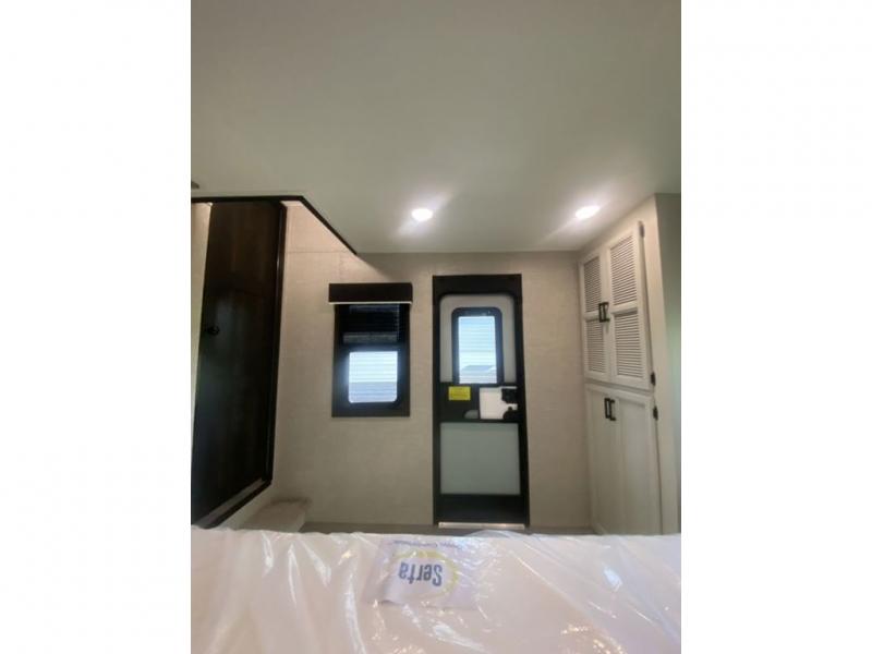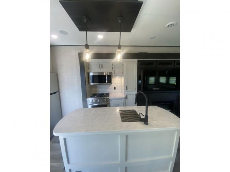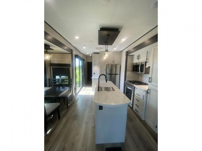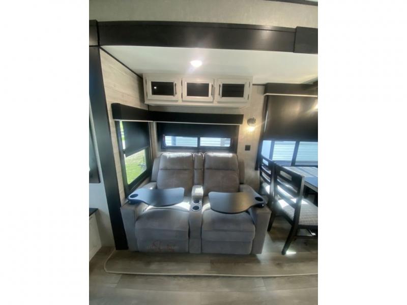 You will love every minute spent in this front living travel trailer. Your crew can get comfortable on the tri-fold sofa with an ottoman by the fireplace, and watch a movie on the TV. The chef of your group can prepare dinner on the four burner cooktop, and the free-standing table will be perfect to dine at. Your guests or grandkids will love the loft with two bed mats and a wardrobe for their clothes, and the full bath on the main floor will allow everyone to stay clean throughout your trip. This model also includes a rear private bedroom with a queen bed slide out, plenty of storage space, plus its own exterior entry door. How convenient!