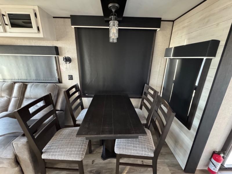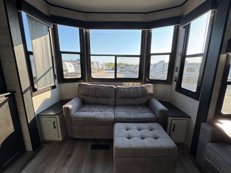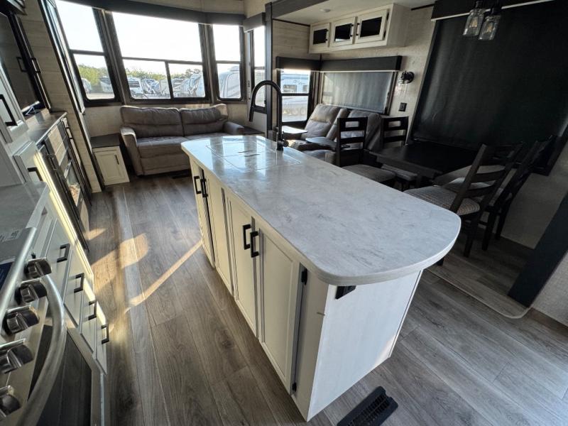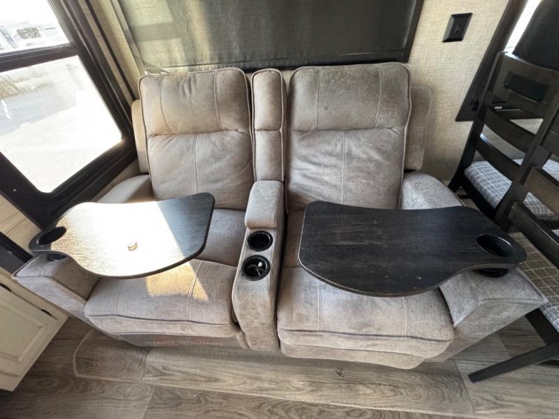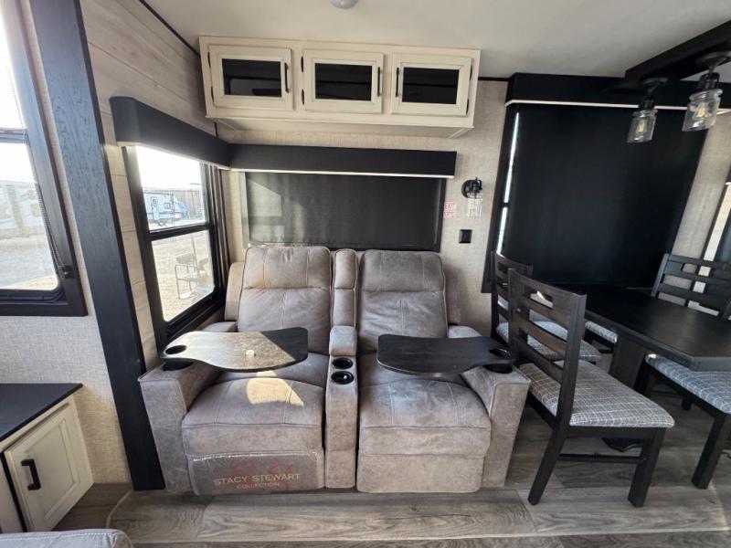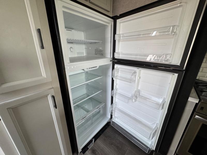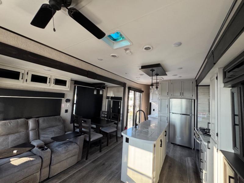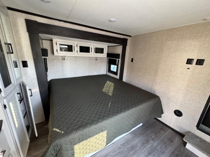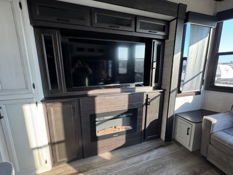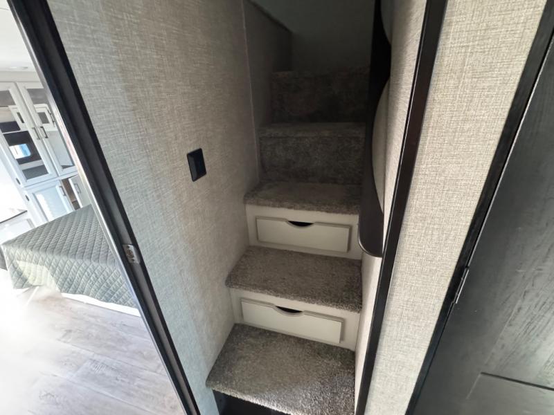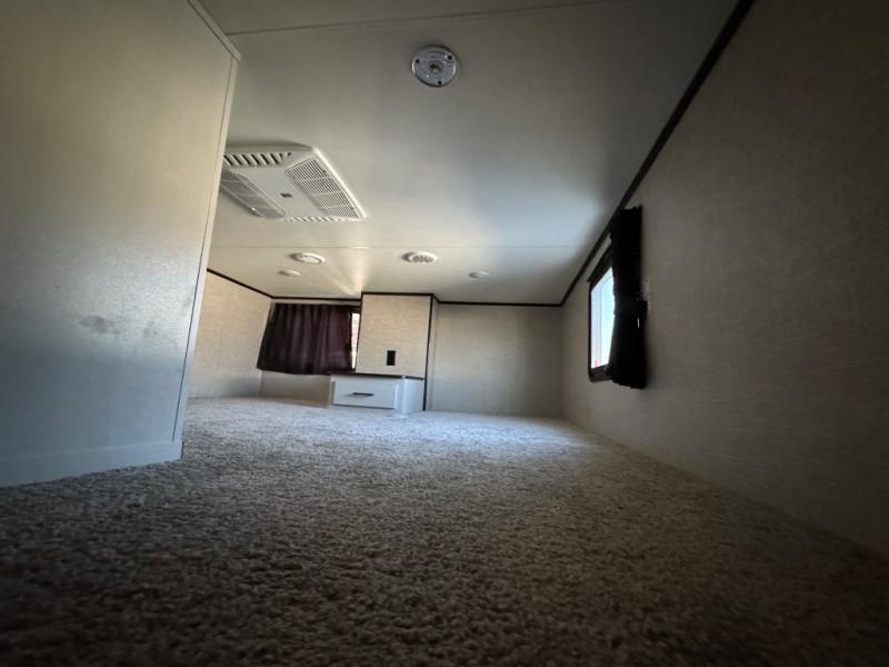 You will love every minute spent in this front living travel trailer. Your crew can get comfortable on the tri-fold sofa with an ottoman by the fireplace, and watch a movie on the TV. The chef of your group can prepare dinner on the four burner cooktop, and the free-standing table will be perfect to dine at. Your guests or grandkids will love the loft with two bed mats and a wardrobe for their clothes, and the full bath on the main floor will allow everyone to stay clean throughout your trip. This model also includes a rear private bedroom with a queen bed slide out, plenty of storage space, plus its own exterior entry door. How convenient!