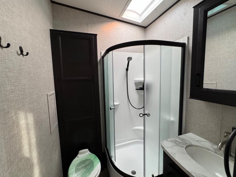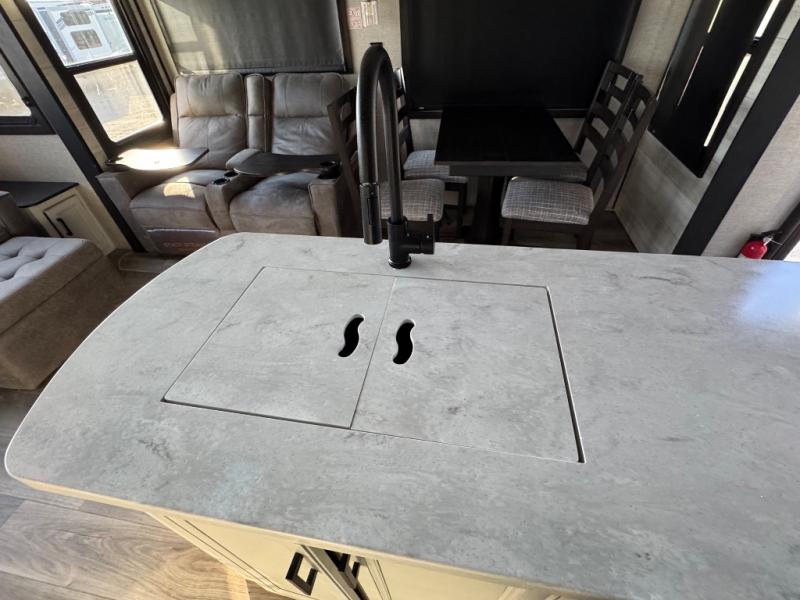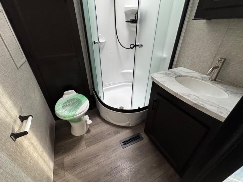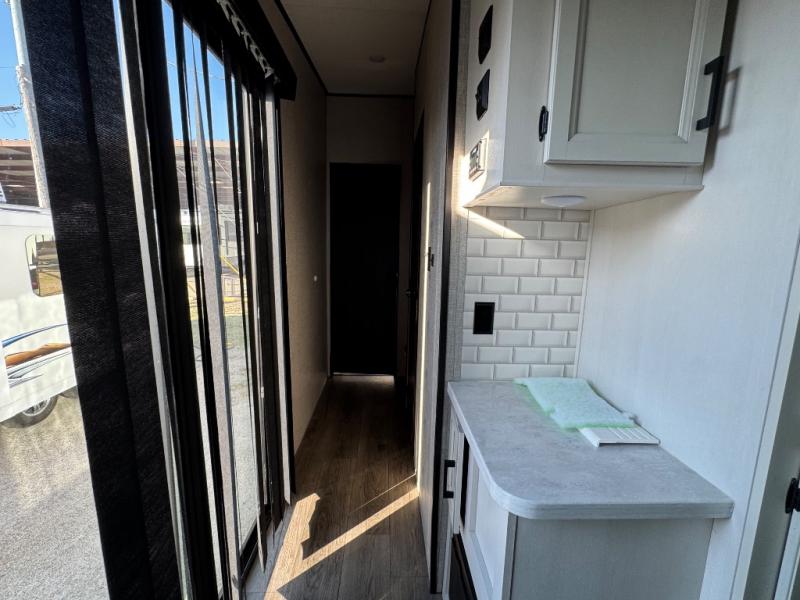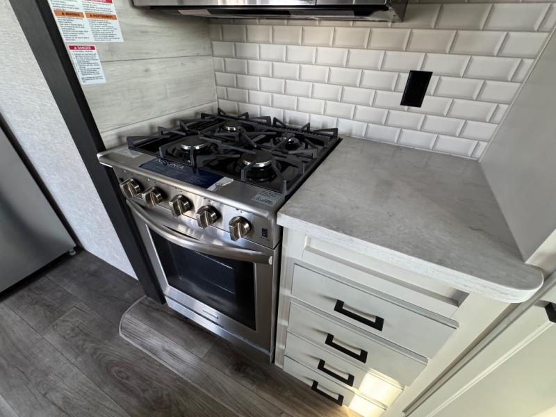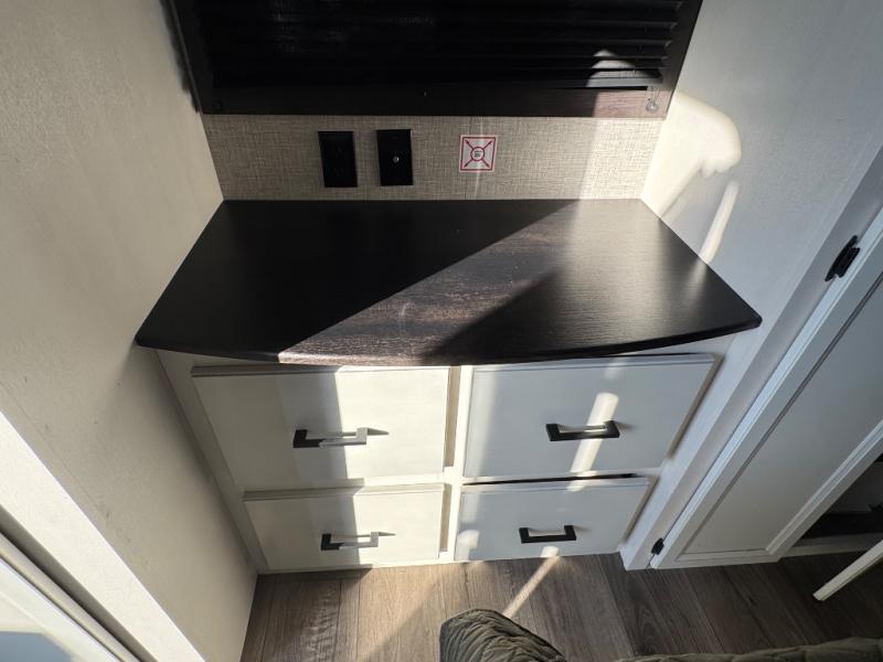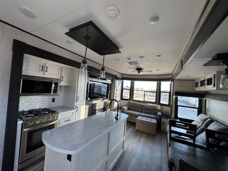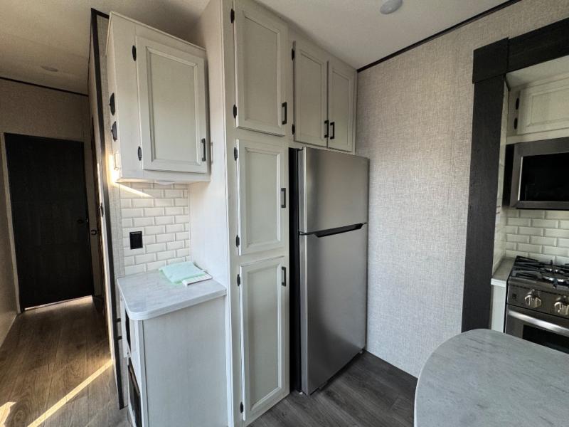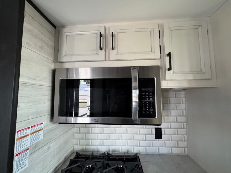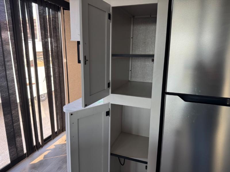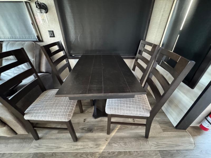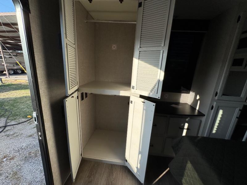 You will love every minute spent in this front living travel trailer. Your crew can get comfortable on the tri-fold sofa with an ottoman by the fireplace, and watch a movie on the TV. The chef of your group can prepare dinner on the four burner cooktop, and the free-standing table will be perfect to dine at. Your guests or grandkids will love the loft with two bed mats and a wardrobe for their clothes, and the full bath on the main floor will allow everyone to stay clean throughout your trip. This model also includes a rear private bedroom with a queen bed slide out, plenty of storage space, plus its own exterior entry door. How convenient!