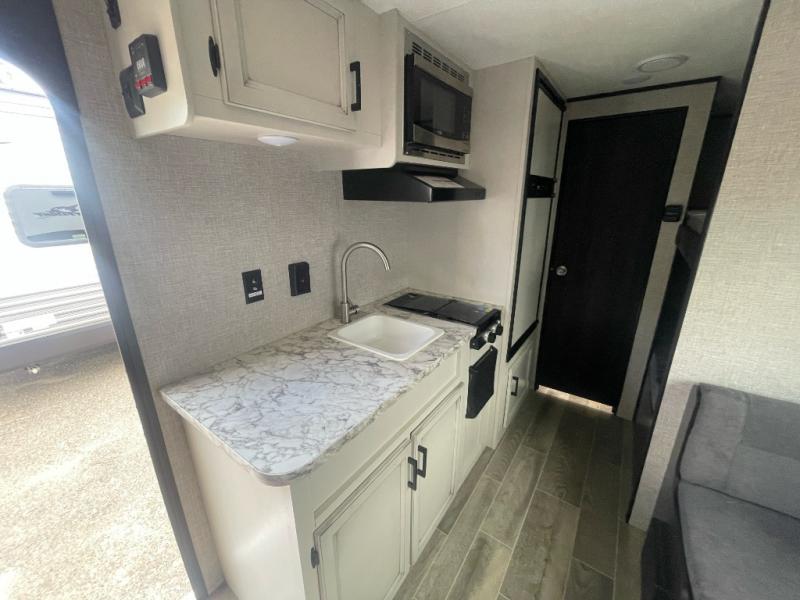 This Jay Flight SLX 7 travel trailer offers you a queen-size bed for sleeping at night, and there is even a privacy curtain that you can draw to separate the bed from the rest of the trailer too. The 29" x 75" bunk beds are another sleeping location, and you can even create a bed for one more person by transforming the booth dinette. Overhead cabinets will help you keep your belongings organized, and the kitchen has a two-burner range, 6-cubic foot refrigerator, residential-style countertops, microwave oven, and a high-rise faucet at the sink to help you prepare meals.