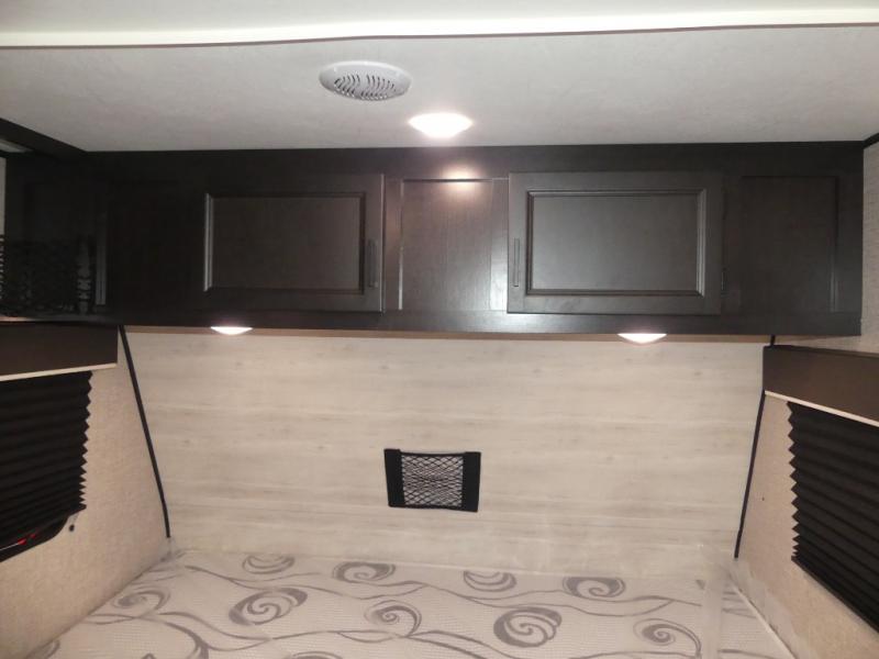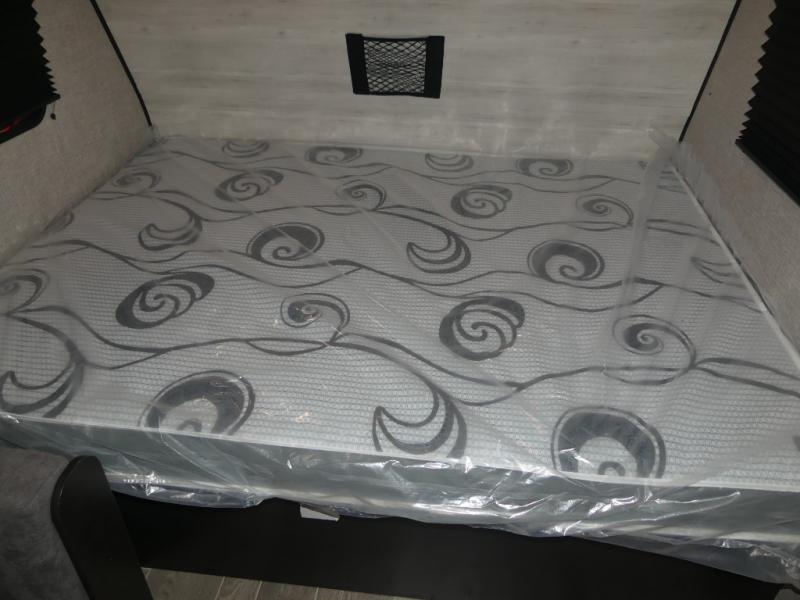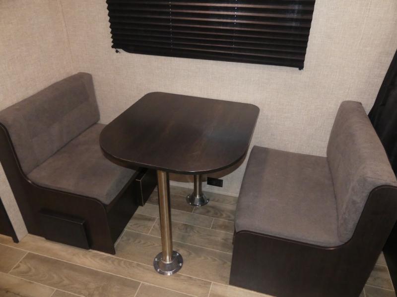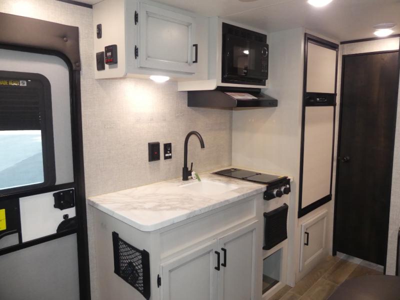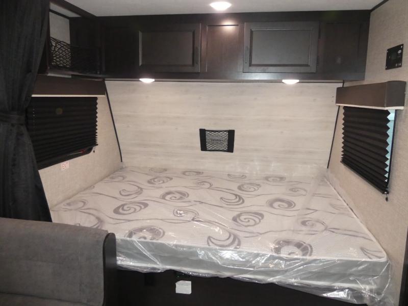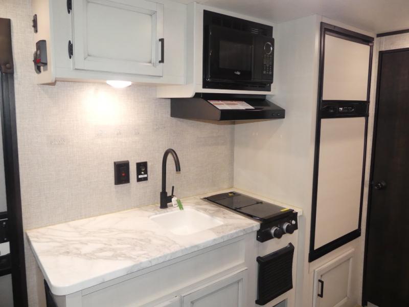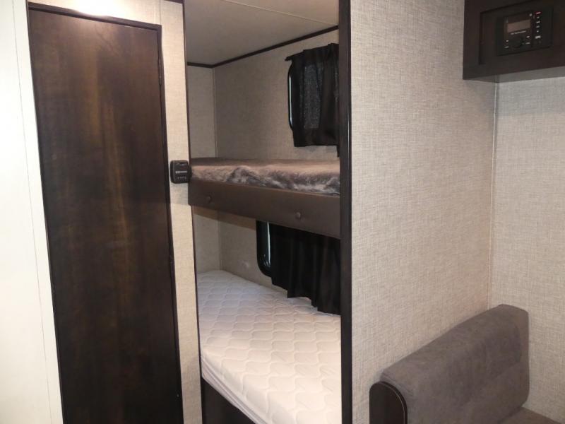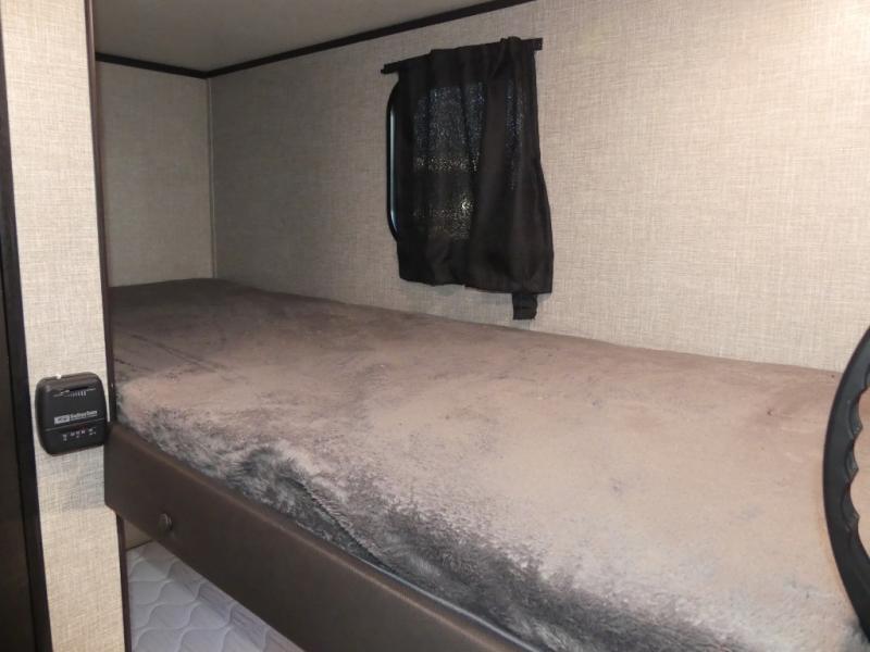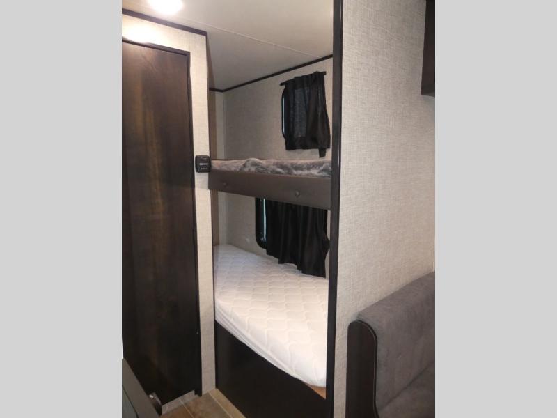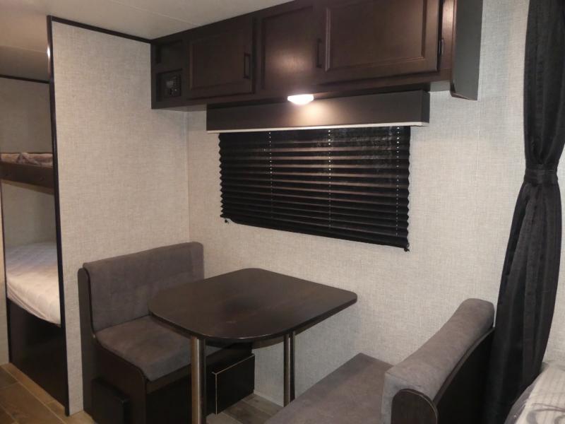 This Jay Flight SLX 7 travel trailer offers you a queen-size bed for sleeping at night, and there is even a privacy curtain that you can draw to separate the bed from the rest of the trailer too. The 29" x 75" bunk beds are another sleeping location, and you can even create a bed for one more person by transforming the booth dinette. Overhead cabinets will help you keep your belongings organized, and the kitchen has a two-burner range, 6-cubic foot refrigerator, residential-style countertops, microwave oven, and a high-rise faucet at the sink to help you prepare meals.