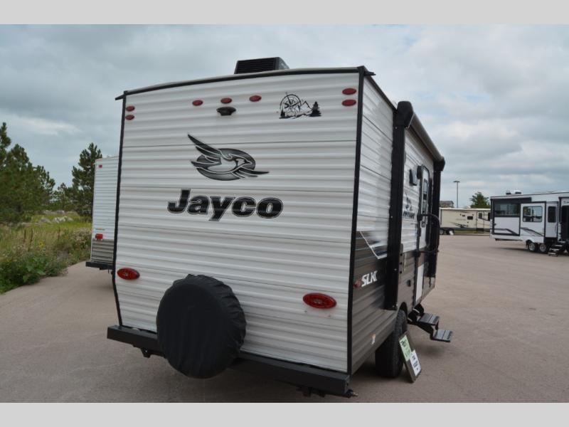 The Jayco Jay Flight SLX 7 travel trailer is quite easy to own because it weighs less than 3,500 pounds, and it comes with a single axle. Built on a fully integrated A-frame with galvanized-steel, impact-resistant wheel wells, the Jay Flight SLX 7 has quality at its very foundation. That quality continues on to the electric self-adjusting brakes, easy-lube hubs, Magnum Truss roof system, friction-hinge entry door with window, and LP quick connect. Some of what the mandatory Customer Value Package includes are two stabilizer jacks with sand pads, American-made Goodyear Endurance tires, Keyed-Alike entry and baggage doors, and JaySMART LED lighting. Buying your trailer in the East versus the West will determine which optional package is available to you. The East offers an optional STX Edition, and the West offers an optional Baja Package. Both packages come with a 30LB LP bottle, a large fresh water tank, Goodyear off-road tires, an enclosed underbelly, a double entry step, four stabilizer jacks, and a deluxe graphics package. Specific to the STX Edition, you will find a wide-stance axle, aluminum rims, a power tongue jack, and powder-coated wheel fenders while the Baja Package offers you a flipped axle and black sidewall skirt.