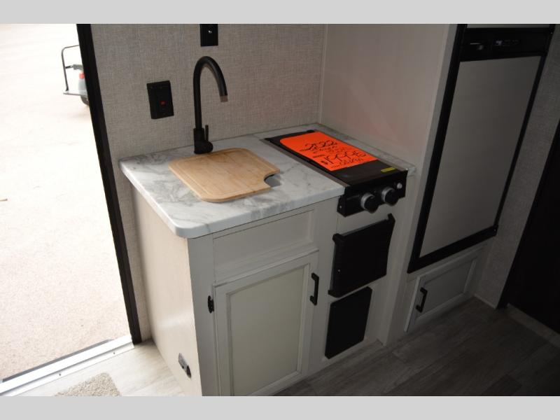 You and your two favorite people can take this Jay Flight SLX 7 travel trailer out for some fun! There is an RV queen bed up at the front, and there are also overhead cabinets and a wardrobe next to the bed for easy storage. The wall-mounted 8,000 BTU air conditioner is right next to the bed, and there is a privacy curtain that you can draw to create a semi-private bedroom. The booth dinette rests on a single slide, so there is more floor space as you work in the kitchen. The rear bathroom gives you space and privacy, and it also offers you a linen closet to store your towels. For other storing needs, you can use the 6-cubic foot refrigerator and the exterior storage compartments.