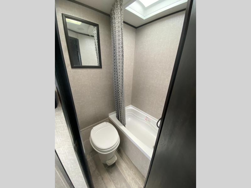 Gain some freedom to travel with this Jay Flight SLX 7 travel trailer! You can rest comfortably each night on an RV queen bed that can be sectioned off into a semi-private bedroom with a privacy curtain. There is a private bathroom with a tub/shower and toilet so that you can stay clean, and the kitchen has a two-burner range to keep you fed. Outside, there is a 10' power awning to protect you from too much sun, and you can also store extra gear in the exterior storage compartment.
