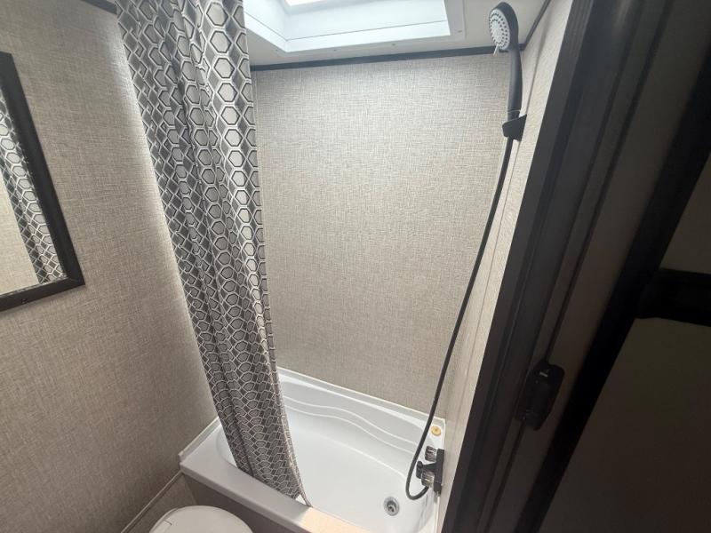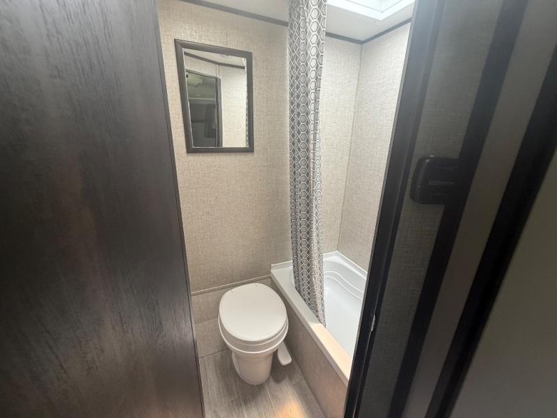 Gain some freedom to travel with this Jay Flight SLX 7 travel trailer! You can rest comfortably each night on an RV queen bed that can be sectioned off into a semi-private bedroom with a privacy curtain. There is a private bathroom with a tub/shower and toilet so that you can stay clean, and the kitchen has a two-burner range to keep you fed. Outside, there is a 10' power awning to protect you from too much sun, and you can also store extra gear in the exterior storage compartment.