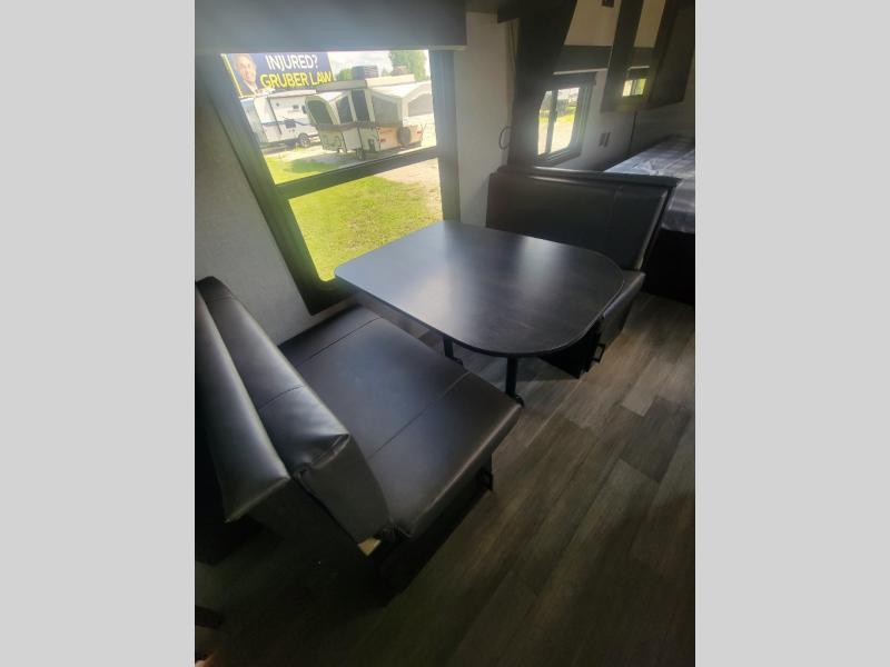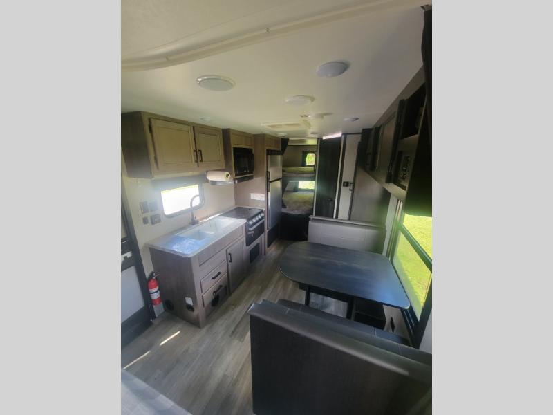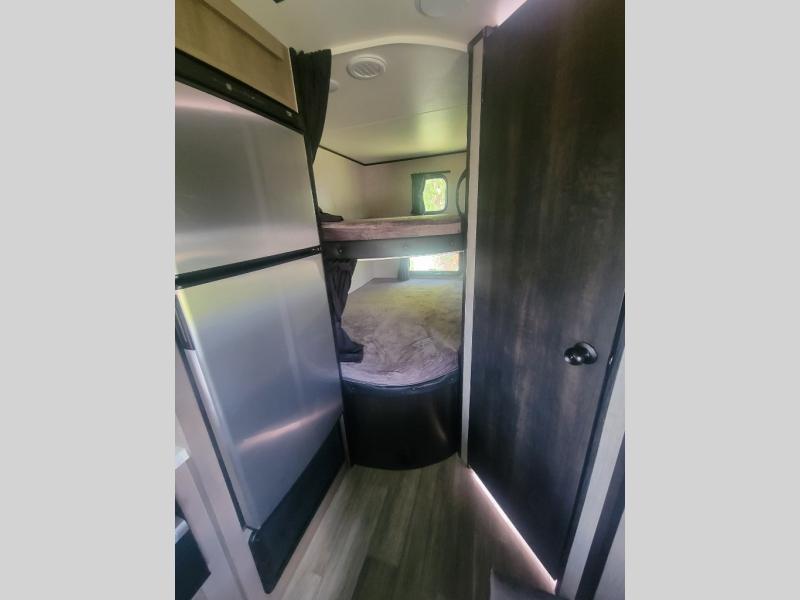 Get ready for family fun or a friend's weekend at the campgrounds in this trailer! This trailer offers full kitchen amenities including a pantry for snacks and such, plus a full rear corner bathroom for privacy and includes a shower. When you need a break, the semi-private bedroom up front offers a queen bed, dual wardrobes and a curtain to close, and the double size bunks offer a curtain to close as well. There is a 13' power awing with LED lights for you to enjoy this outdoor space into the night, plus exterior storage for your outdoor games and gear.