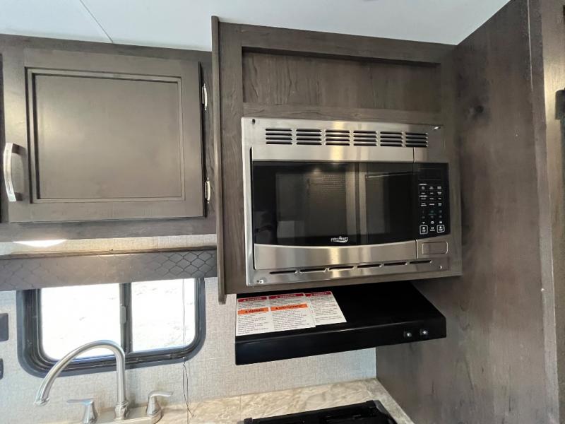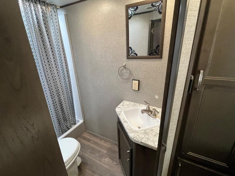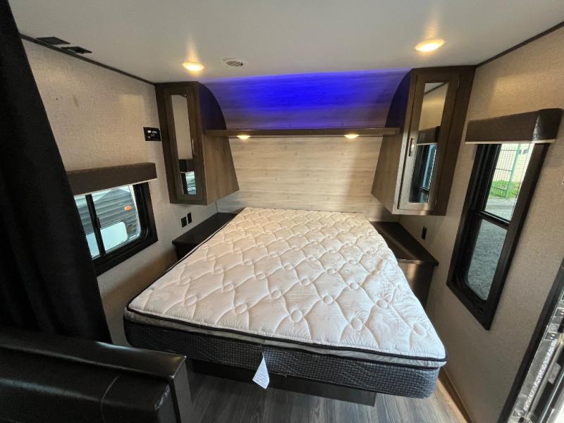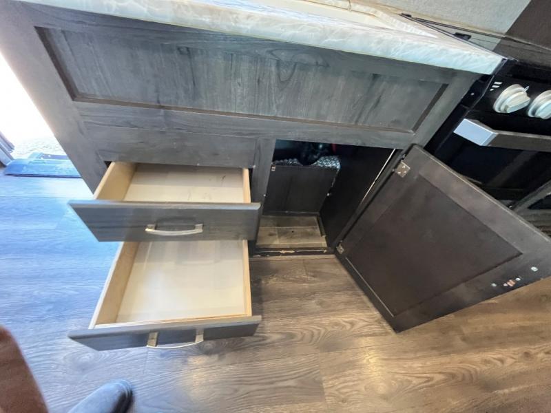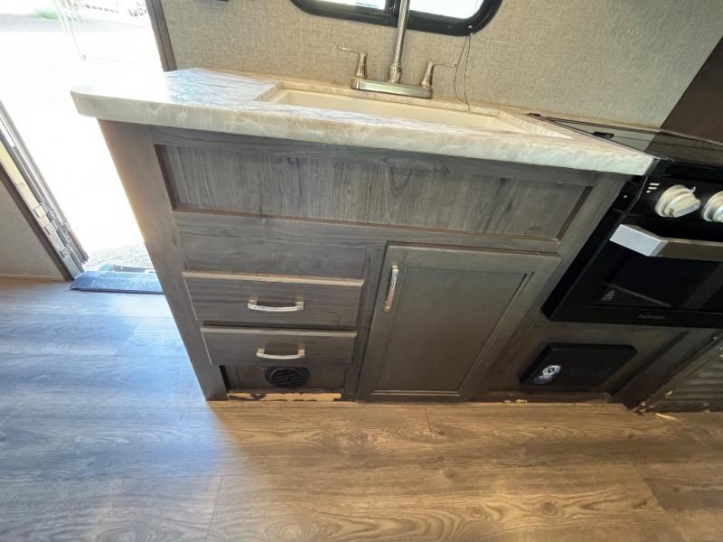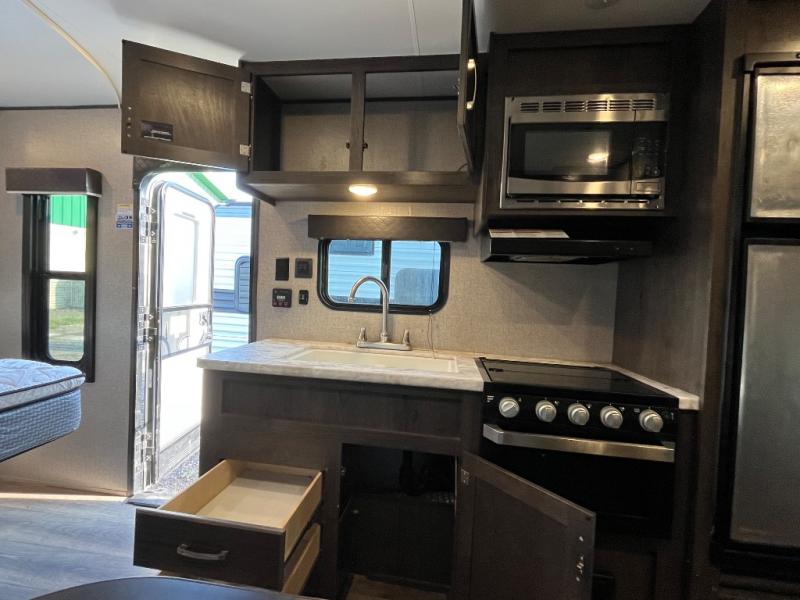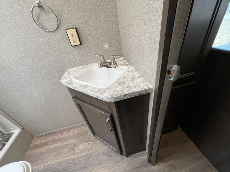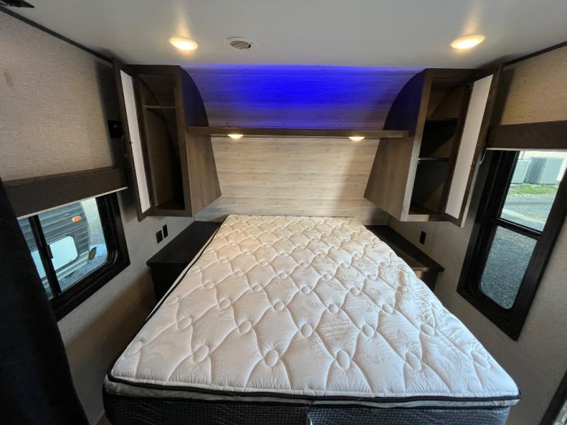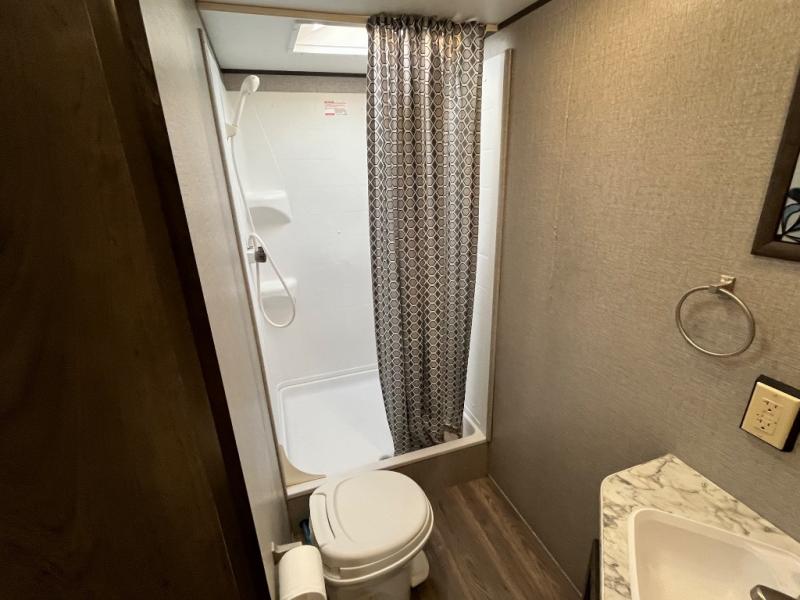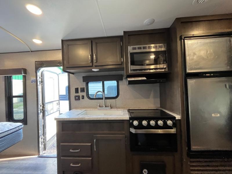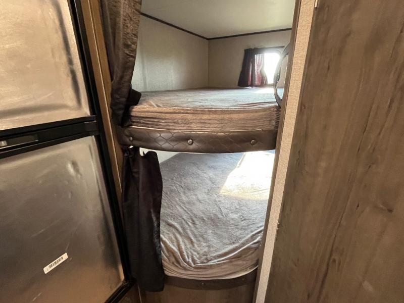 Get ready for family fun or a friend's weekend at the campgrounds in this trailer! This trailer offers full kitchen amenities including a pantry for snacks and such, plus a full rear corner bathroom for privacy and includes a shower. When you need a break, the semi-private bedroom up front offers a queen bed, dual wardrobes and a curtain to close, and the double size bunks offer a curtain to close as well. There is a 13' power awing with LED lights for you to enjoy this outdoor space into the night, plus exterior storage for your outdoor games and gear.
