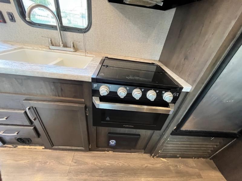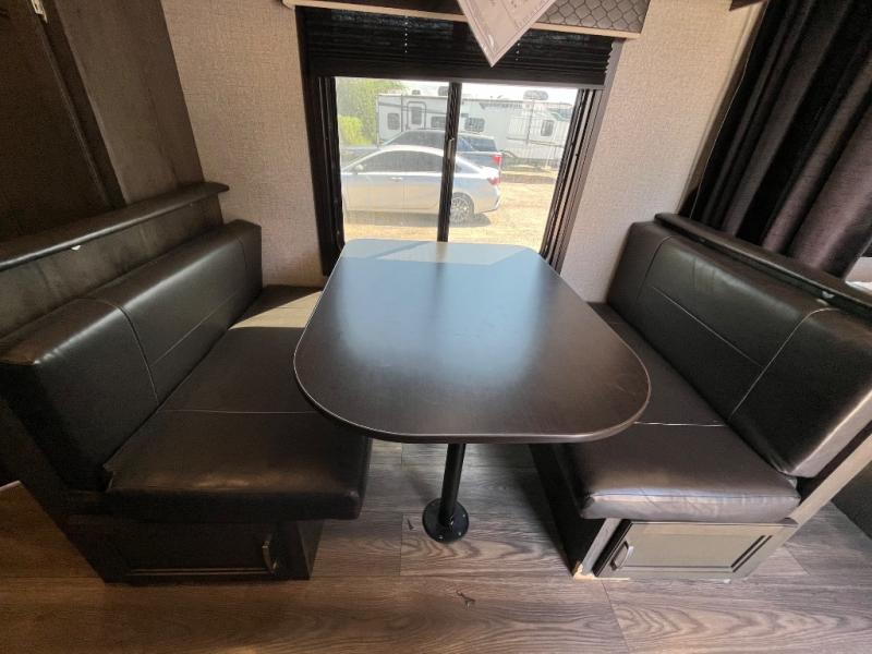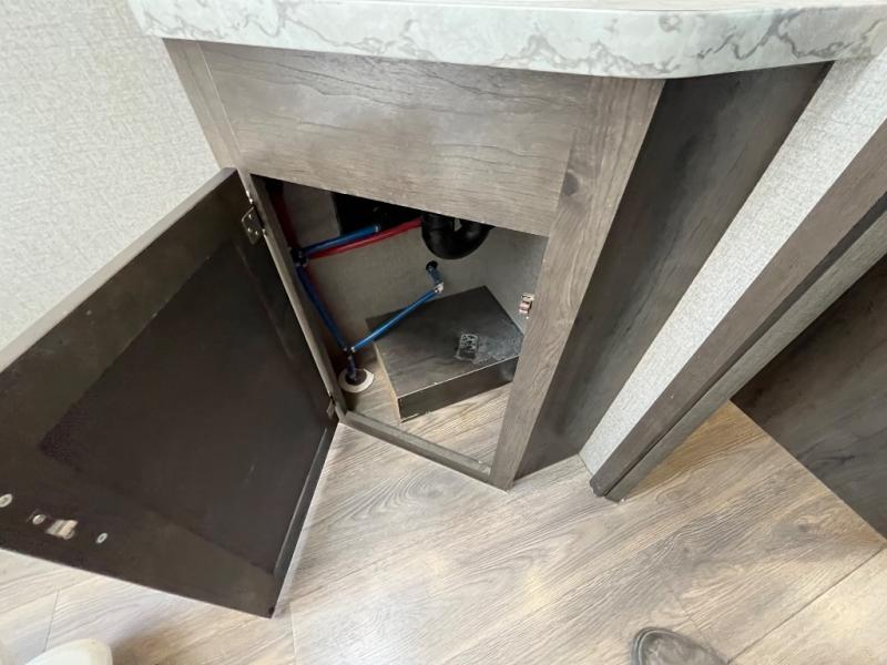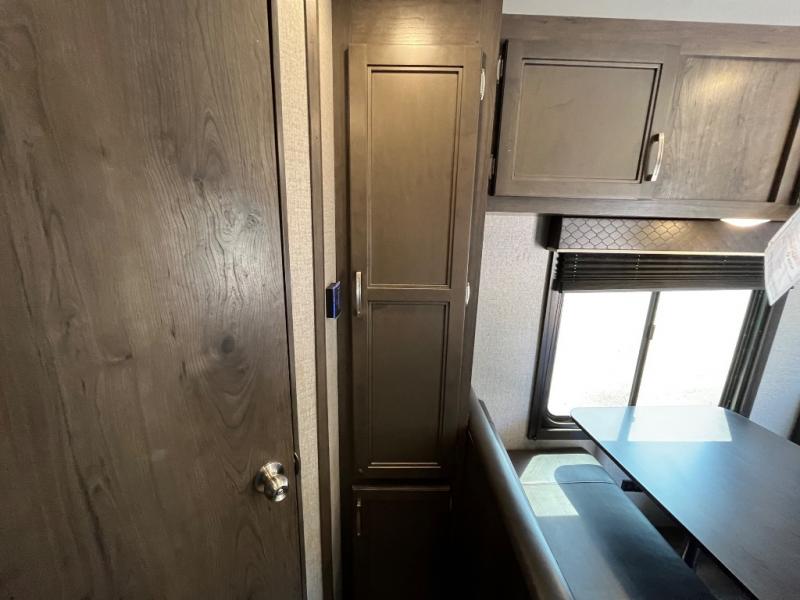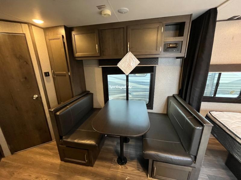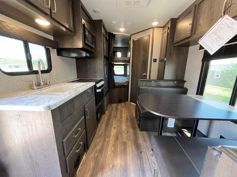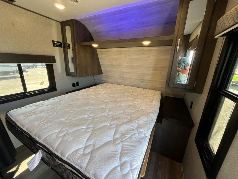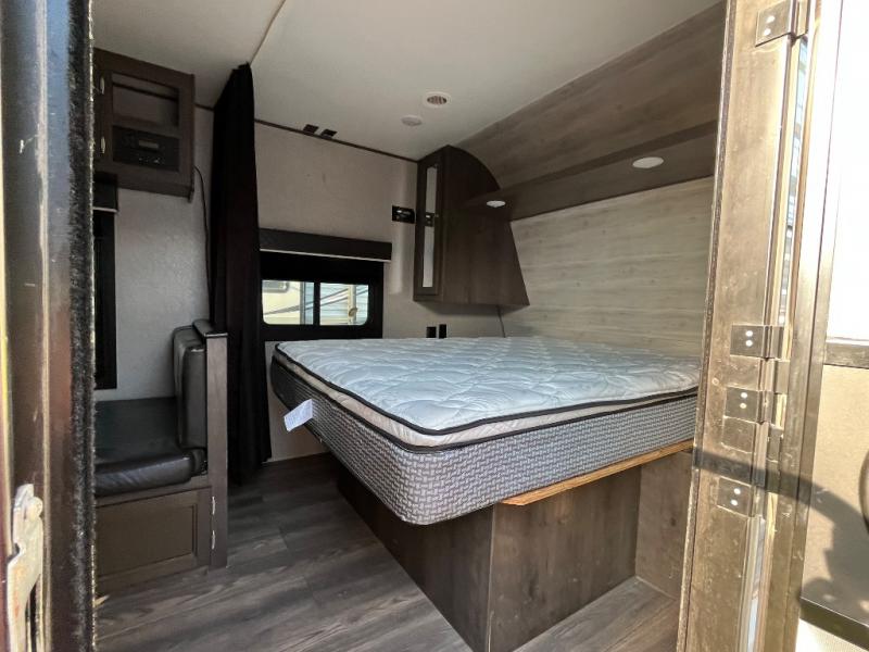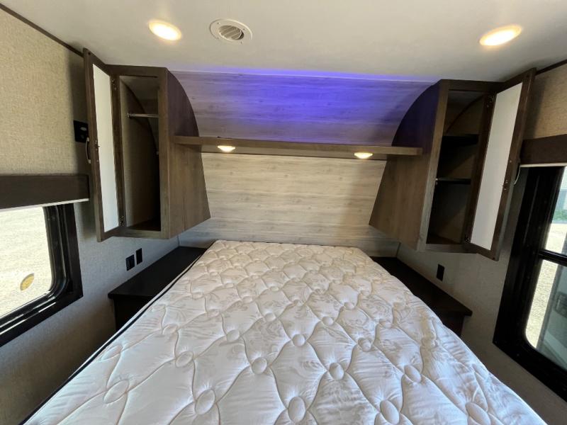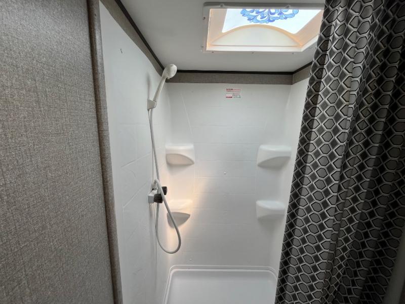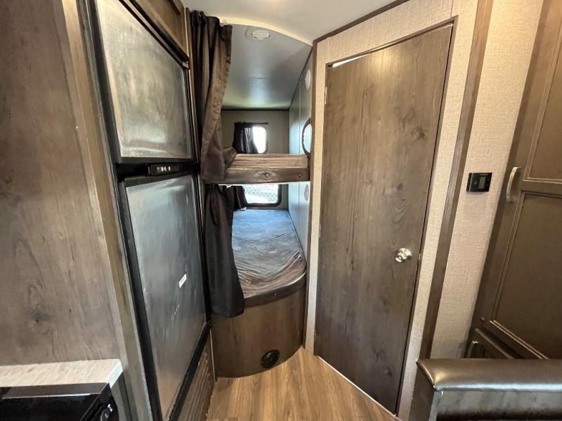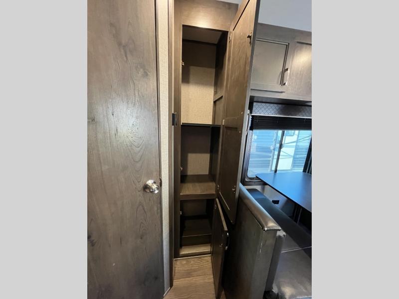 Get ready for family fun or a friend's weekend at the campgrounds in this trailer! This trailer offers full kitchen amenities including a pantry for snacks and such, plus a full rear corner bathroom for privacy and includes a shower. When you need a break, the semi-private bedroom up front offers a queen bed, dual wardrobes and a curtain to close, and the double size bunks offer a curtain to close as well. There is a 13' power awing with LED lights for you to enjoy this outdoor space into the night, plus exterior storage for your outdoor games and gear.
