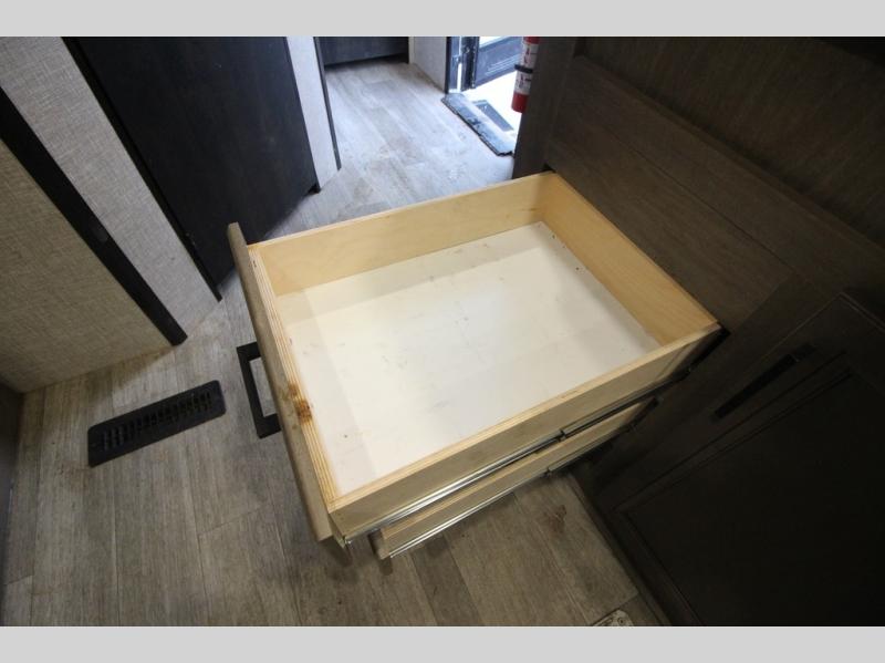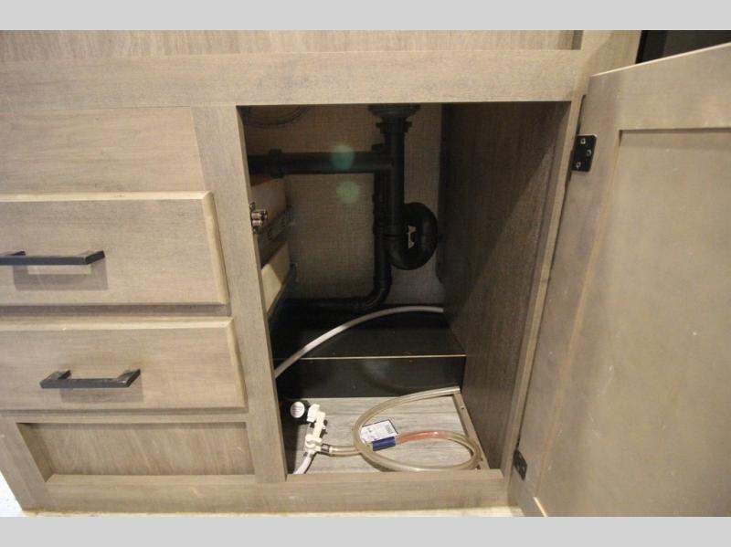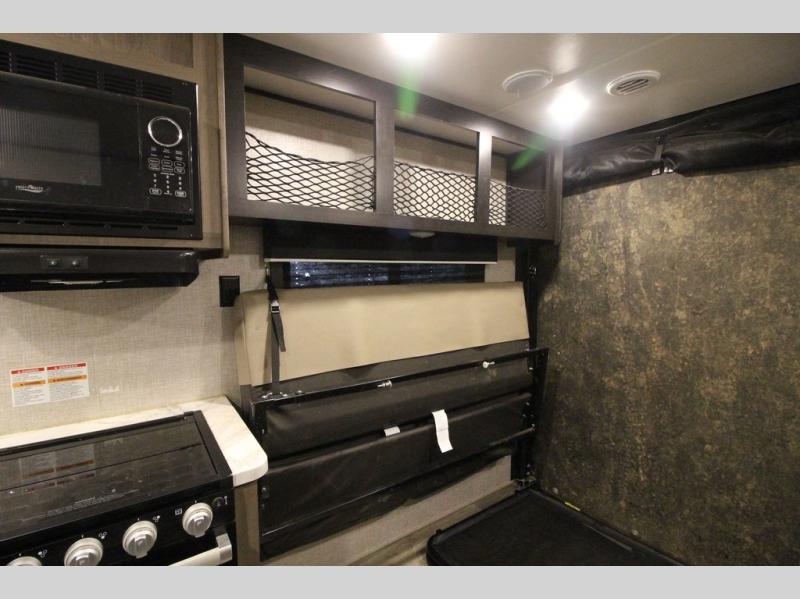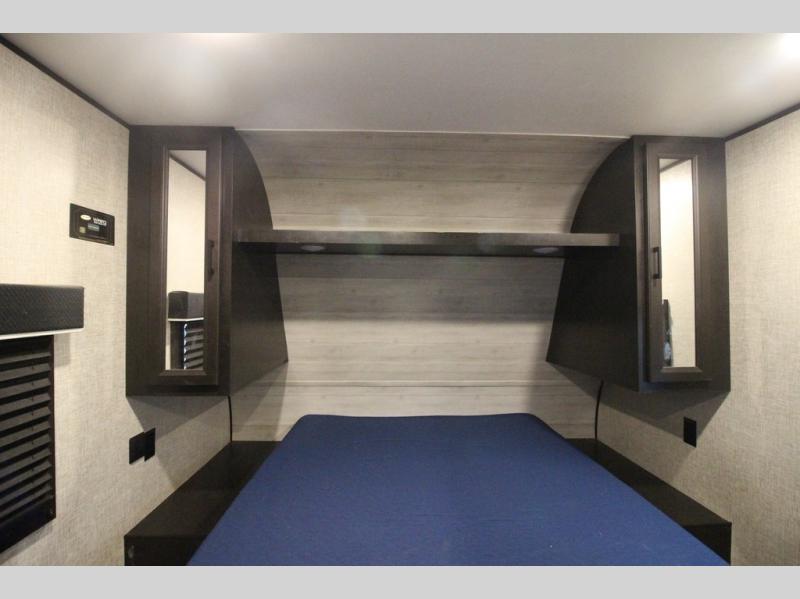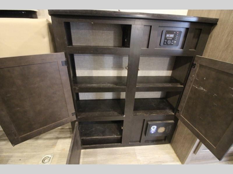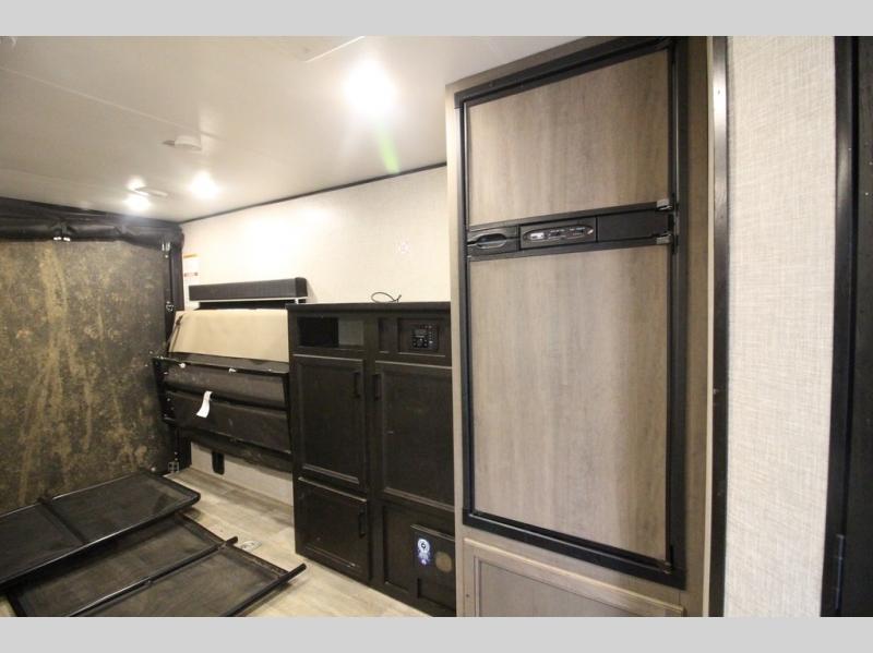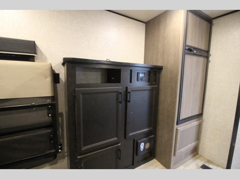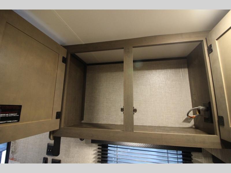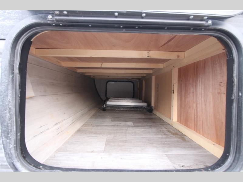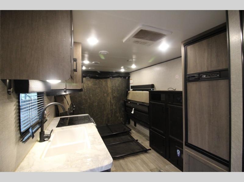 It's time to load up your off-road toys into a 5'11" cargo area with a little more space for gear that stretches into the kitchen area. Once unloaded, you will have convertible sofas and a removable table to enjoy meals at, plus the sofas offer sleeping space. You will have full kitchen amenities including a large pantry, and there is a double entry full bathroom with access from the main living area and kitchen as well as the front private bedroom. You will sleep like a queen, and there are windows to look outside at the weather and dual wardrobes to stow your clothing.