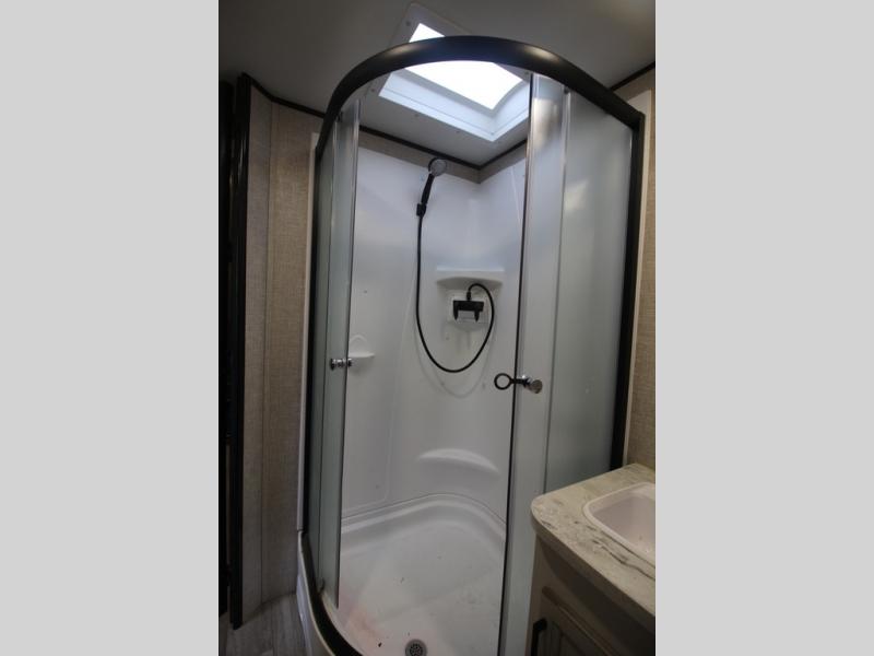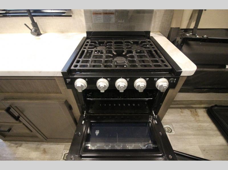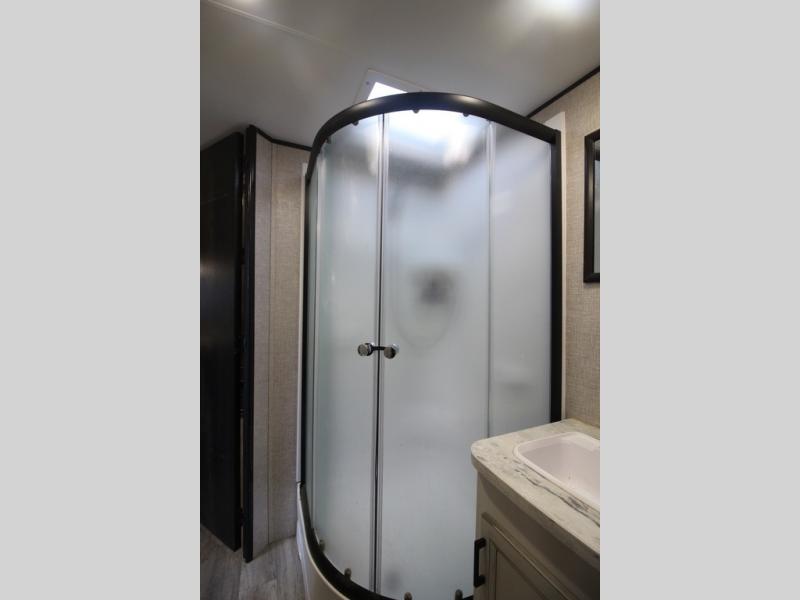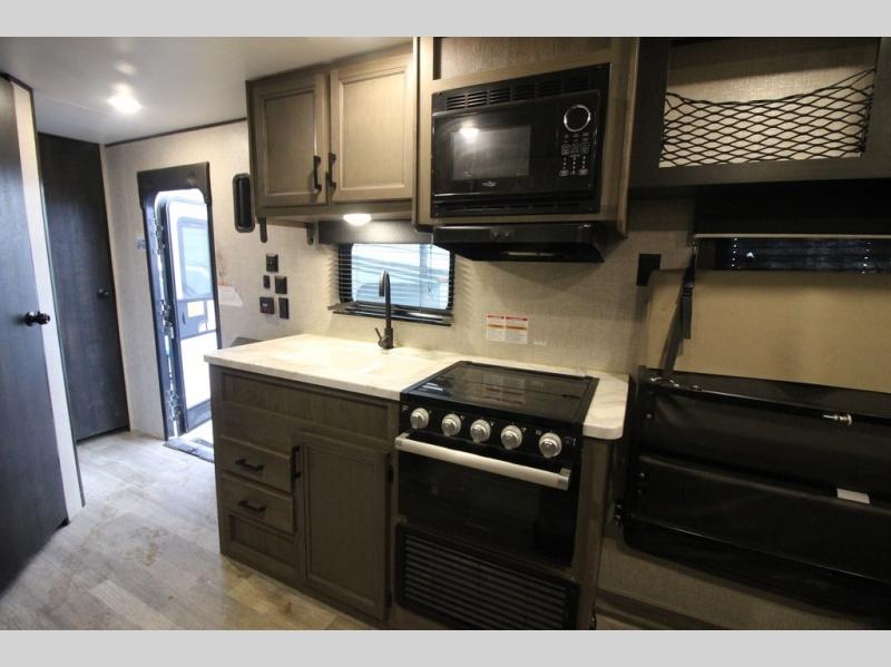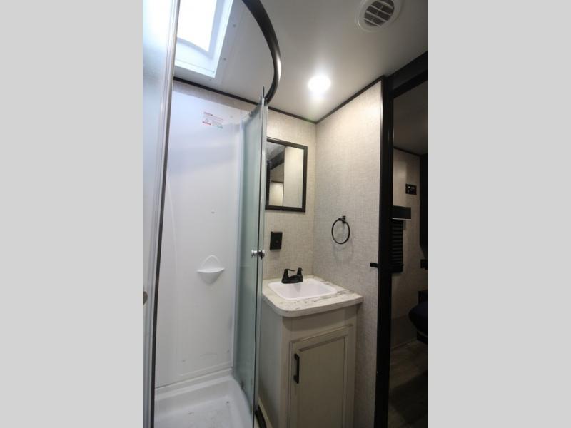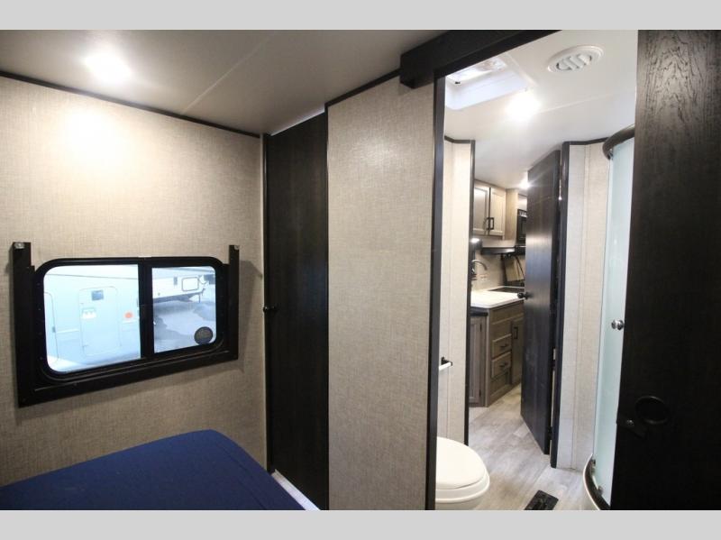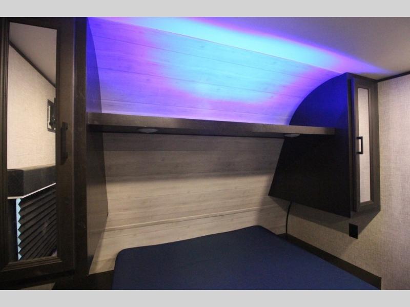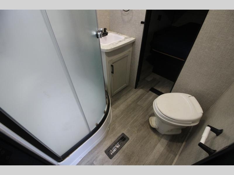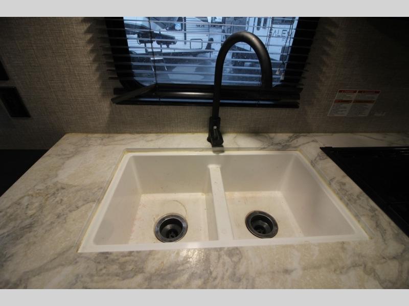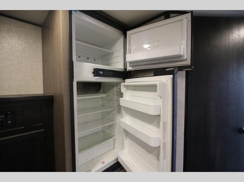 It's time to load up your off-road toys into a 5'11" cargo area with a little more space for gear that stretches into the kitchen area. Once unloaded, you will have convertible sofas and a removable table to enjoy meals at, plus the sofas offer sleeping space. You will have full kitchen amenities including a large pantry, and there is a double entry full bathroom with access from the main living area and kitchen as well as the front private bedroom. You will sleep like a queen, and there are windows to look outside at the weather and dual wardrobes to stow your clothing.
