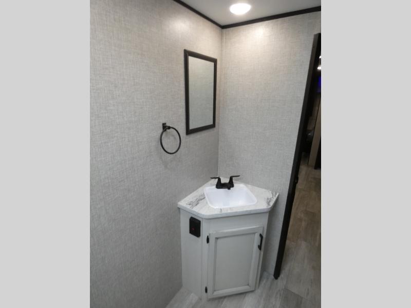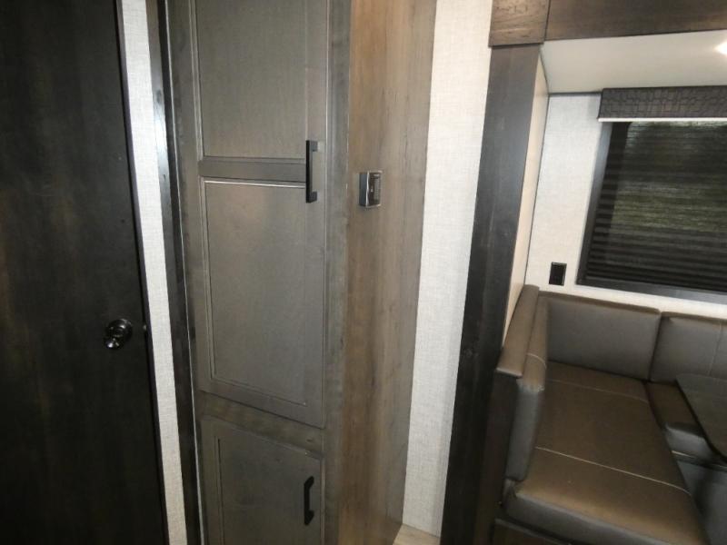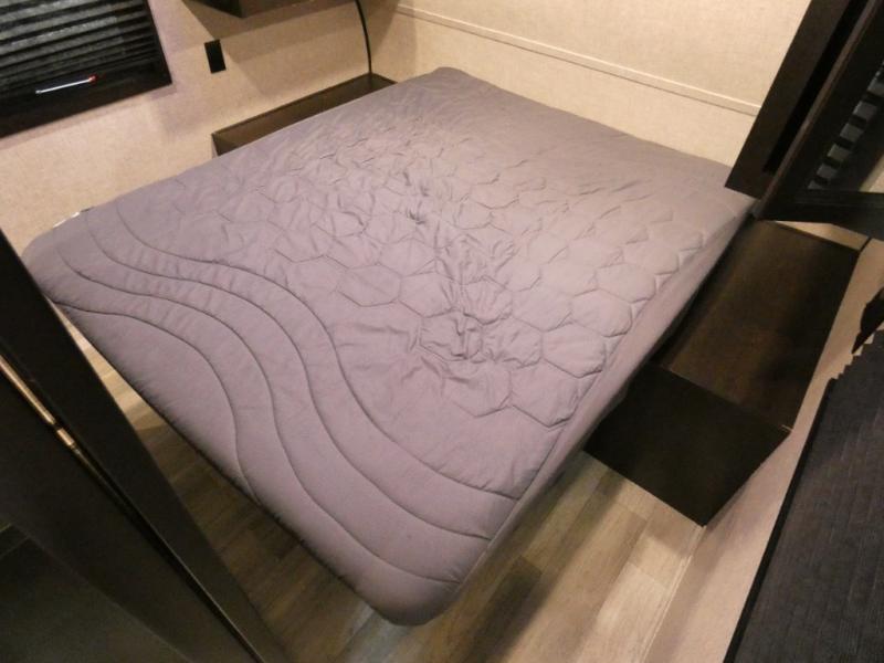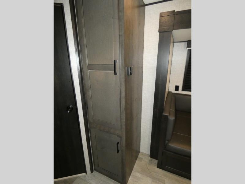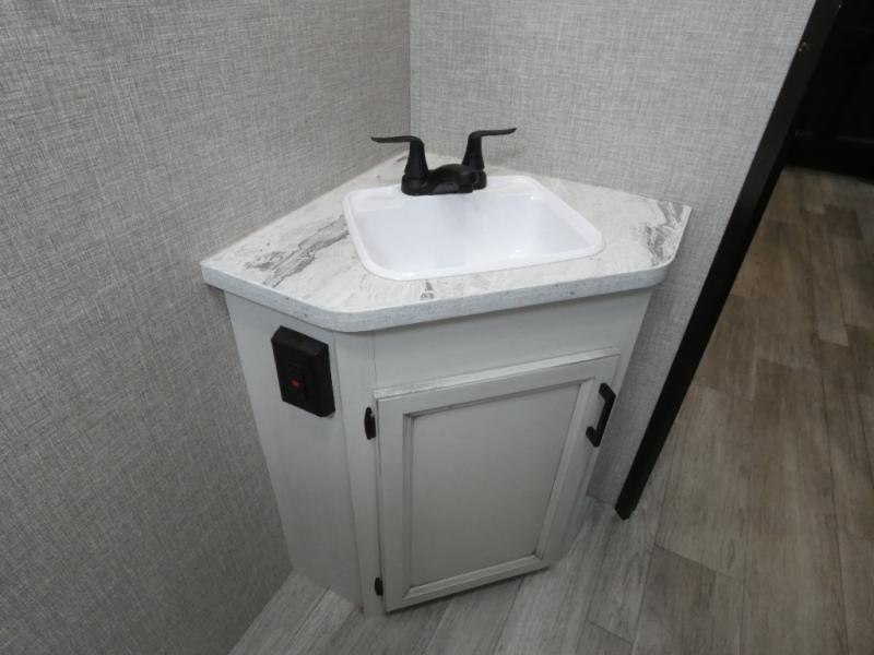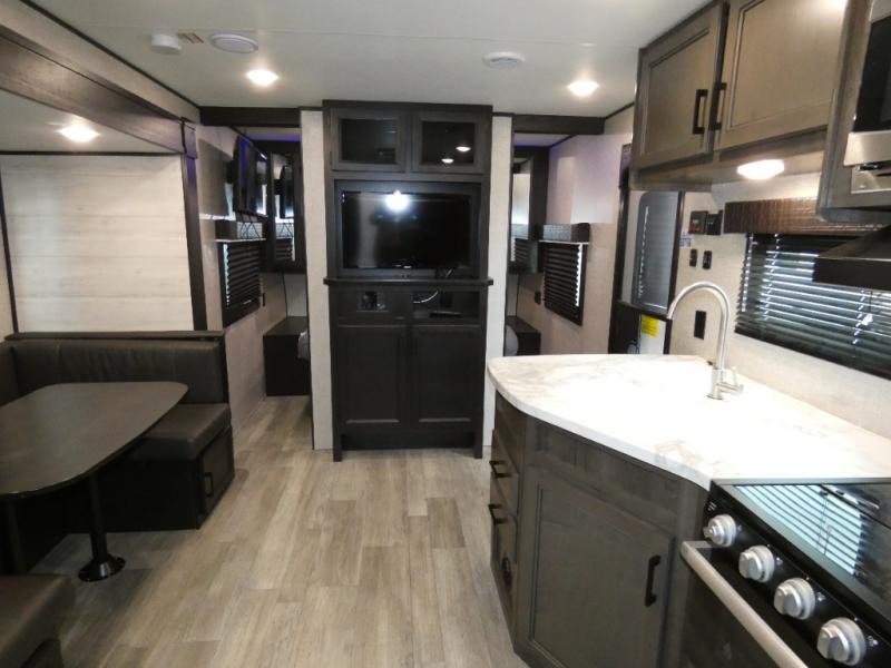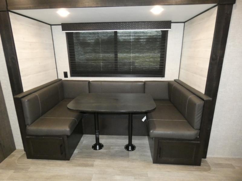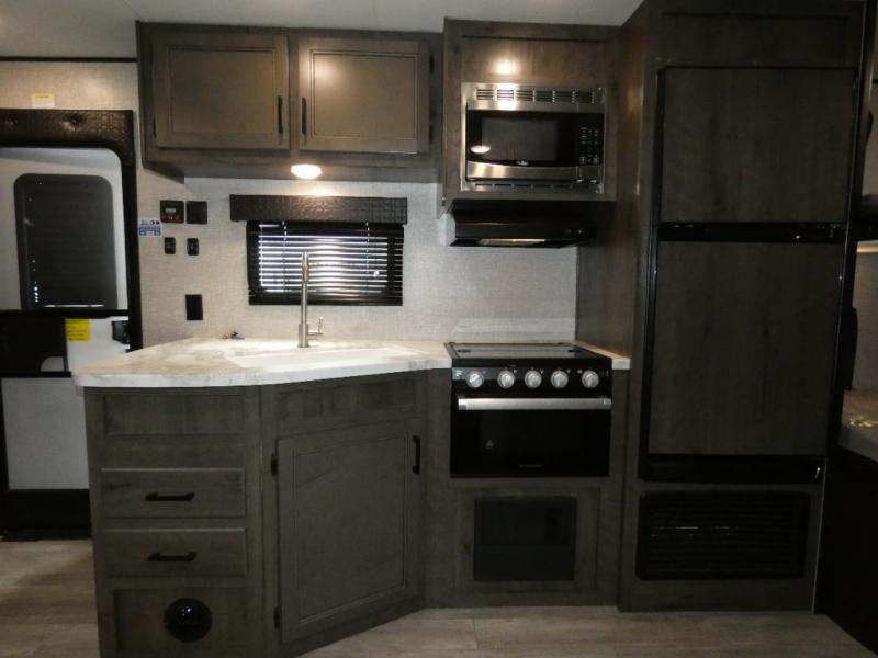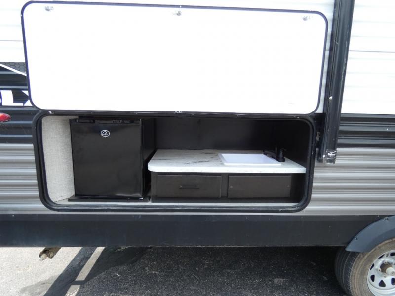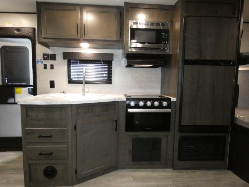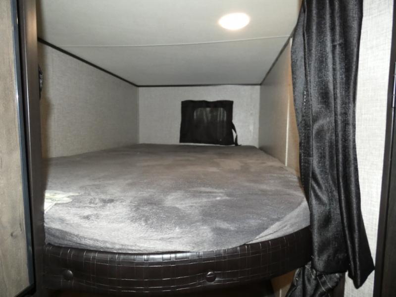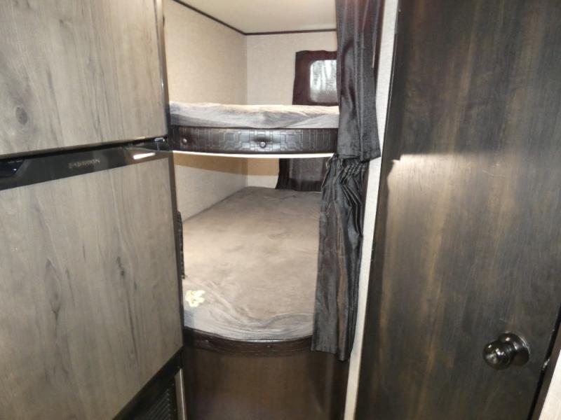 Calling larger camping groups, this trailer is waiting for your adventures! With sleeping space for eight, everyone can join you. The double size bunks offer sleeping for four, plus there is a curtain to close for privacy. The full bathroom will keep everyone clean, and the full kitchen amenities will keep everyone fed. There is an outside kitchen to use when you want to enjoy the outdoors while cooking. You will find exterior storage and a 16' power awning with LED lights that offers a covered outdoor living area when you add your camping chairs. And the front bedroom offers dual entry and wardrobes plus a queen bed, and the U-shaped dinette slide gives you extra floor space, a dining area, and sleeping space for two.