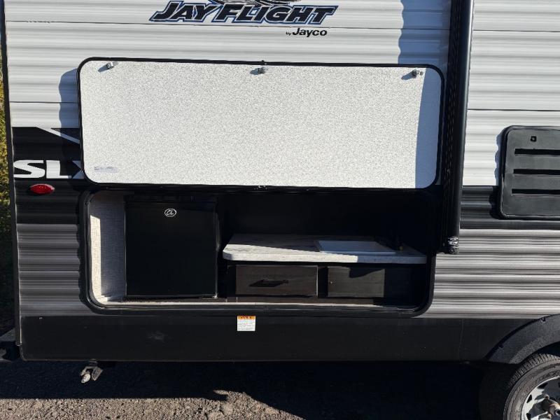 With any Jay Flight SLX 8 travel trailer by Jayco, you will have a durable foundation with l-Class cambered structural steel l-beams, a fully-integrated A-frame, seamless roof material and a Magnum Truss Roof System with plywood decking for a 50% stronger roof than any other in the industry. Also included are Goodyear Endurance tires made in the USA, and a front diamond plate to protect against road debris. Inside, you will love the fresh interior design, the solid hardwood cabinet doors, the 81-inch tall ceiling, the energy-saving LED lighting, and the storage. Whether you are looking for an RV for a small or large group, you will find a Jay Flight SLX 8 to fit your camping lifestyle!