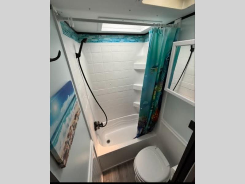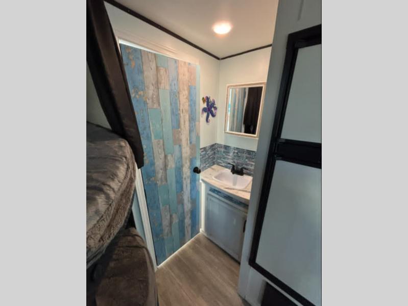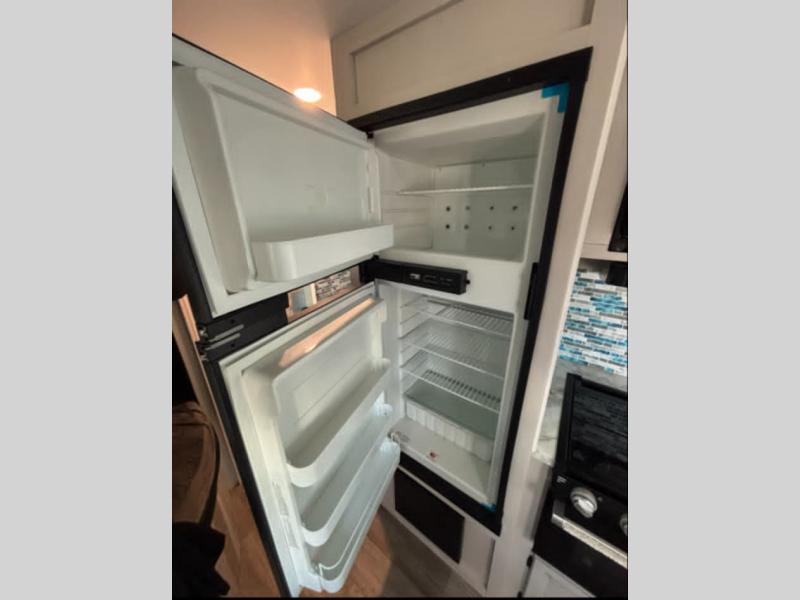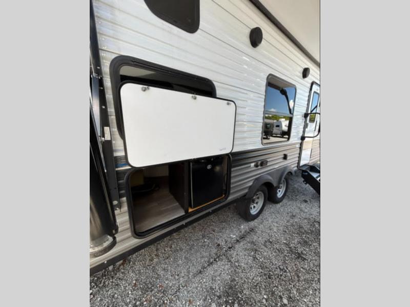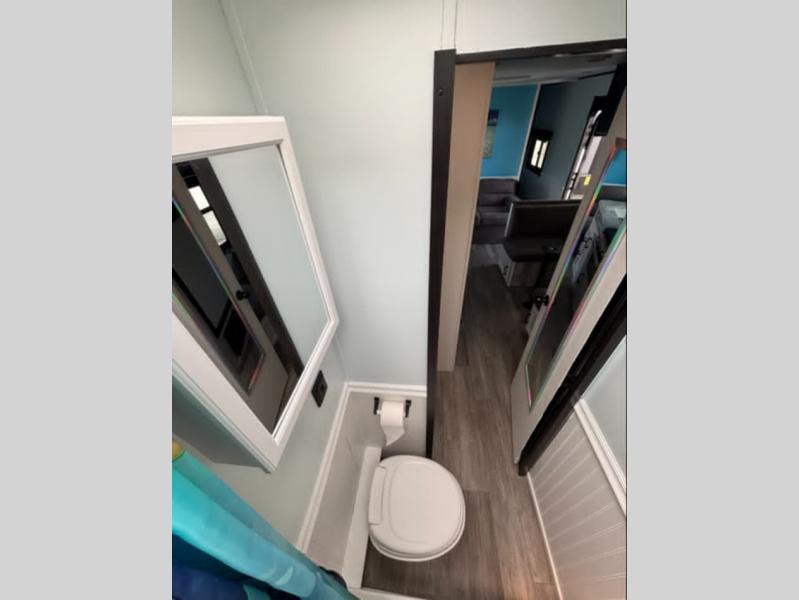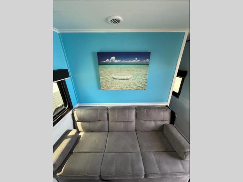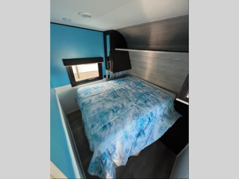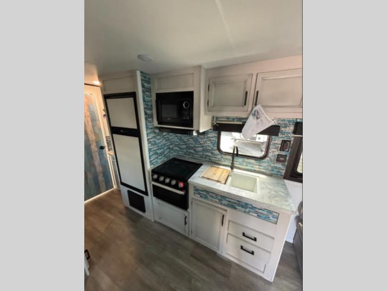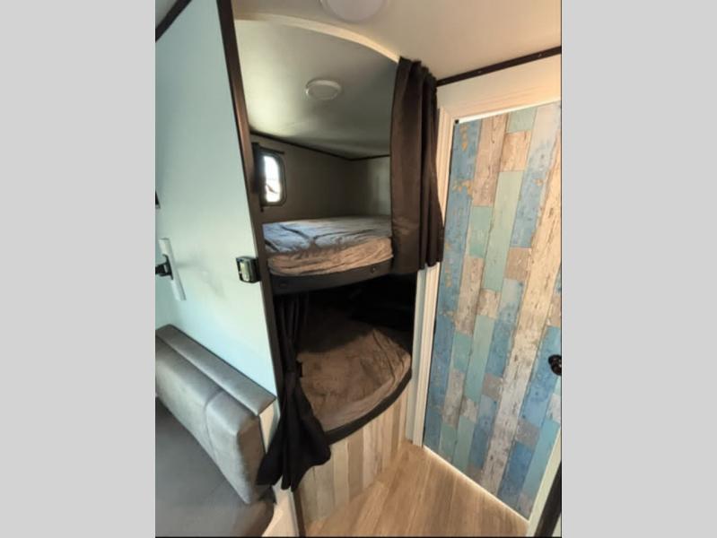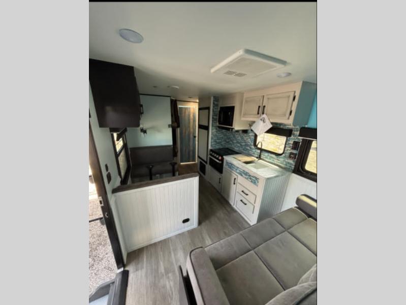 This easy to setup trailer offers a semi-private bedroom up front with a queen bed, semi-private double size bunks in the rear thanks to the curtains, and a private toilet and tub/shower room. The bathroom sink is just outside the door allowing two people to get ready for bed at once. The galley kitchen offers full amenities, and two can dine at the booth dinette and some can relax on the jack-knife sofa. Both furnishings offer extra sleeping space. And you might like to add the Chil N' Stor option which adds a fridge and counter space along the exterior to serve meals outside and store extra beverages.
