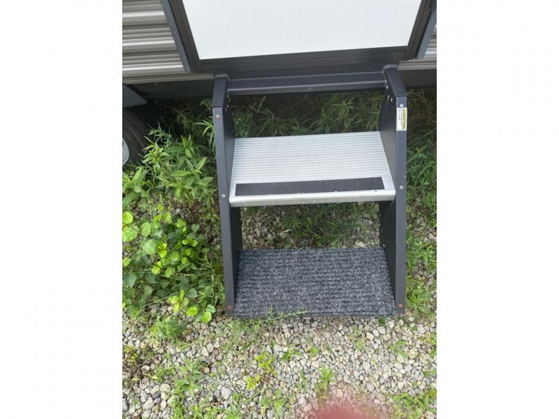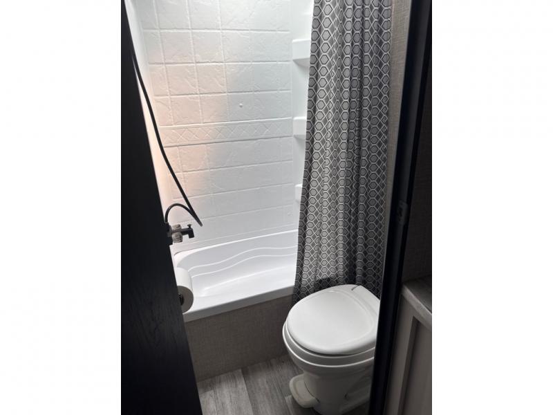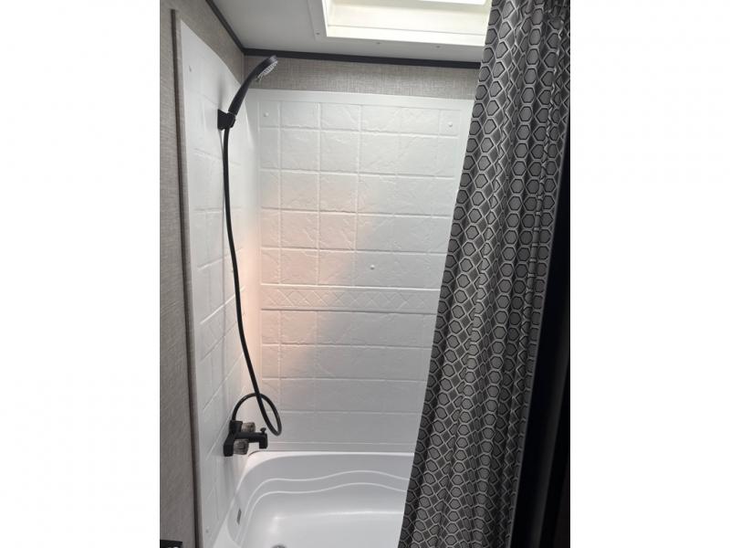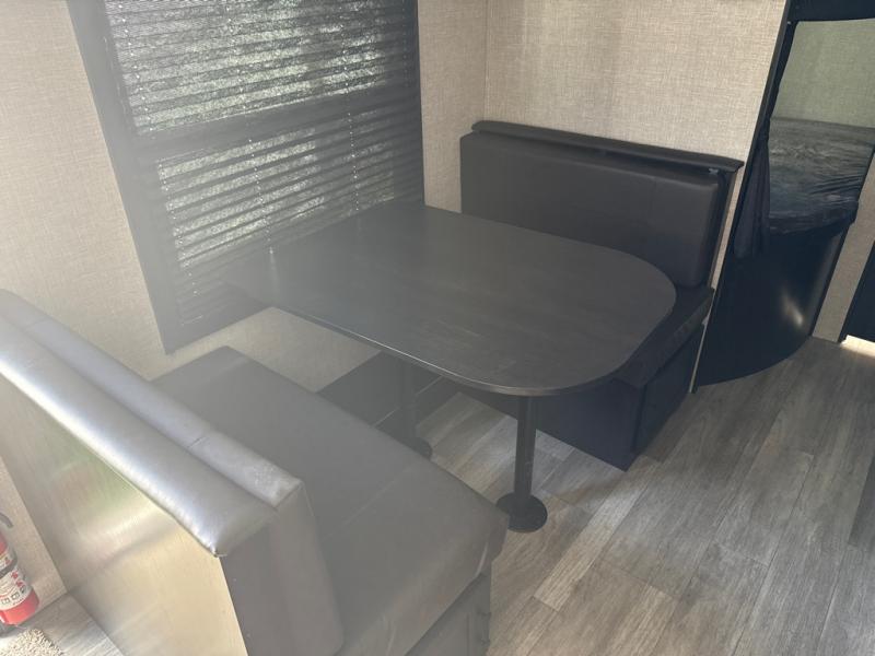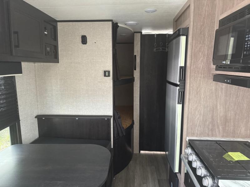 This easy to setup trailer offers a semi-private bedroom up front with a queen bed, semi-private double size bunks in the rear thanks to the curtains, and a private toilet and tub/shower room. The bathroom sink is just outside the door allowing two people to get ready for bed at once. The galley kitchen offers full amenities, and two can dine at the booth dinette and some can relax on the jack-knife sofa. Both furnishings offer extra sleeping space. And you might like to add the Chil N' Stor option which adds a fridge and counter space along the exterior to serve meals outside and store extra beverages.