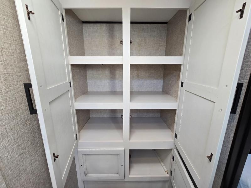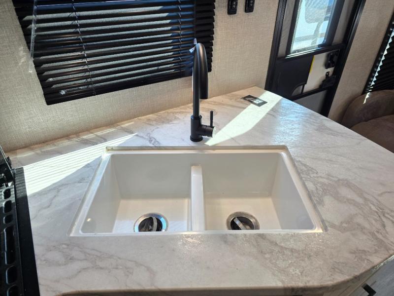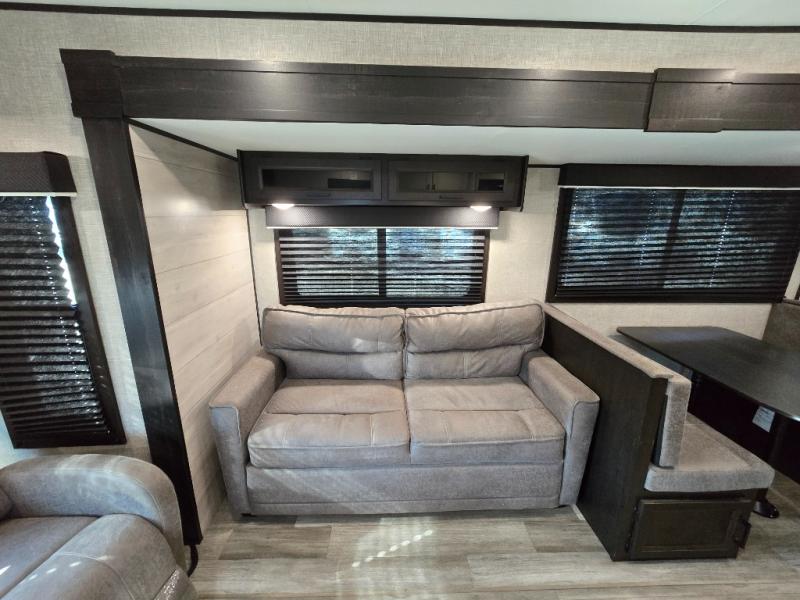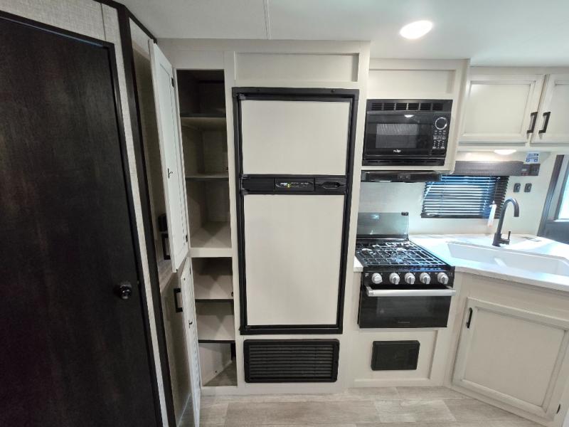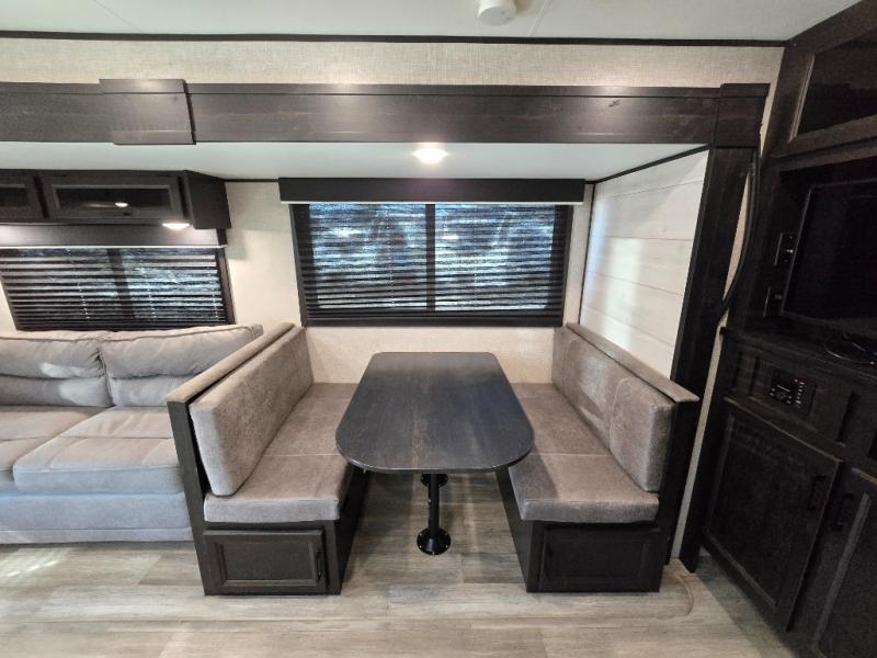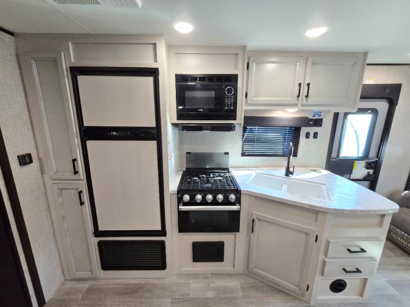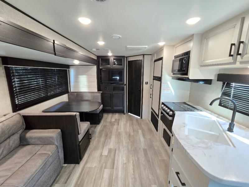 When you want to travel and see new places, this trailer gives you the flexibility to sleep two to four, plus offers a full walk-through bathroom with access from the main area and the front private bedroom. You will also appreciate having a second entry/exit door in the bedroom, a walk-around queen bed, plus dual wardrobes giving you your own side of the bed. The bathroom also has a radius shower and linen storage. The kitchen includes full amenities to make your own meals, and a pantry to keep your dry goods and snacks. You will love the rear swivel rockers with table in between to place your drinks, and the jack-knife sofa plus booth dinette offer more seating, sleeping space, and extra floor space since they are within a slide.