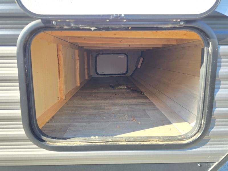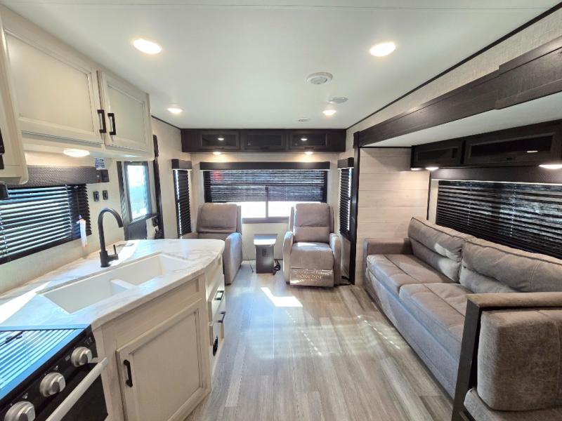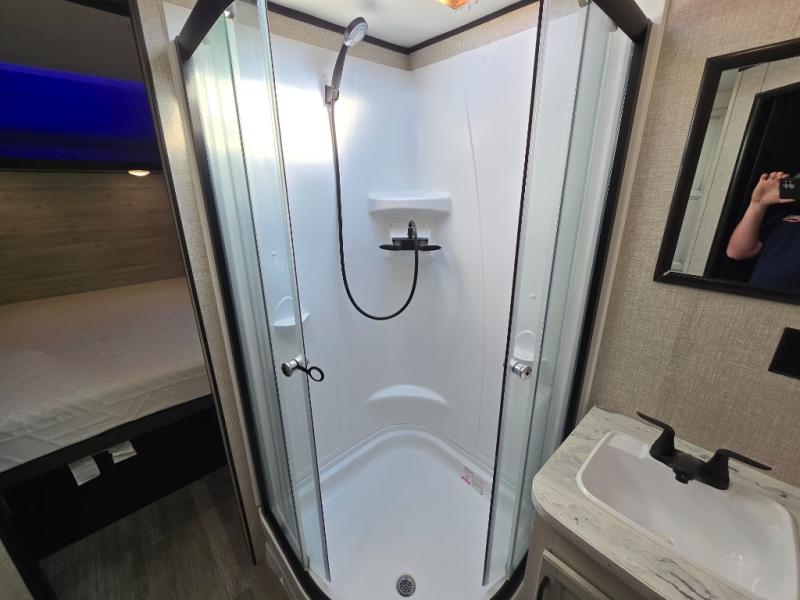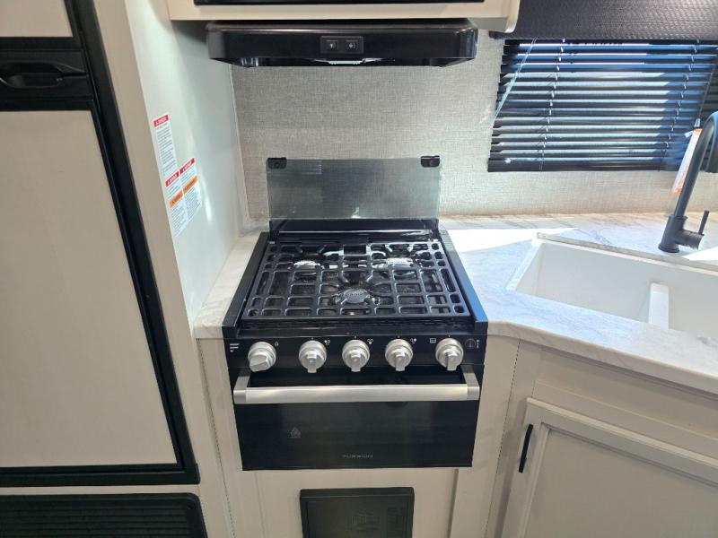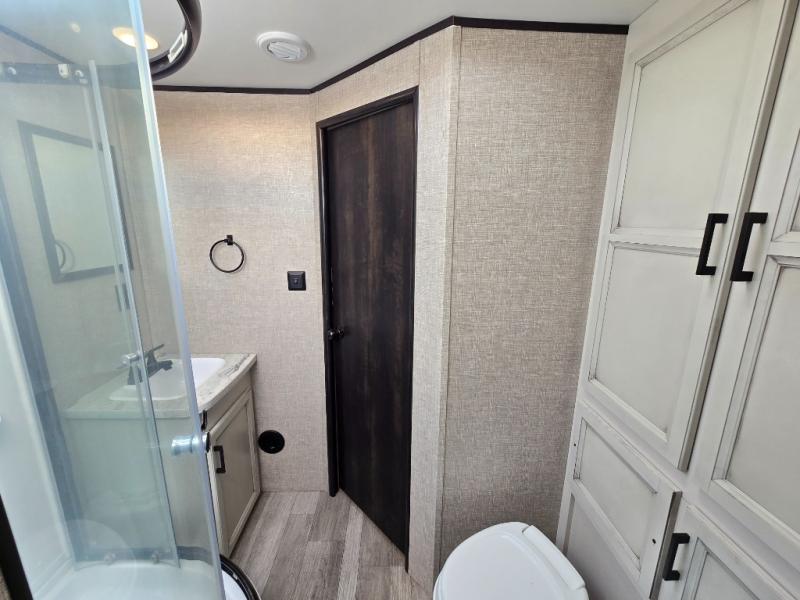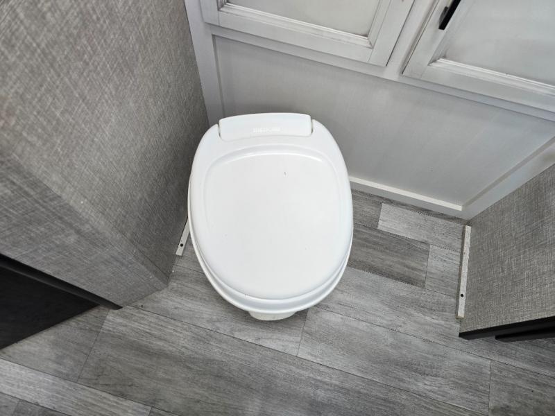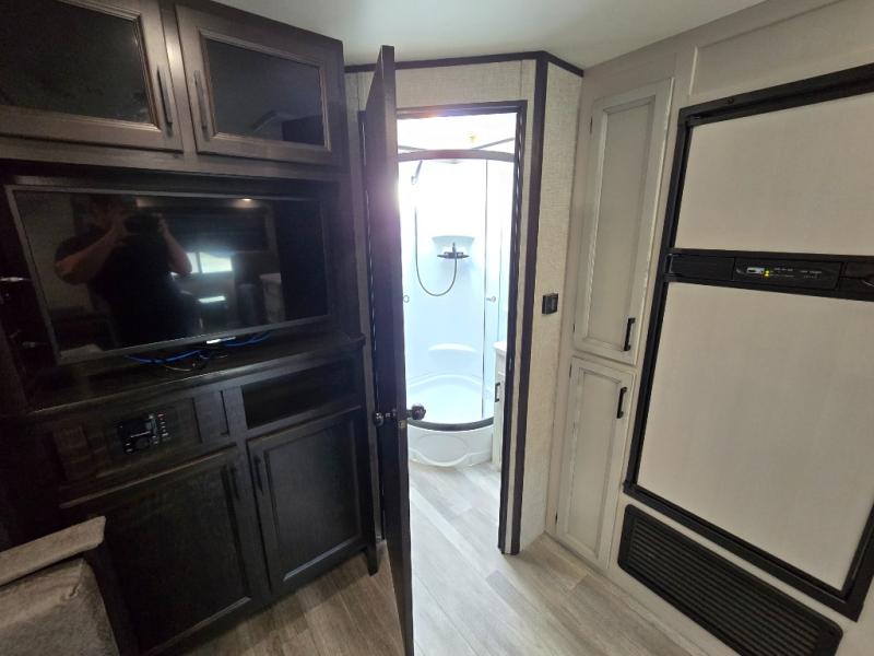 When you want to travel and see new places, this trailer gives you the flexibility to sleep two to four, plus offers a full walk-through bathroom with access from the main area and the front private bedroom. You will also appreciate having a second entry/exit door in the bedroom, a walk-around queen bed, plus dual wardrobes giving you your own side of the bed. The bathroom also has a radius shower and linen storage. The kitchen includes full amenities to make your own meals, and a pantry to keep your dry goods and snacks. You will love the rear swivel rockers with table in between to place your drinks, and the jack-knife sofa plus booth dinette offer more seating, sleeping space, and extra floor space since they are within a slide.