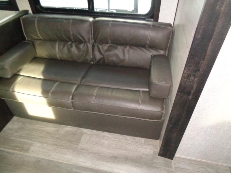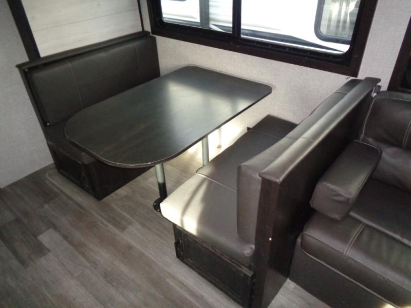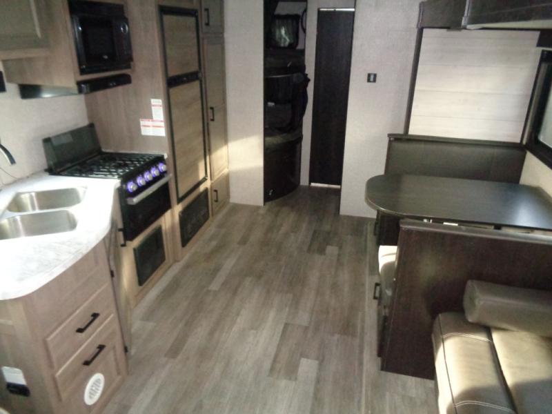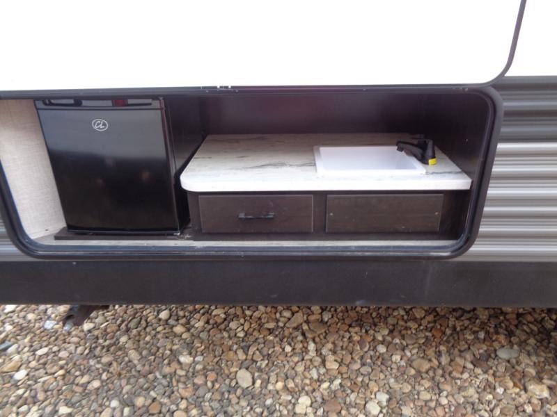 A larger family or group of friends can enjoy camping together in this trailer thanks to the booth dinette and jack-knife sofa slide providing more interior floor space and a place for two or maybe more to sleep at night. And the double size bunks are a fun place to sleep when you need four more spots, plus the privacy curtain will come in handy. The private toilet and tub/shower will keep everyone refreshed and the bathroom sink is just outside the door allowing two people to get ready at one time. The front bedroom offers the owners privacy and there is dual access, two wardrobes and a queen bed to enjoy. The cook will find full amenities indoor, plus there is an outside kitchen to make more meals.