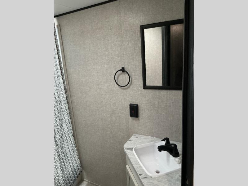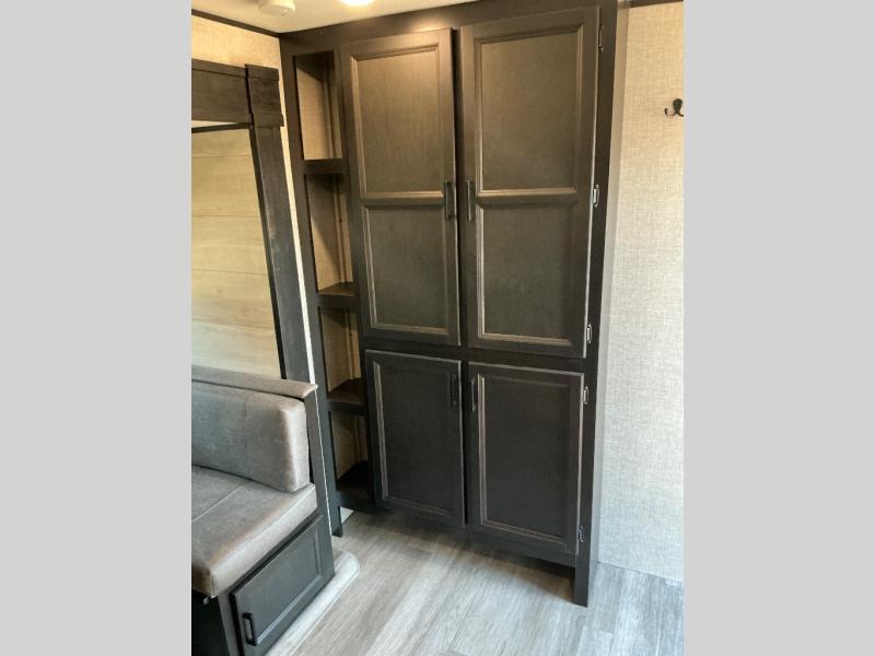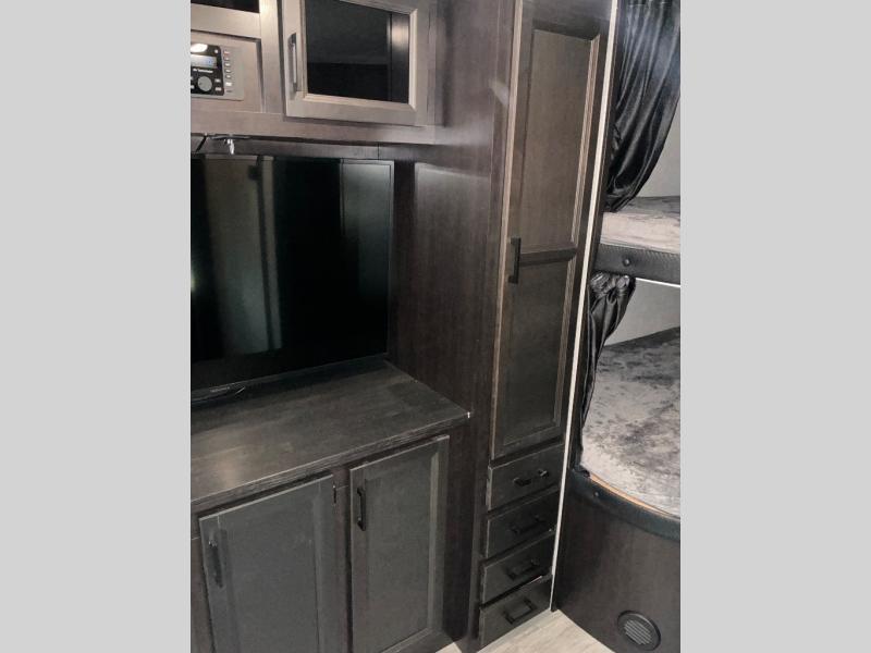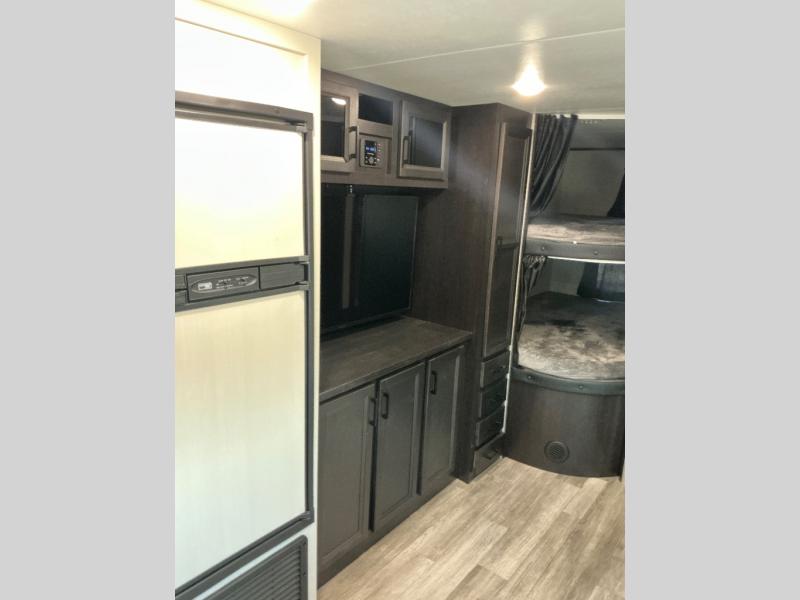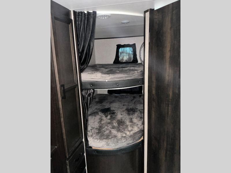 Loads of fun like hiking, fishing, and playing outdoor camping games are waiting for you to make that reservation, hitch up and head out! This trailer allows the owners to sleep in privacy behind the space saving sliding door on a queen bed. And the kids or grandkids can sleep on the double size bunks in the rear next to the full bathroom including a tub/shower. They even have a wardrobe nearby for their things. The slide out jack-knife sofa and U-shaped dinette offers more floor space, a place to relax and dine, plus you can play games at the dinette. The kitchen includes full amenities at your fingertips, plus you all can enjoy the entertainment center with TV when inside. When you want to be outdoors, relax under the 16' power awning after grabbing your camping chairs, and the cook can make a snack on the outside kitchen.