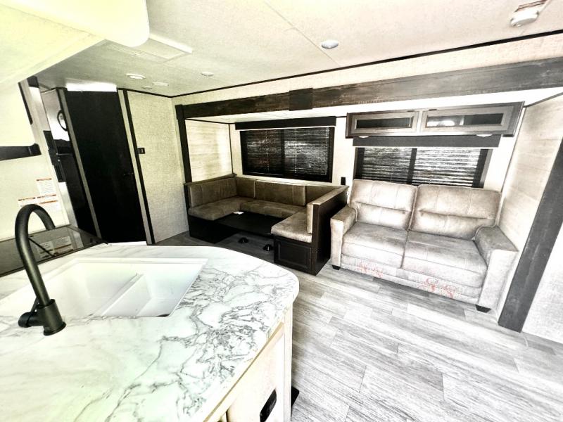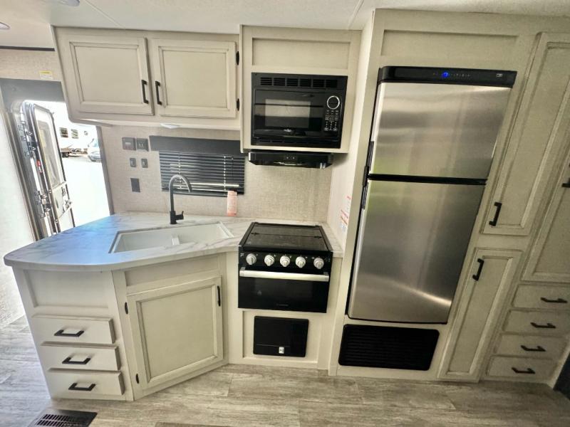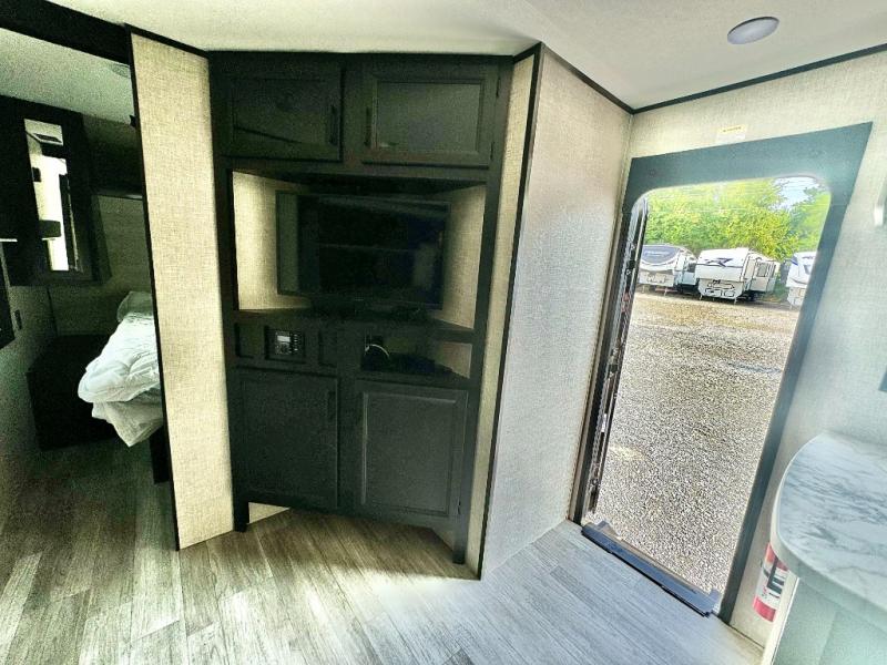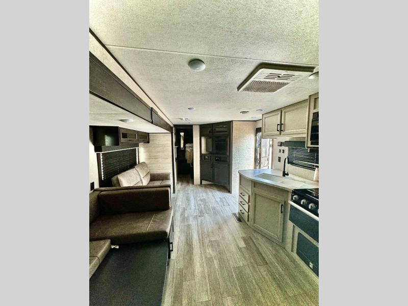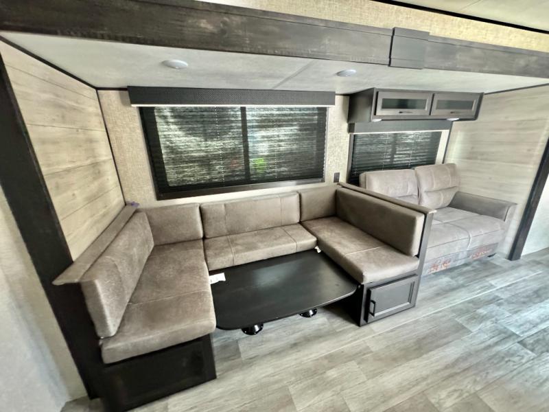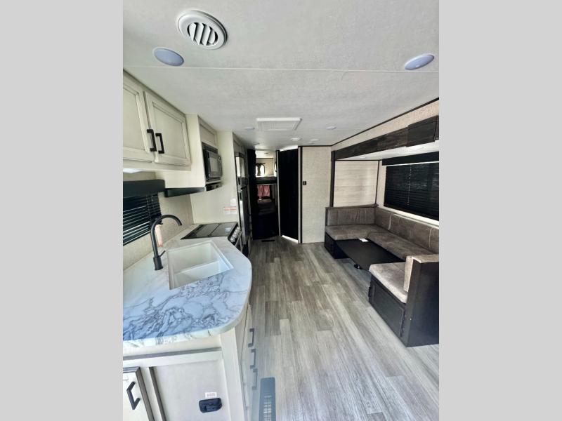 The kids or grandkids will have a fun time sleeping on the set of 48" x 80" double bunk beds in this travel trailer! You will enjoy your own privacy with the front bedroom which has a 60" x 74" queen bed, two wardrobes, and a closet to keep your clothes looking nice. Everyone can enjoy a meal or play a card game at the U-shaped dinette and enjoy the entertainment center across from a jack-knife sofa which can be switched out for the optional tri-fold sofa. You can even breathe in some fresh air while you cook dinner thanks to the outside kitchen!