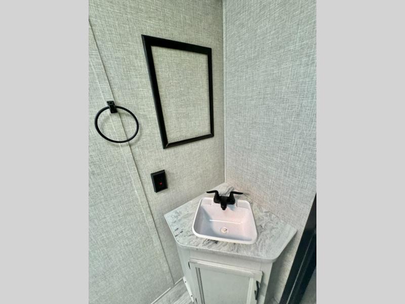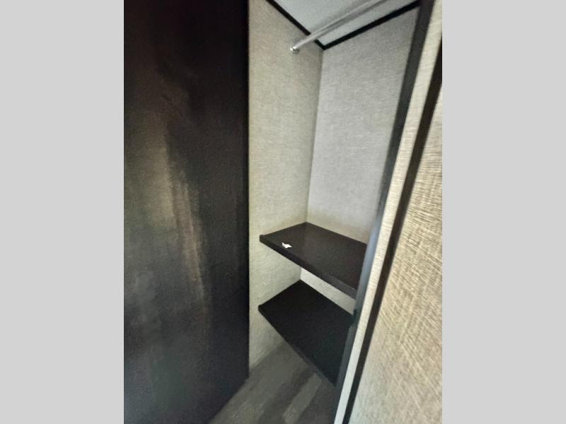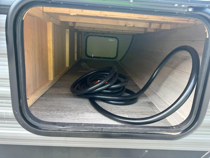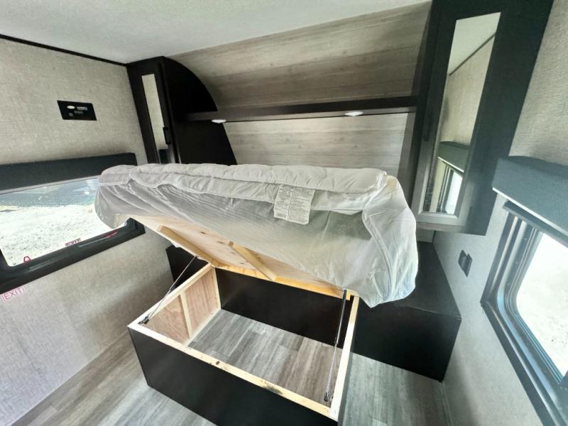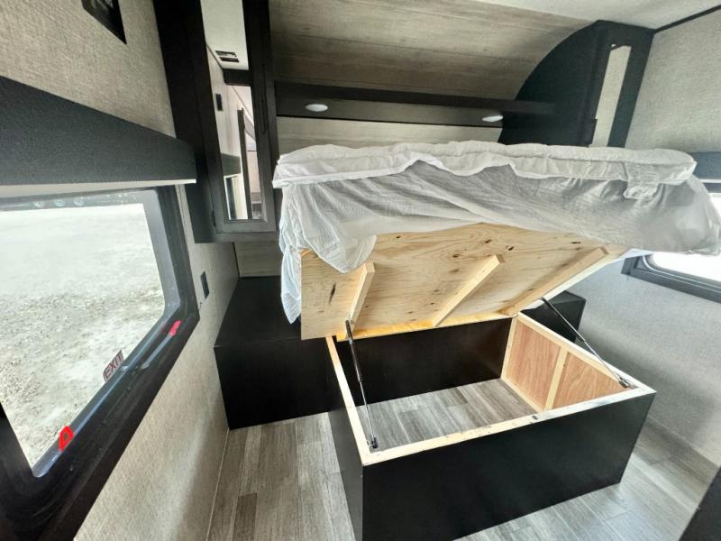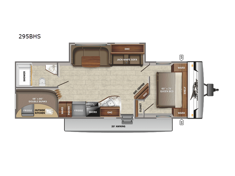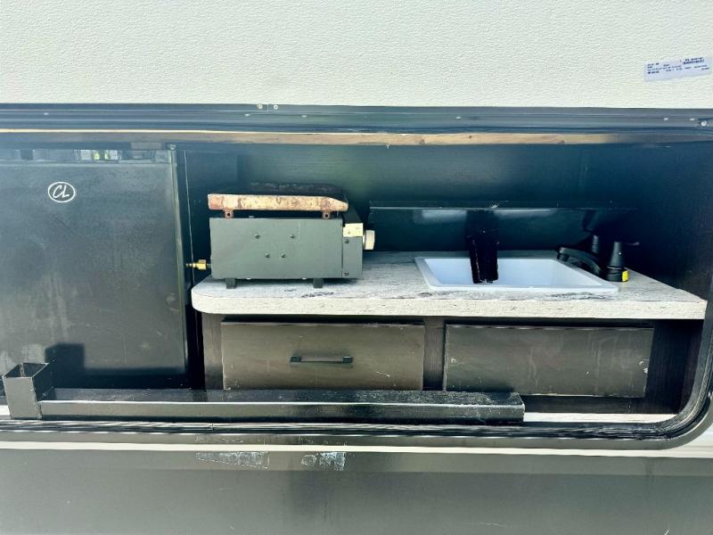 The kids or grandkids will have a fun time sleeping on the set of 48" x 80" double bunk beds in this travel trailer! You will enjoy your own privacy with the front bedroom which has a 60" x 74" queen bed, two wardrobes, and a closet to keep your clothes looking nice. Everyone can enjoy a meal or play a card game at the U-shaped dinette and enjoy the entertainment center across from a jack-knife sofa which can be switched out for the optional tri-fold sofa. You can even breathe in some fresh air while you cook dinner thanks to the outside kitchen!