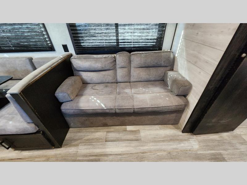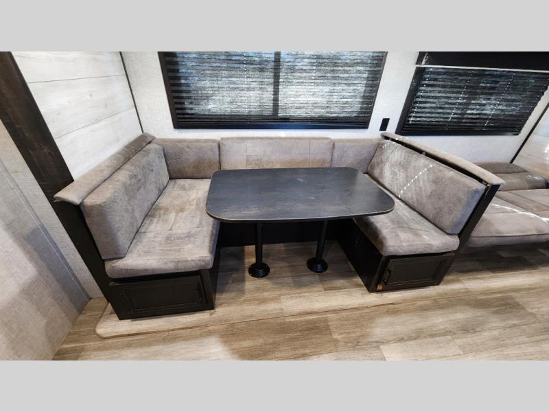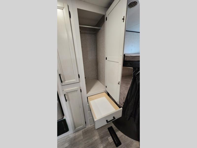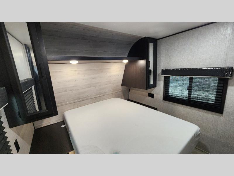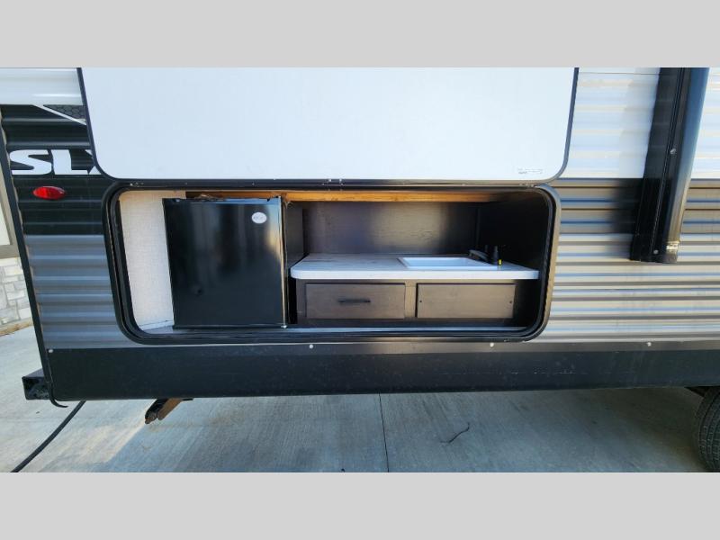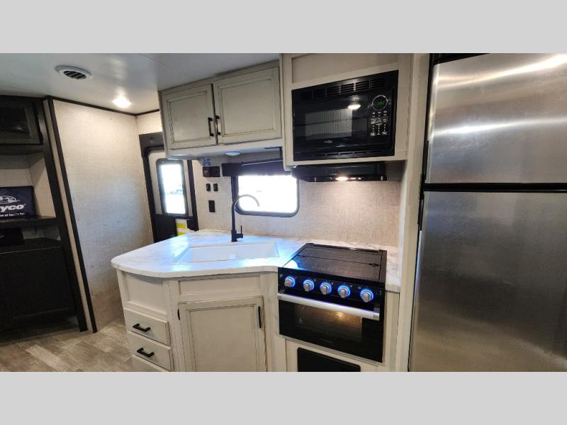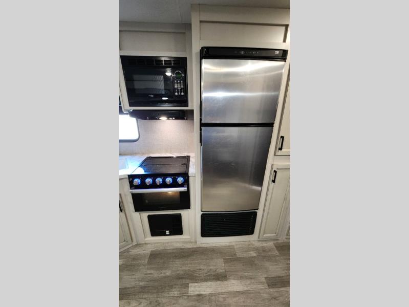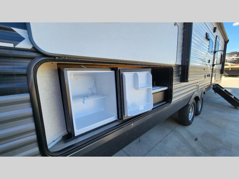 The kids or grandkids will have a fun time sleeping on the set of 48" x 80" double bunk beds in this travel trailer! You will enjoy your own privacy with the front bedroom which has a 60" x 74" queen bed, two wardrobes, and a closet to keep your clothes looking nice. Everyone can enjoy a meal or play a card game at the U-shaped dinette and enjoy the entertainment center across from a jack-knife sofa which can be switched out for the optional tri-fold sofa. You can even breathe in some fresh air while you cook dinner thanks to the outside kitchen!