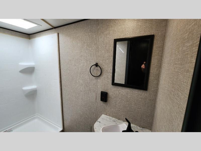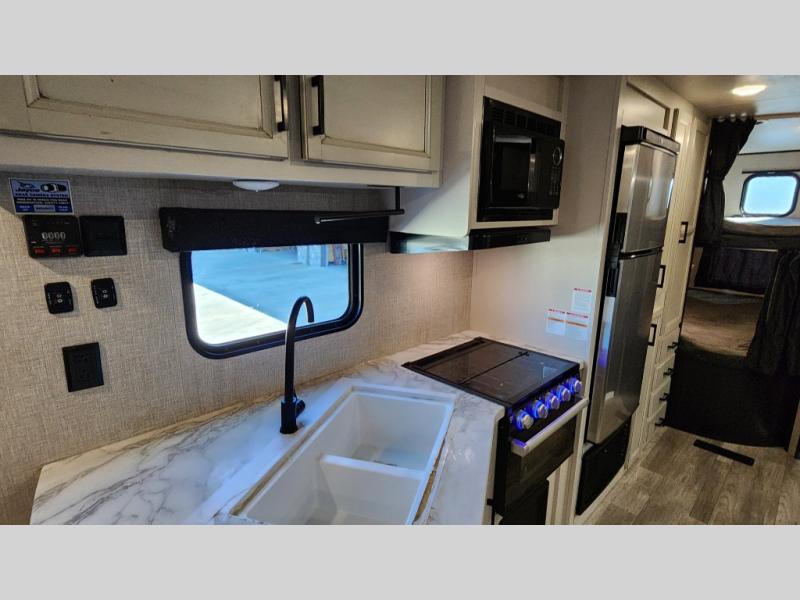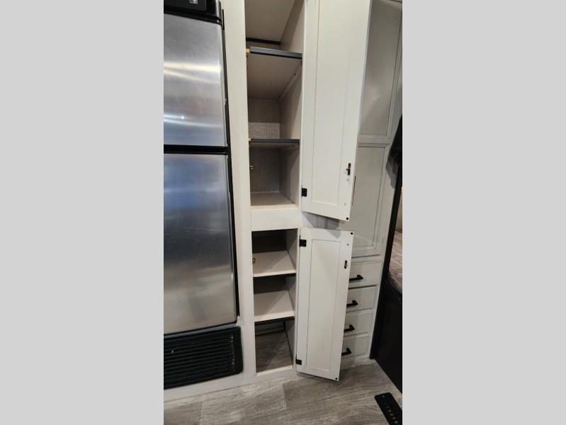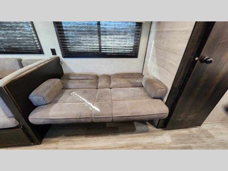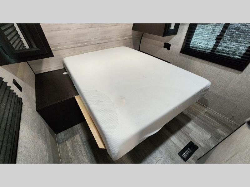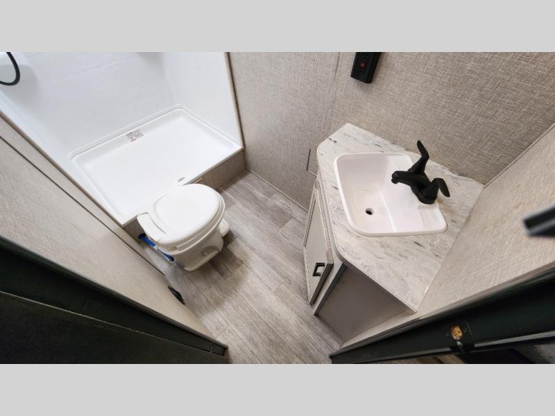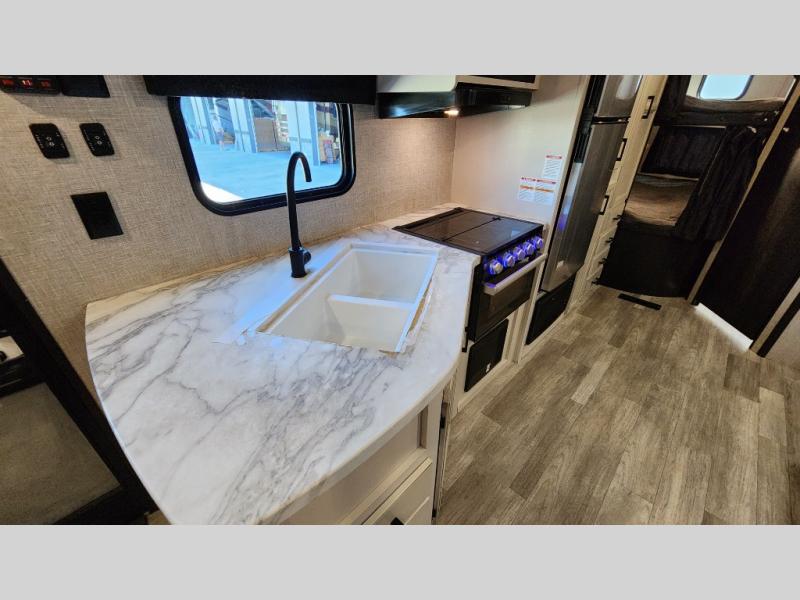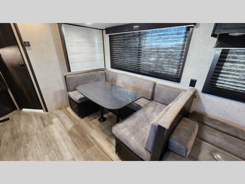 The kids or grandkids will have a fun time sleeping on the set of 48" x 80" double bunk beds in this travel trailer! You will enjoy your own privacy with the front bedroom which has a 60" x 74" queen bed, two wardrobes, and a closet to keep your clothes looking nice. Everyone can enjoy a meal or play a card game at the U-shaped dinette and enjoy the entertainment center across from a jack-knife sofa which can be switched out for the optional tri-fold sofa. You can even breathe in some fresh air while you cook dinner thanks to the outside kitchen!