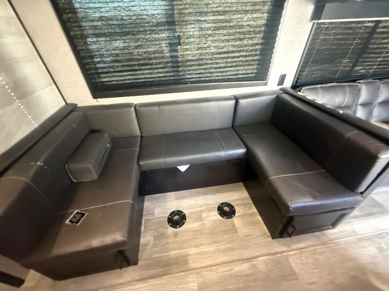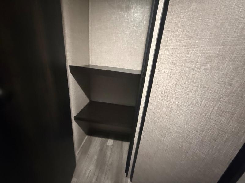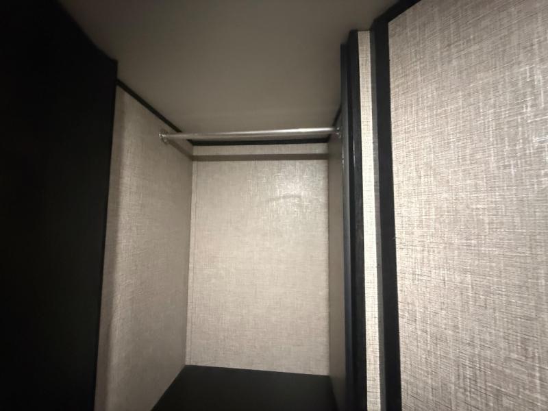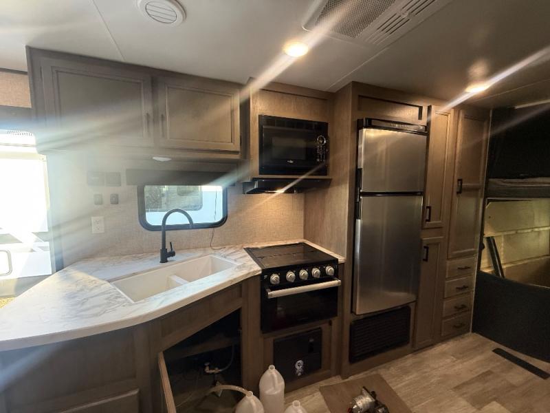 The kids or grandkids will have a fun time sleeping on the set of 48" x 80" double bunk beds in this travel trailer! You will enjoy your own privacy with the front bedroom which has a 60" x 74" queen bed, two wardrobes, and a closet to keep your clothes looking nice. Everyone can enjoy a meal or play a card game at the U-shaped dinette and enjoy the entertainment center across from a jack-knife sofa which can be switched out for the optional tri-fold sofa. You can even breathe in some fresh air while you cook dinner thanks to the outside kitchen!