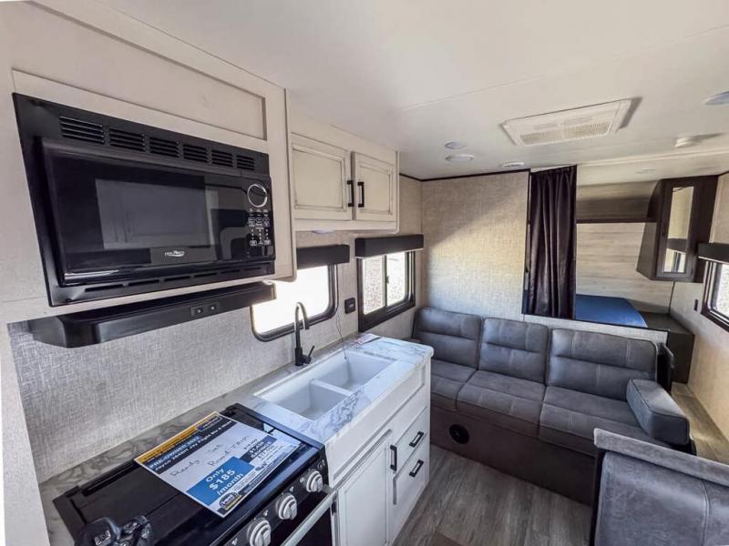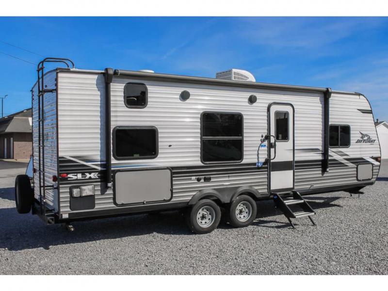 With any Jayco Jay Flight SLX Western Edition 8'-wide travel trailer, the exterior offers equipment such as l-Class cambered structural steel l-beams, seamless roof material, the Magnum Truss roof system, large exterior downspouts, rooftop solar prep, and an LP quick connect/outside grill prep. There is a mandatory Customer Value package providing even more features such as Goodyear Endurance tires made in the USA, a front diamond plate to protect against debris, and four stabilizer jacks. The interior offers residential-style kitchen countertops, a wood-trimmed mirror in the bathroom, vinyl flooring throughout including slide floors for easy care and durability, and a roof-mounted 13,500-BTU A/C. Take a look and you will be able to pick the right camper for you!
