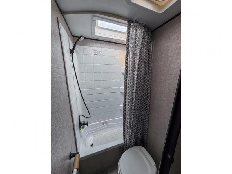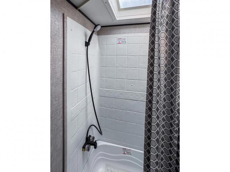 This family-friendly trailer offers the kids a set of double-size bunks so they can invite their friends to stay the night with them or on the furniture that doubles as extra sleeping space. The owners will have a semi-private bedroom up front with a walk-around queen bed, two wardrobes, an overhead shelf and a curtain to close for privacy. The chef will have a three-burner range and microwave to whip up meals, plus a 6 cu. ft. refrigerator to store leftovers. The toilet and tub/shower room allows everyone privacy when changing, and the bathroom sink is just outside the door allowing some to wash their face while another is taking a shower. And don't forget about the 16' power awning that offers protection from the elements, and you might like to add the Chil N' Stor option if you want cold food or beverage storage along the exterior.