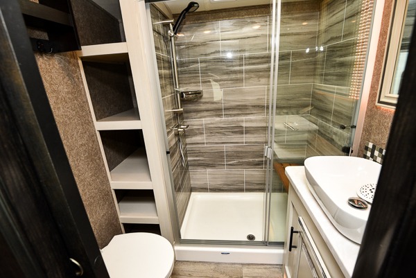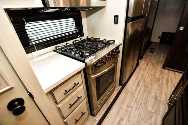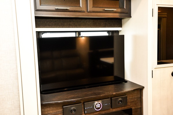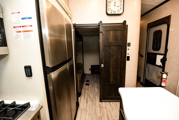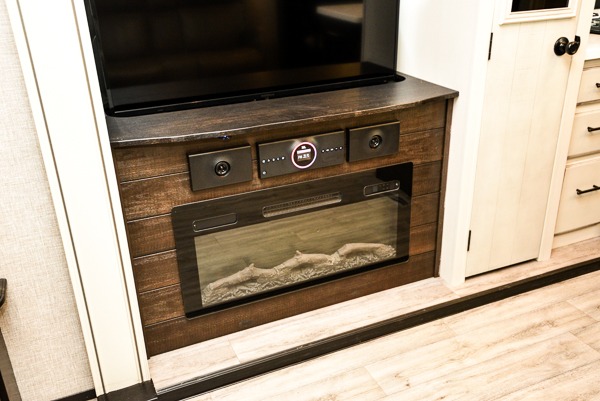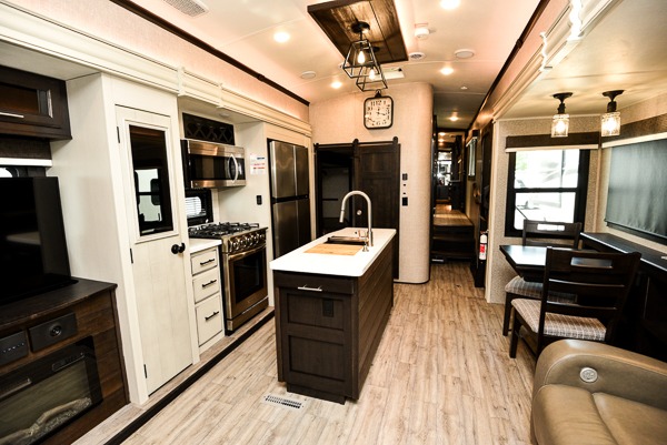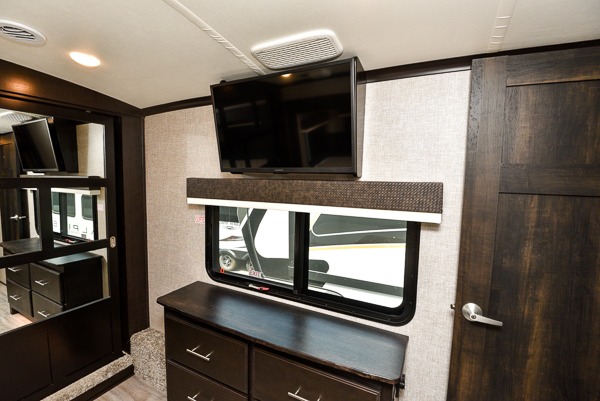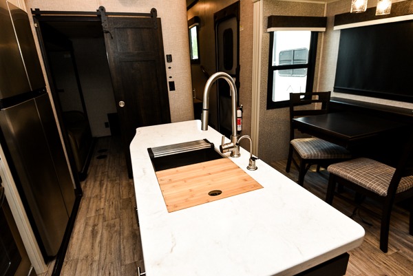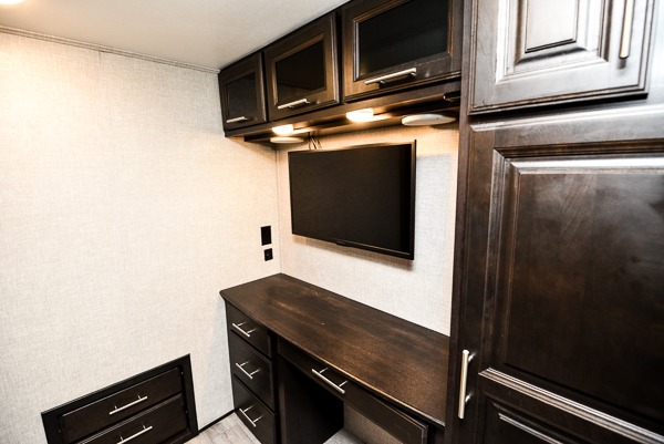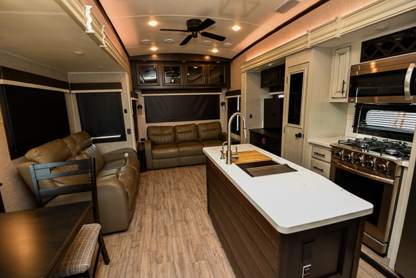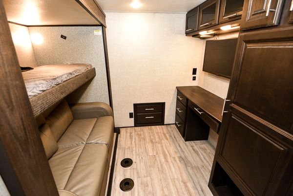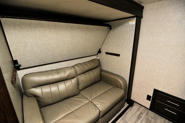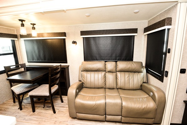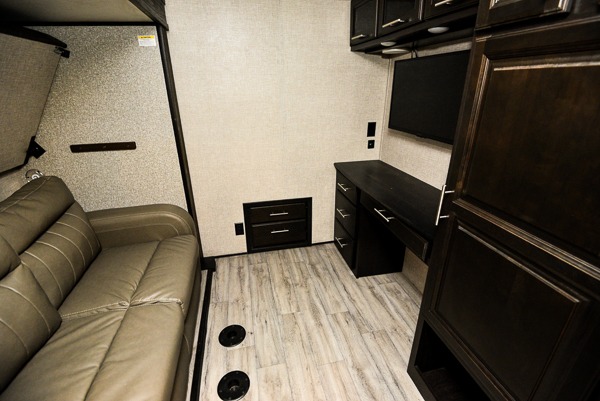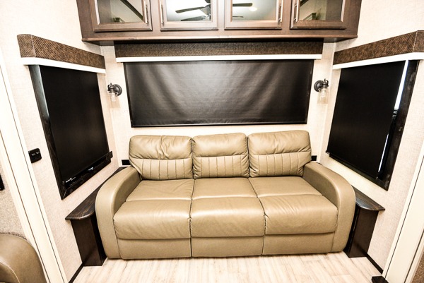 You can work from anywhere with this fifth wheel thanks to the middle bonus room that offers a desk with TV above, a tri-fold sofa with removable table, a flip-up bunk and a closet. This multi-use room works for just about anything including an extra living area and bunkhouse. The shoe storage under the interior steps, the linen cabinet in the full bathroom, the walk-in closet in the master bedroom, and the overhead cabinets plus exterior storage allows you to bring whatever you want. Enjoy cooking in the kitchen that provides an island, a 21 cu. ft. residential refrigerator or choose the 18 cu. ft. option, a pantry and everything you need to keep everyone fed. The theater seats, the tri-fold sofa and the free standing table without a pedestal are great places to sit while watching the 50" Smart LED HDTV with fully digital HDMI output and JBL home entertainment system with subwoofer plus there is a fireplace below for those chilly evenings.