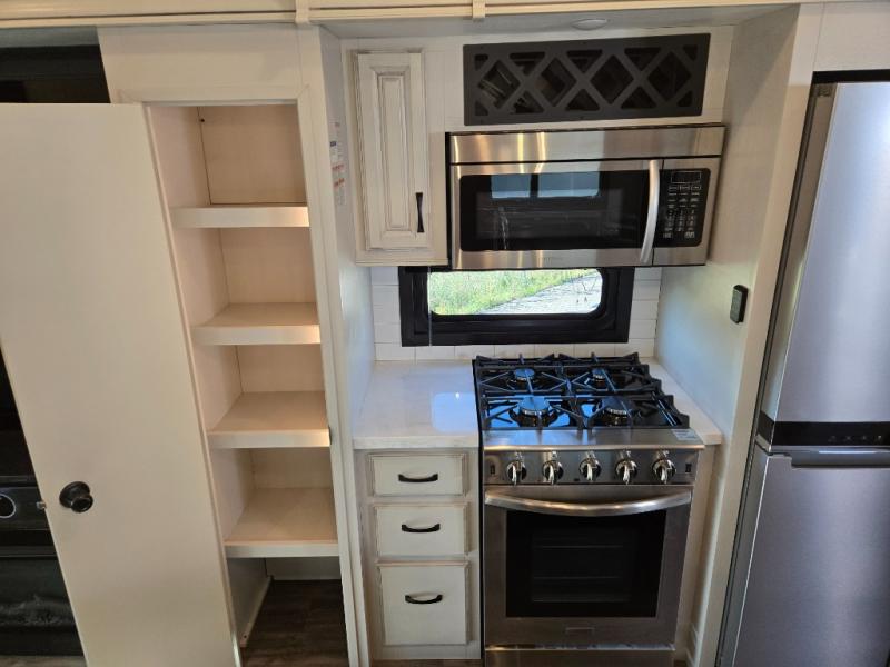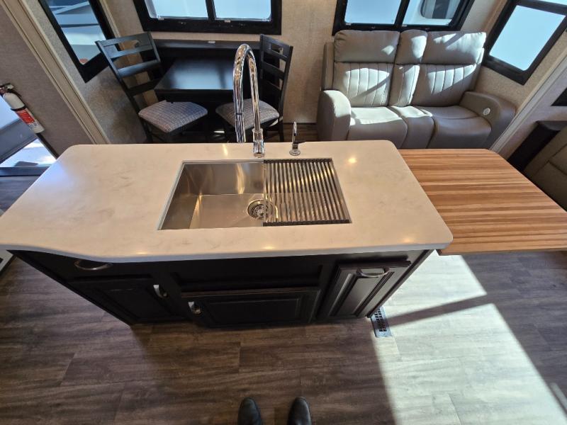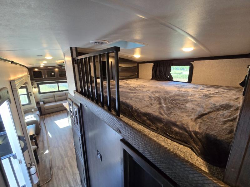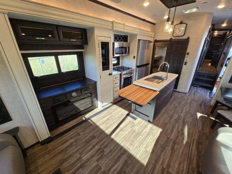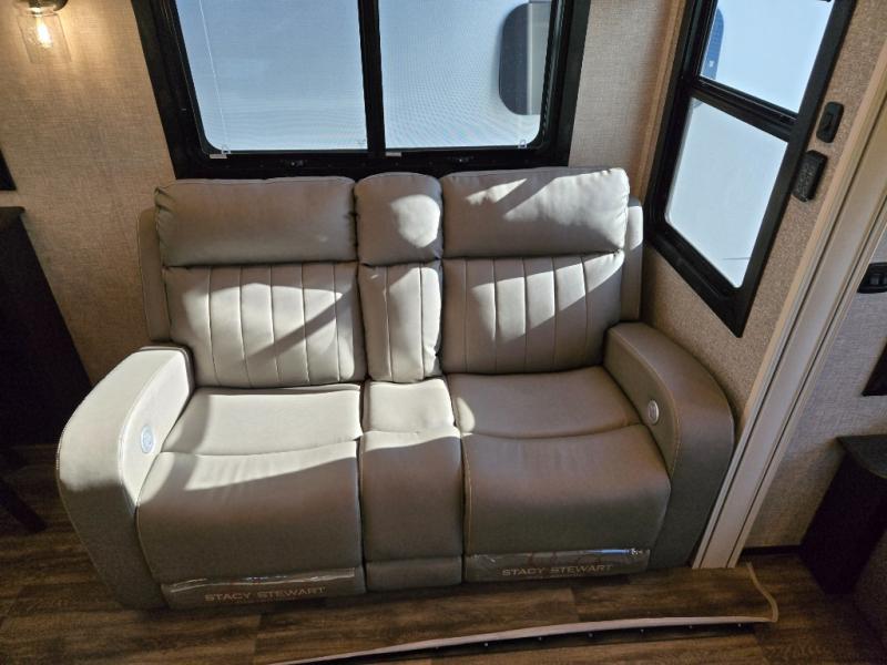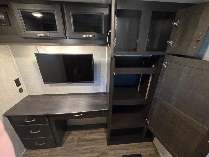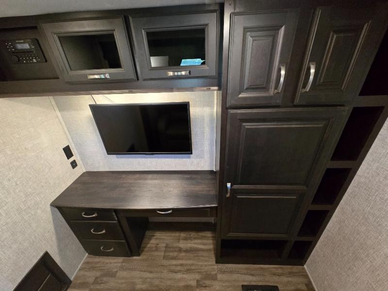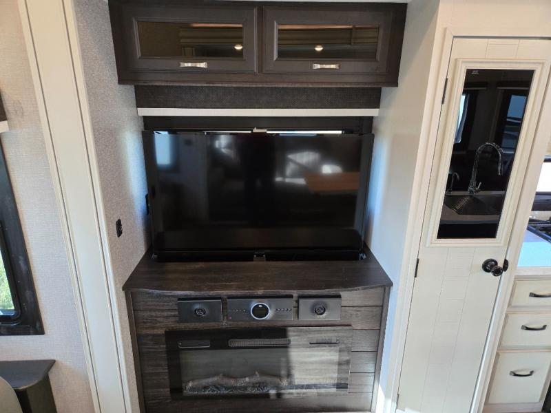 You can work from anywhere with this fifth wheel thanks to the middle bonus room that offers a desk with TV above, a tri-fold sofa with removable table, a flip-up bunk and a closet. This multi-use room works for just about anything including an extra living area and bunkhouse. The shoe storage under the interior steps, the linen cabinet in the full bathroom, the walk-in closet in the master bedroom, and the overhead cabinets plus exterior storage allows you to bring whatever you want. Enjoy cooking in the kitchen that provides an island, a 21 cu. ft. residential refrigerator or choose the 18 cu. ft. option, a pantry and everything you need to keep everyone fed. The theater seats, the tri-fold sofa and the free standing table without a pedestal are great places to sit while watching the 50" Smart LED HDTV with fully digital HDMI output and JBL home entertainment system with subwoofer plus there is a fireplace below for those chilly evenings.