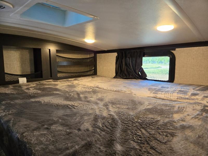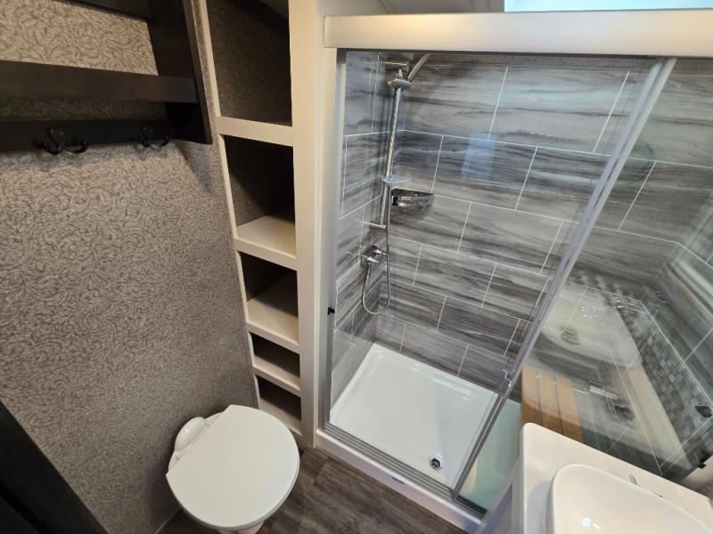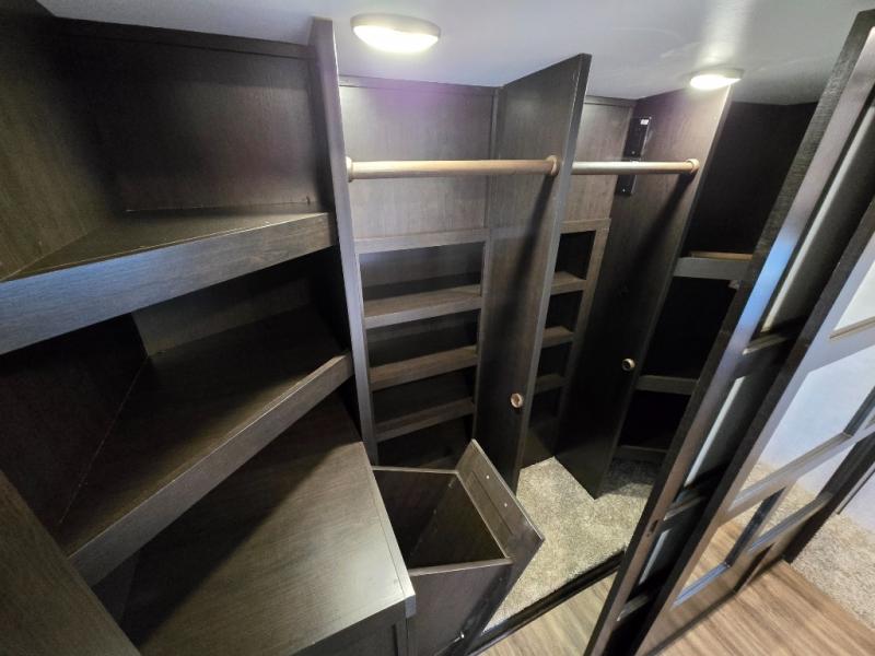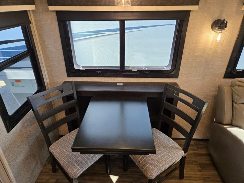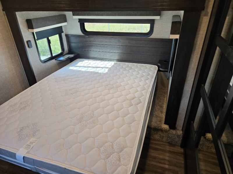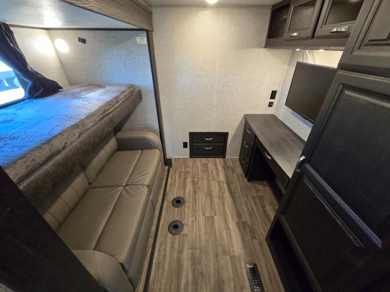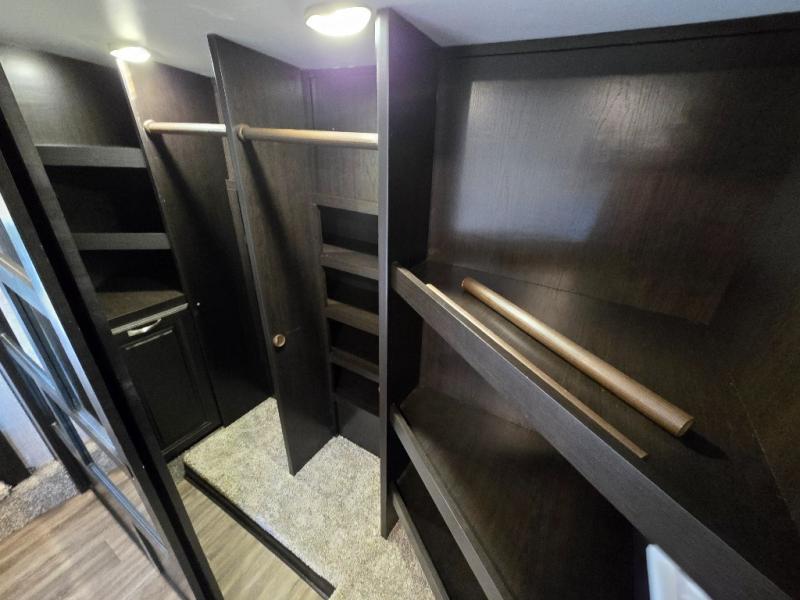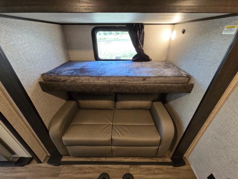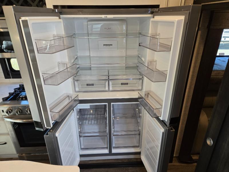 You can work from anywhere with this fifth wheel thanks to the middle bonus room that offers a desk with TV above, a tri-fold sofa with removable table, a flip-up bunk and a closet. This multi-use room works for just about anything including an extra living area and bunkhouse. The shoe storage under the interior steps, the linen cabinet in the full bathroom, the walk-in closet in the master bedroom, and the overhead cabinets plus exterior storage allows you to bring whatever you want. Enjoy cooking in the kitchen that provides an island, a 21 cu. ft. residential refrigerator or choose the 18 cu. ft. option, a pantry and everything you need to keep everyone fed. The theater seats, the tri-fold sofa and the free standing table without a pedestal are great places to sit while watching the 50" Smart LED HDTV with fully digital HDMI output and JBL home entertainment system with subwoofer plus there is a fireplace below for those chilly evenings.