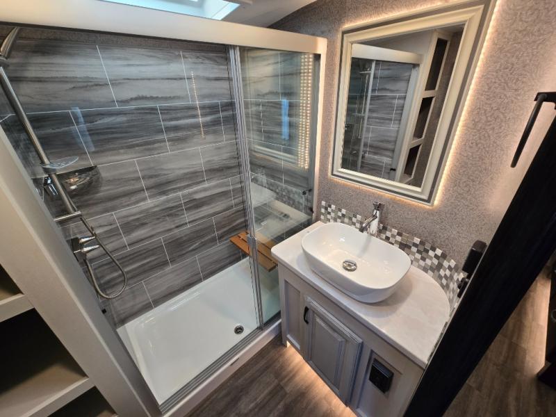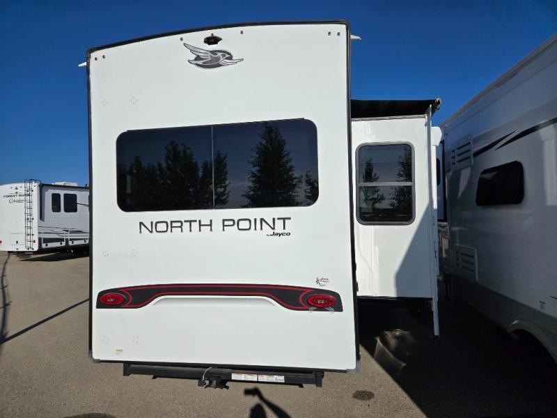 With any North Point fifth wheel by Jayco you begin with a strong foundation with a custom frame, designed and sized specifically to best support each unit. Constructed with Stronghold VBL™ aluminum framed, vacuum bond laminated walls and the Magnum Truss™ XL6™ roof system with a one-piece, seamless DiFlex II material which is the strongest tested roof in the industry. The 5-Star Handling package is included with Goodyear Endurance tires made in the USA, a MORryde rubber pin box, Dexter axles with Nev-R-Adjust brakes, MORryde CRE-3000 rubberized suspension and wet bolt fasteners and bronze bushings. The interior has handcrafted hardwood glazed doors, drawers and trim, vinyl flooring throughout made in the USA including on slide out floors, a residential bathroom backsplash and vessel bowl sink in the main bathroom, plus so much more you just have to see one to believe it all!