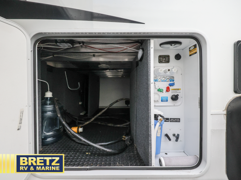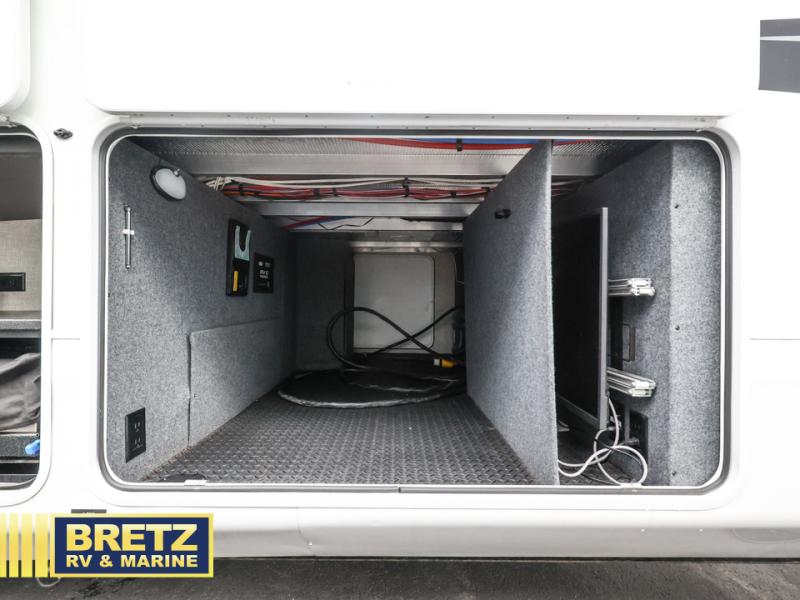 You can work from anywhere with this fifth wheel thanks to the middle bonus room that offers a desk with TV above, a tri-fold sofa with removable table, a flip-up bunk and a closet. This multi-use room works for just about anything including an extra living area and bunkhouse. The shoe storage under the interior steps, the linen cabinet in the full bathroom, the walk-in closet in the master bedroom, and the overhead cabinets plus exterior storage allows you to bring whatever you want. Enjoy cooking in the kitchen that provides an island, a 21 cu. ft. residential refrigerator or choose the 18 cu. ft. option, a pantry and everything you need to keep everyone fed. The theater seats, the tri-fold sofa and the free standing table without a pedestal are great places to sit while watching the 50" Smart LED HDTV with fully digital HDMI output and JBL home entertainment system with subwoofer plus there is a fireplace below for those chilly evenings.
