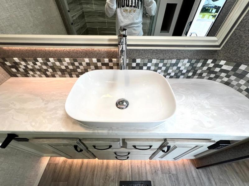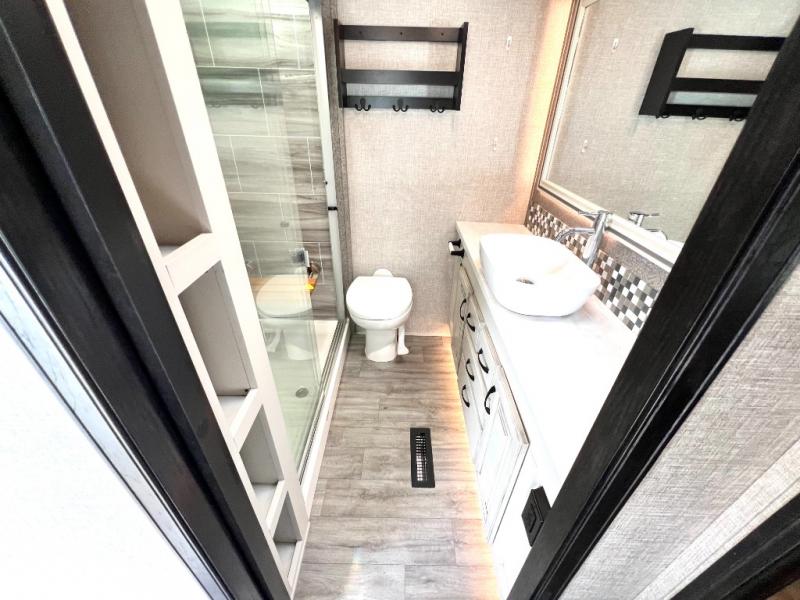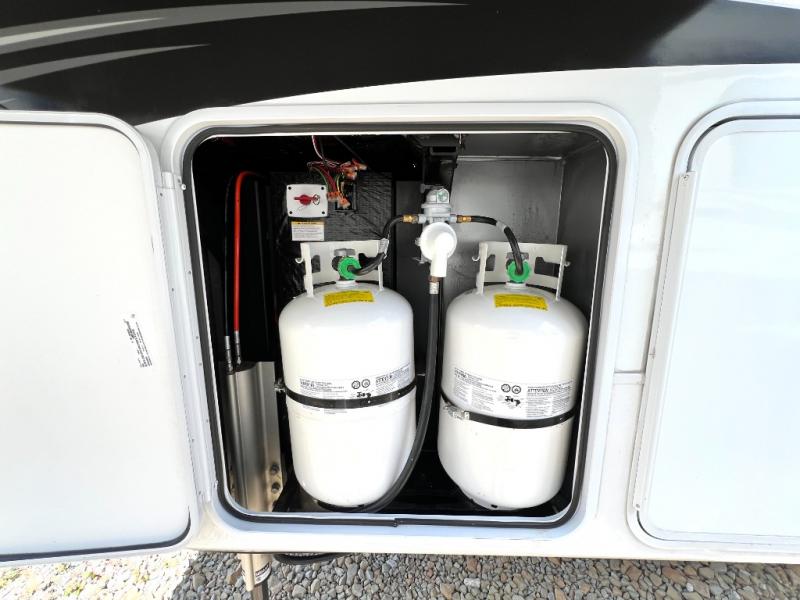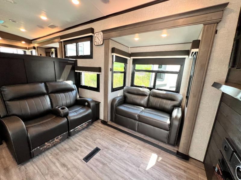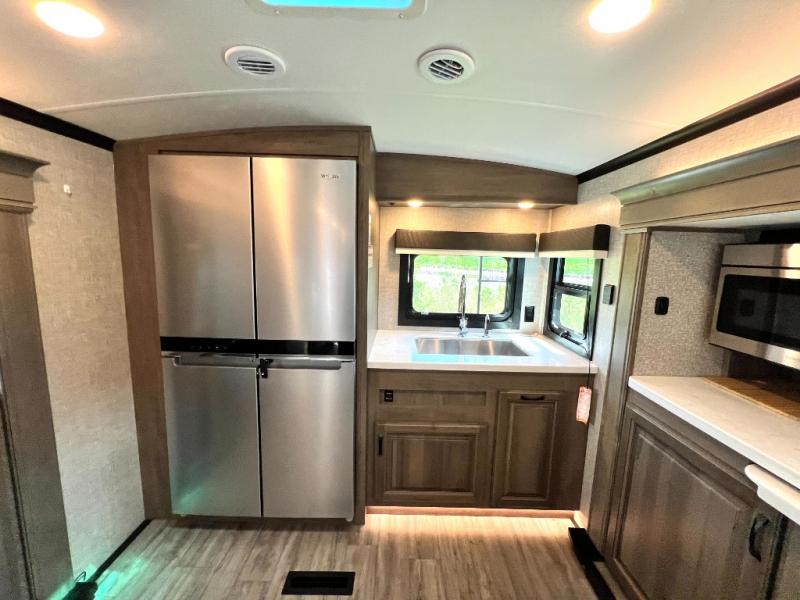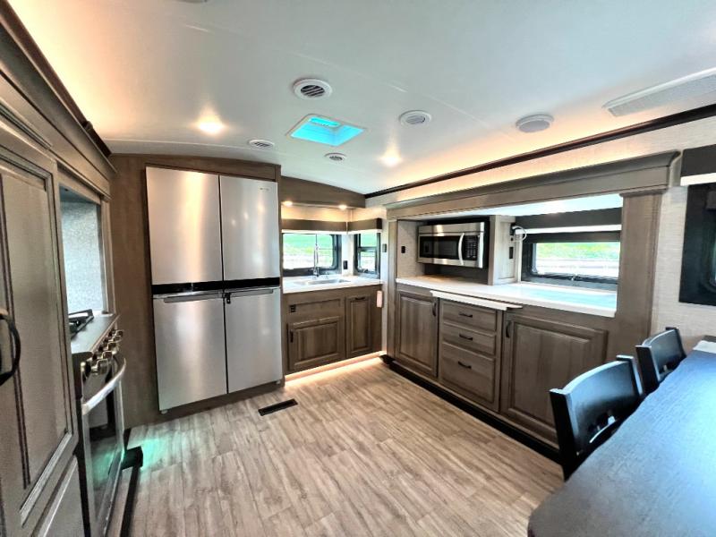 Convenience, comfort and style are found throughout this fifth wheel and a cook might call this a dream kitchen with the elevated area in the rear that includes two slide outs for maximum space, residential appliances including a 21 cu. ft. refrigerator, a double pull-out extension with two chairs and a breakfast bar top with two chairs allowing you to look into the middle living area. Here you will find two tri-fold sofa slides and theater seats to sit on, a ceiling fan to keep the air flowing, and a 50" Smart LED HDTV with fully digital HDMI output and home entertainment system with subwoofer. The fireplace makes the room cozy, the shoe storage under the interior steps is convenient, and the entry is a few steps away for you to be able to go outside to relax under the two awnings. When you are ready to retire for the evening, get cleaned up in the full bathroom and fall quickly to sleep on your own queen bed slide after grabbing your pajamas from the flip-up dresser or the walk-in closet which also includes a hamper and a washer/dryer prepped space to add that option.