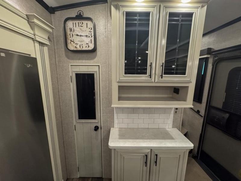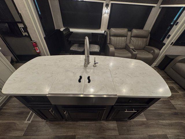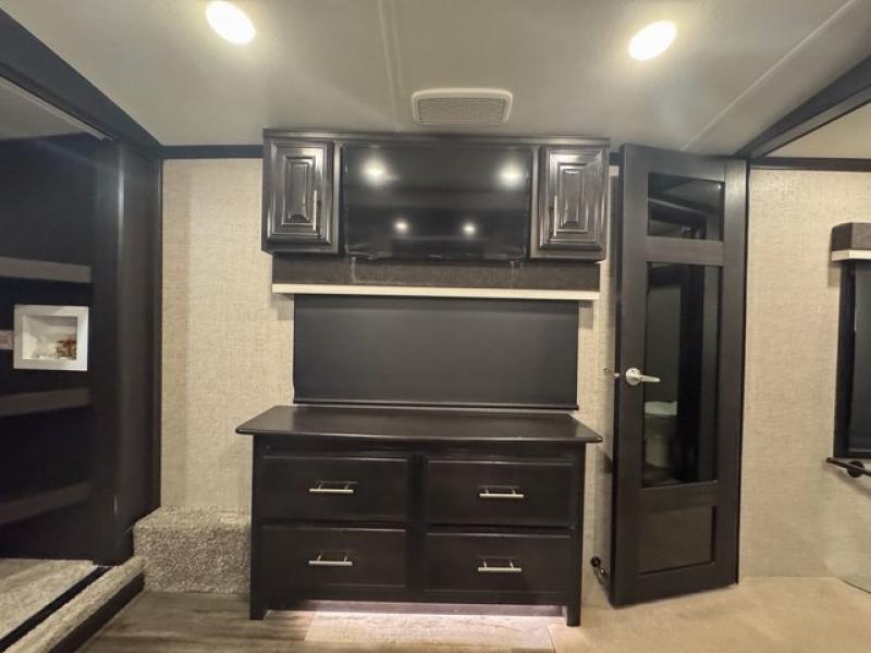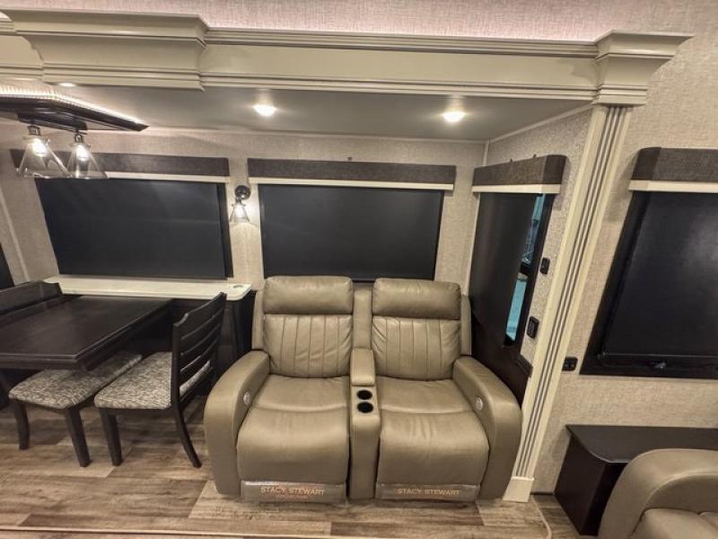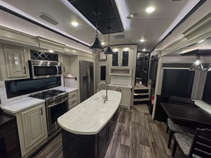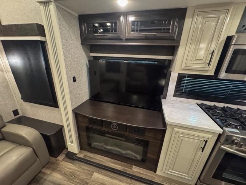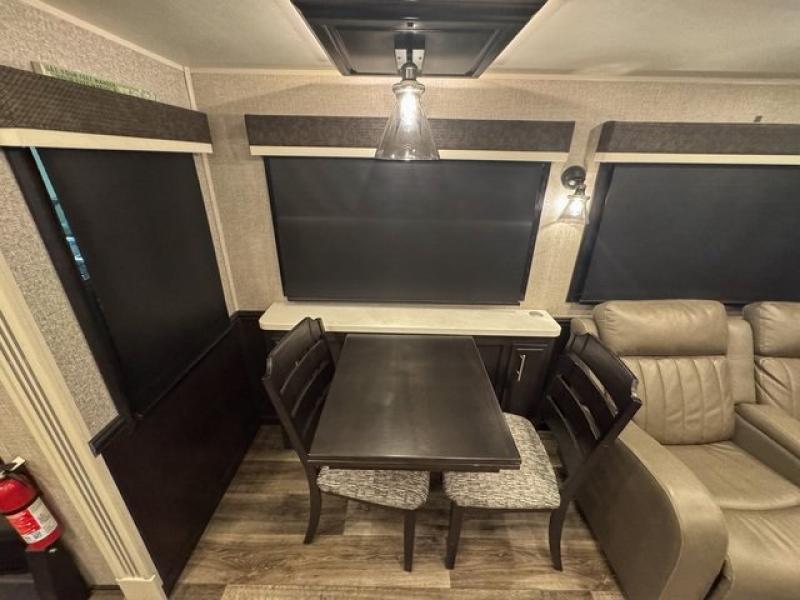 Trips to the lake are made comfortable in this triple slide out fifth wheel. Once you arrive at the campground, set up the two power awnings with LED lights, and there is an exterior TV for the big game. Head inside to relax on the theater seat directly across from the TV lift and fireplace, or play a game at the free-standing table. The chef of your group will love this Pinnacle kitchen with its residential refrigerator, kitchen island, a pantry, plus additional storage for canned goods or paper products. The full bath will allow you to stay clean throughout your trip, and you'll find residential bath backsplash, plus a shower with a seat for added comfort. Nothing says luxury like your own king bed slide out in the front bedroom, a walk-in closet for wrinkle-free clothes, and a flip-up dresser with a 32" TV!