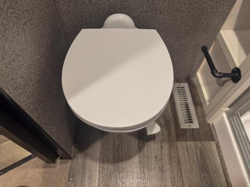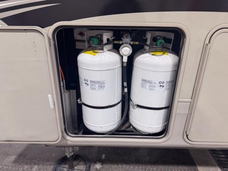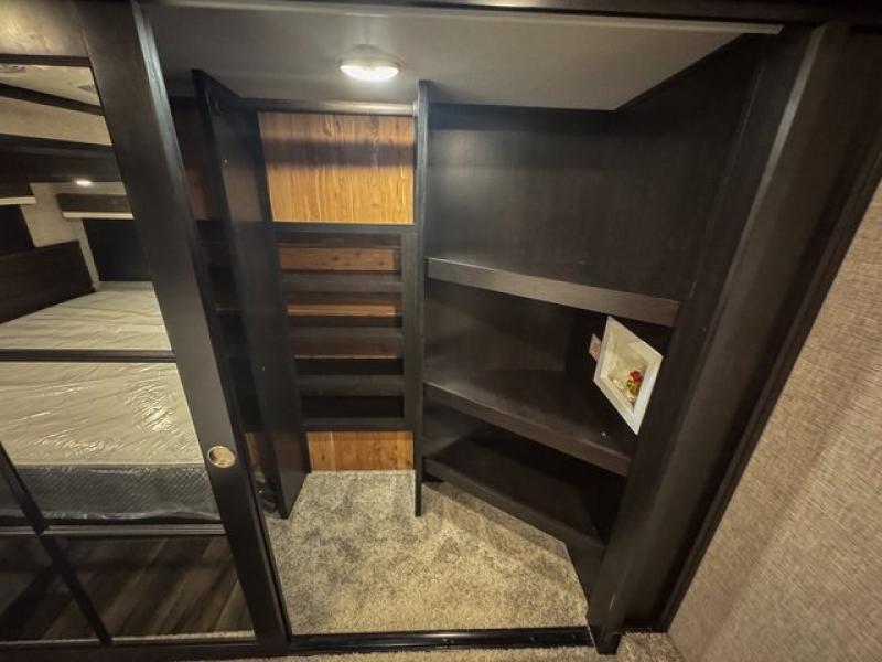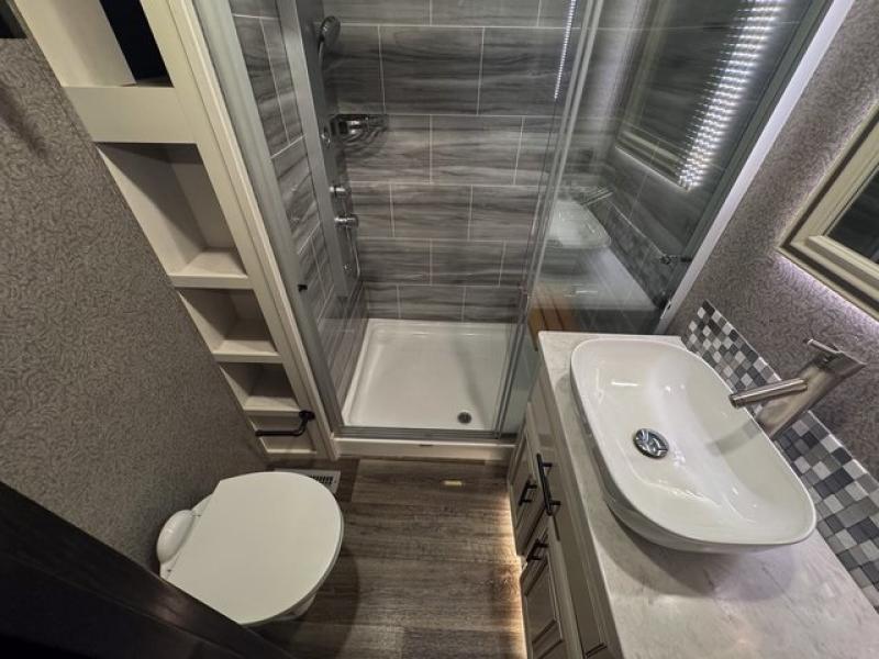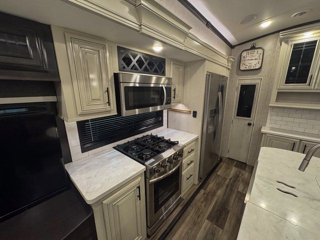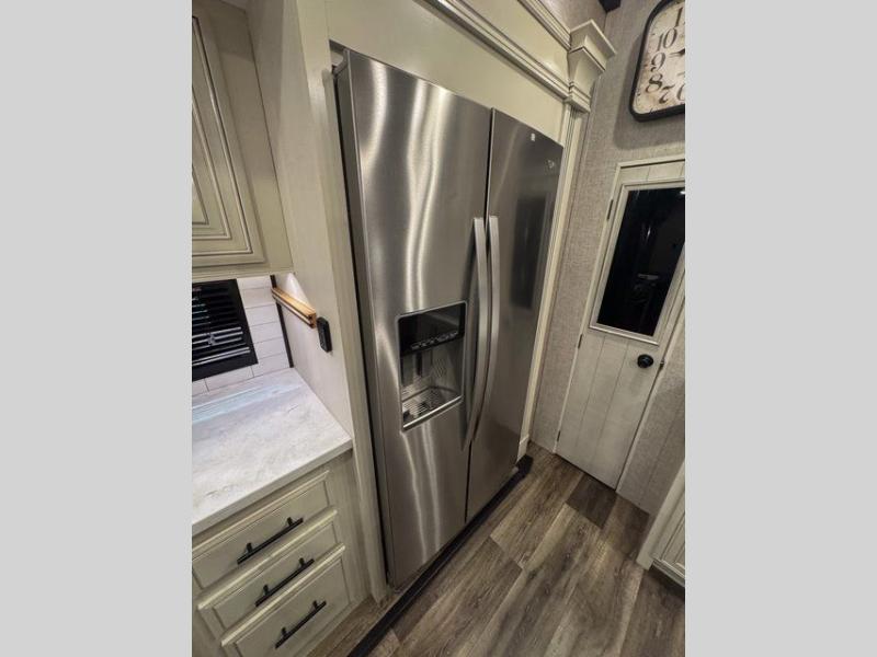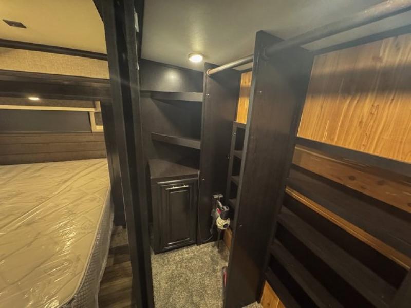 Trips to the lake are made comfortable in this triple slide out fifth wheel. Once you arrive at the campground, set up the two power awnings with LED lights, and there is an exterior TV for the big game. Head inside to relax on the theater seat directly across from the TV lift and fireplace, or play a game at the free-standing table. The chef of your group will love this Pinnacle kitchen with its residential refrigerator, kitchen island, a pantry, plus additional storage for canned goods or paper products. The full bath will allow you to stay clean throughout your trip, and you'll find residential bath backsplash, plus a shower with a seat for added comfort. Nothing says luxury like your own king bed slide out in the front bedroom, a walk-in closet for wrinkle-free clothes, and a flip-up dresser with a 32" TV!