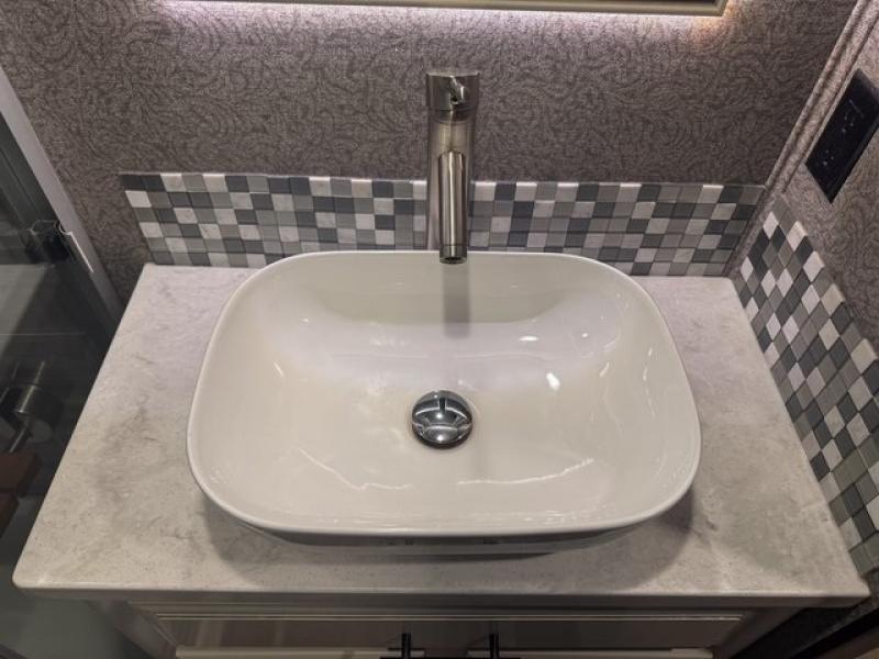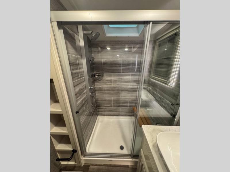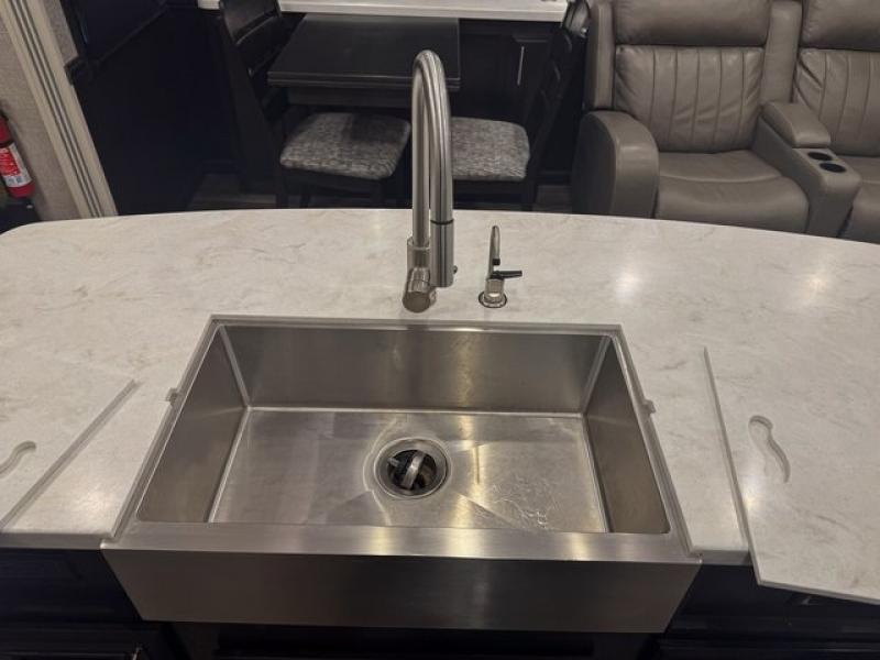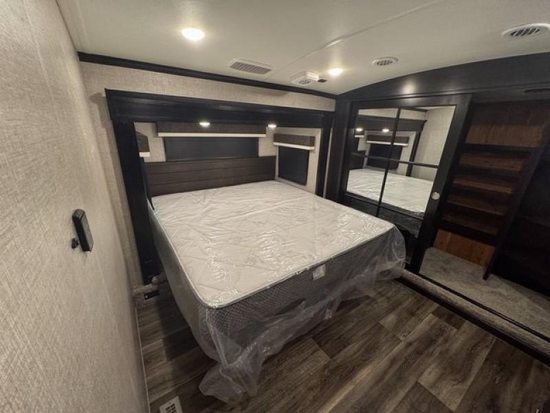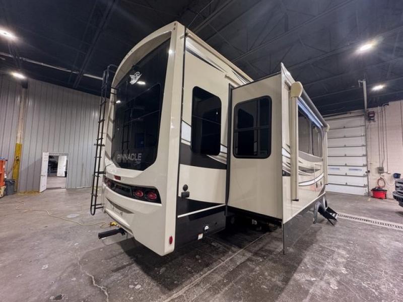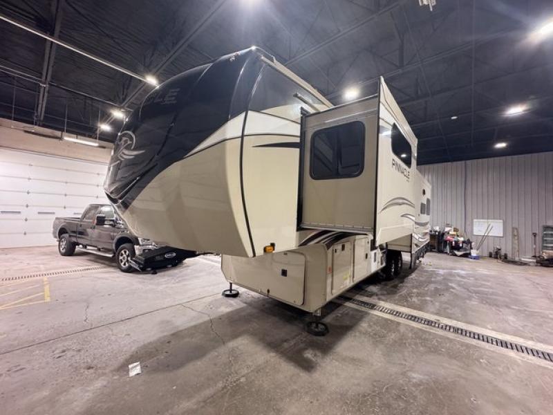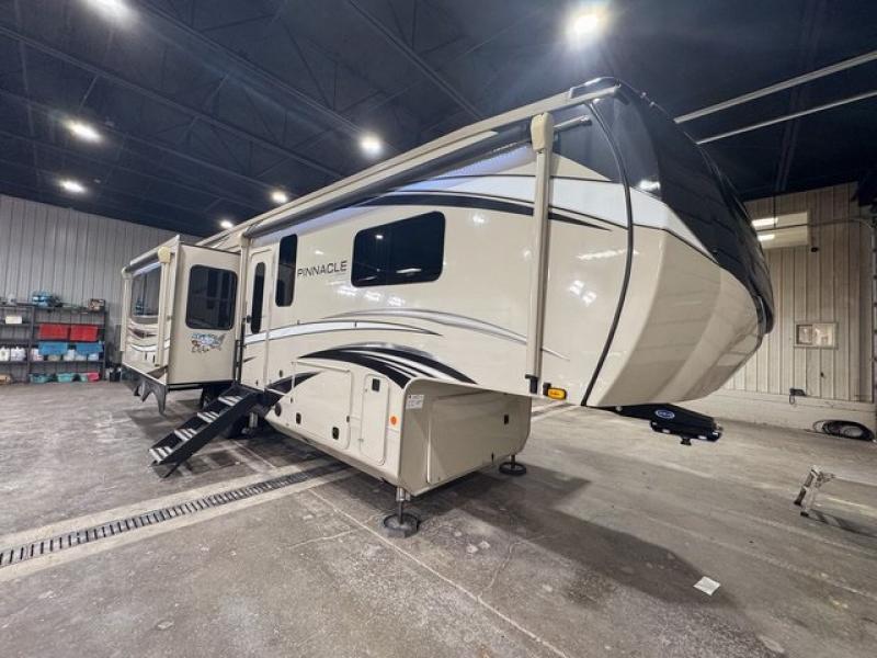 Each Pinnacle fifth wheel features Stronghold VBL lamination for the lightest, yet strongest construction in the RV industry. Add that to the Magnum Truss XL6 roof system and Climate Shield zero-degree tested weather protection and you'll be enjoying your fifth wheel for years to come. Some of the exterior conveniences you will appreciate are the Keyed-Alike lock system, the fully enclosed, universal docking center, and the 6-point hydraulic auto-leveling system for quick and easy set up. The 5 Star Handling Package will make towing a fifth wheel a walk in the park, and the two Whisper Quiet A/C units will keep you comfortable during the hot summer months. Inside, you'll enjoy the farmhouse stainless steel sink, the handcrafted hardwood glazed cabinetry, the vinyl flooring throughout, plus many more comforts. There is even a central vacuum system, a wireless remote control system, USB ports throughout, plus many more conveniences to make each trip enjoyable.