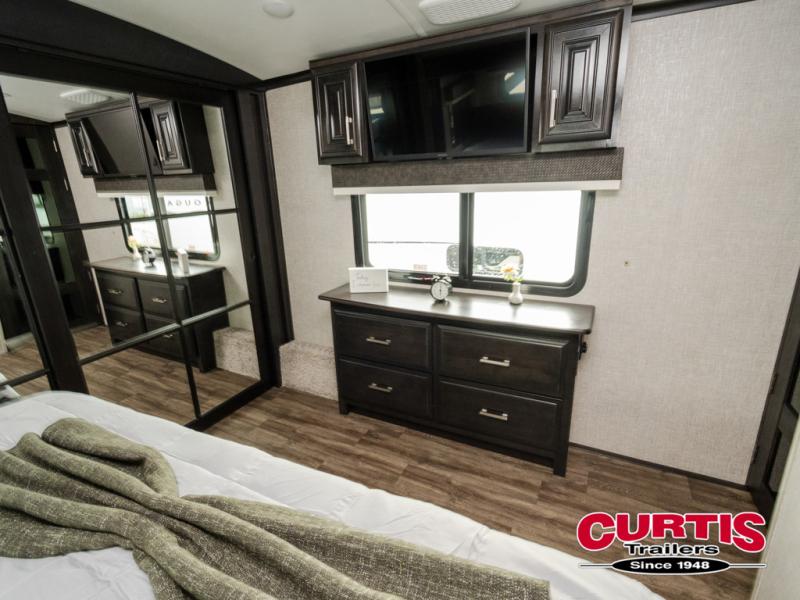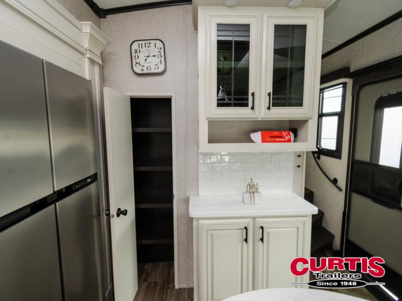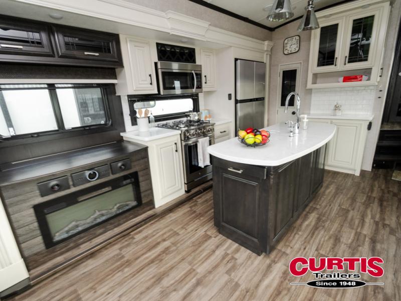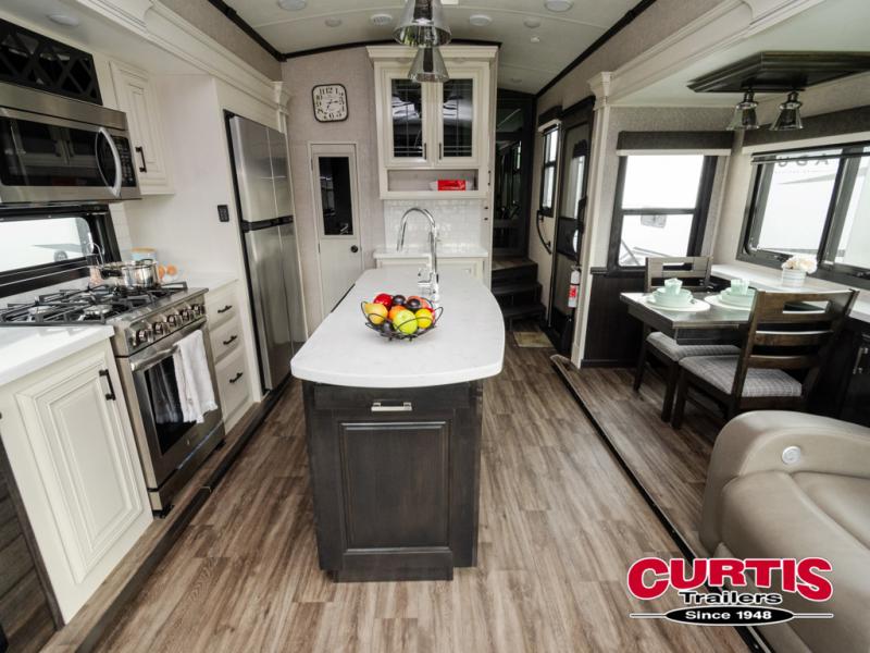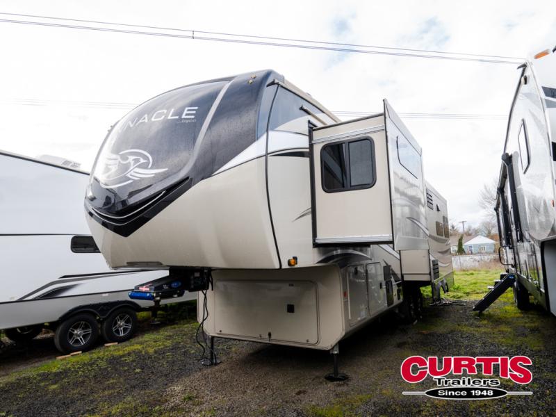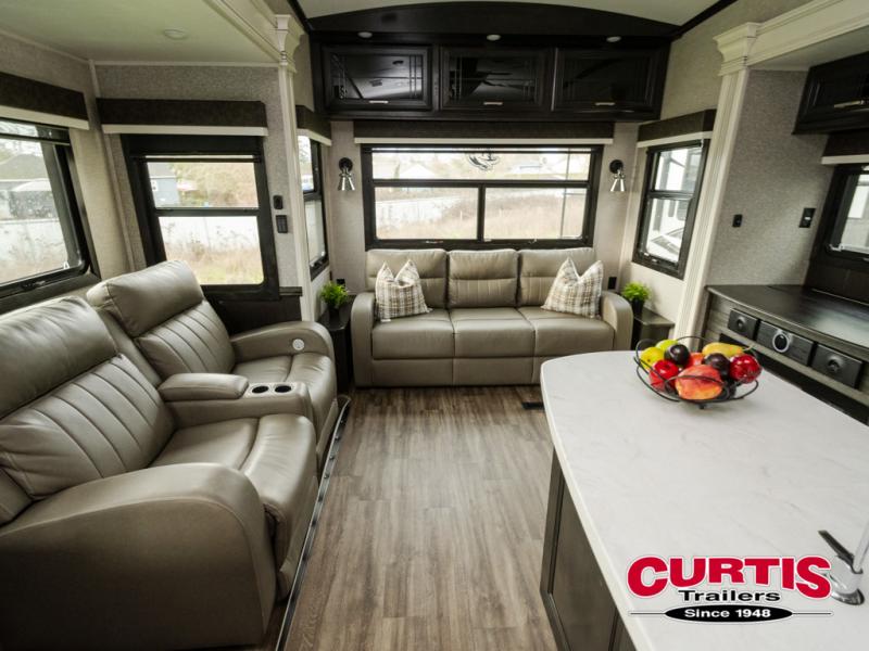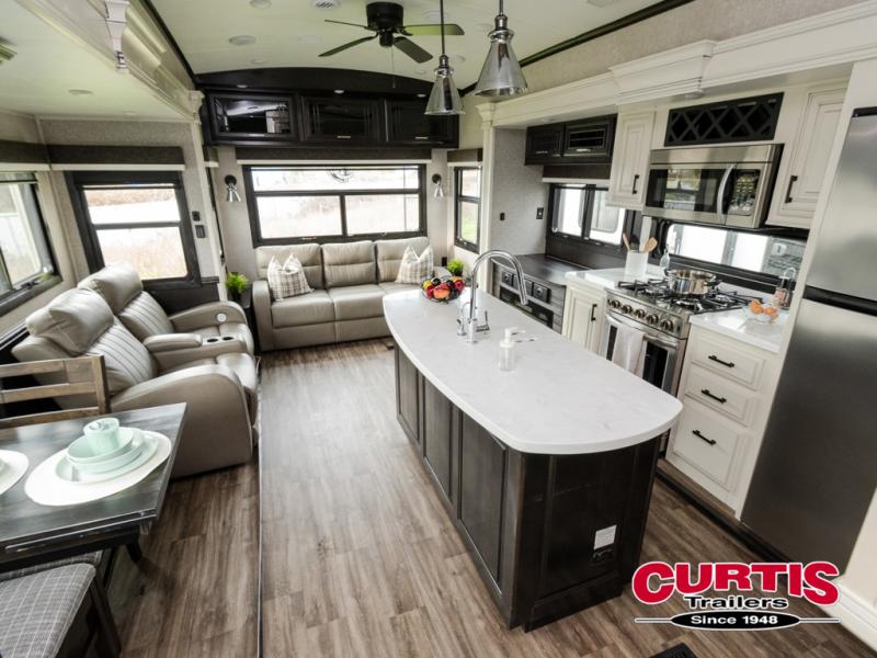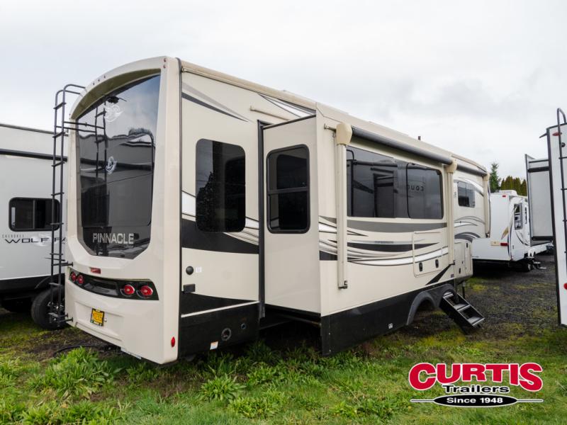 Trips to the lake are made comfortable in this triple slide out fifth wheel. Once you arrive at the campground, set up the two power awnings with LED lights, and there is an exterior TV for the big game. Head inside to relax on the theater seat directly across from the TV lift and fireplace, or play a game at the free-standing table. The chef of your group will love this Pinnacle kitchen with its residential refrigerator, kitchen island, a pantry, plus additional storage for canned goods or paper products. The full bath will allow you to stay clean throughout your trip, and you'll find residential bath backsplash, plus a shower with a seat for added comfort. Nothing says luxury like your own king bed slide out in the front bedroom, a walk-in closet for wrinkle-free clothes, and a flip-up dresser with a 32" TV!