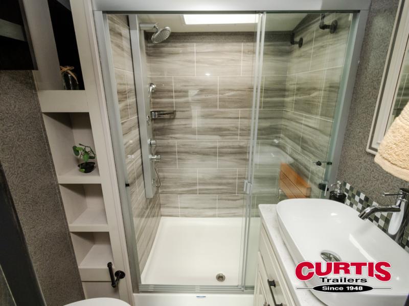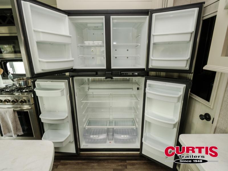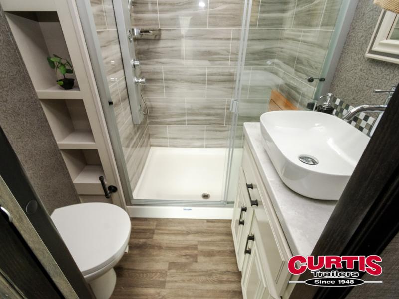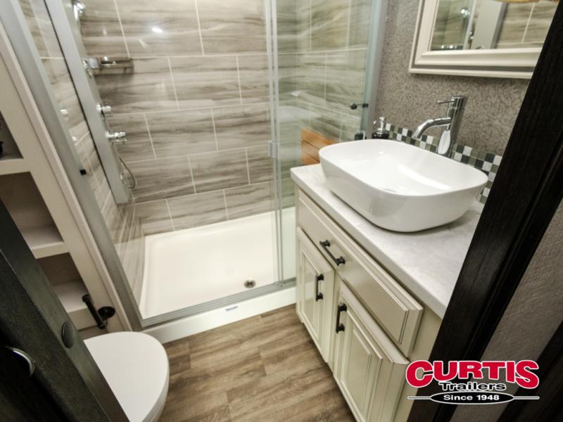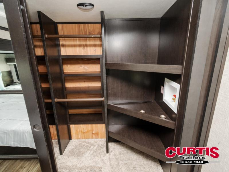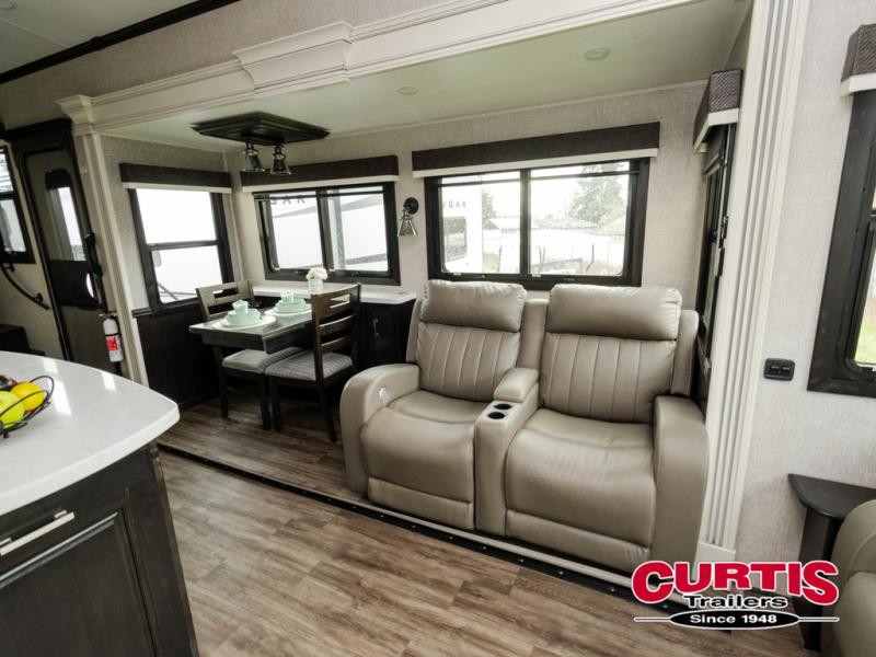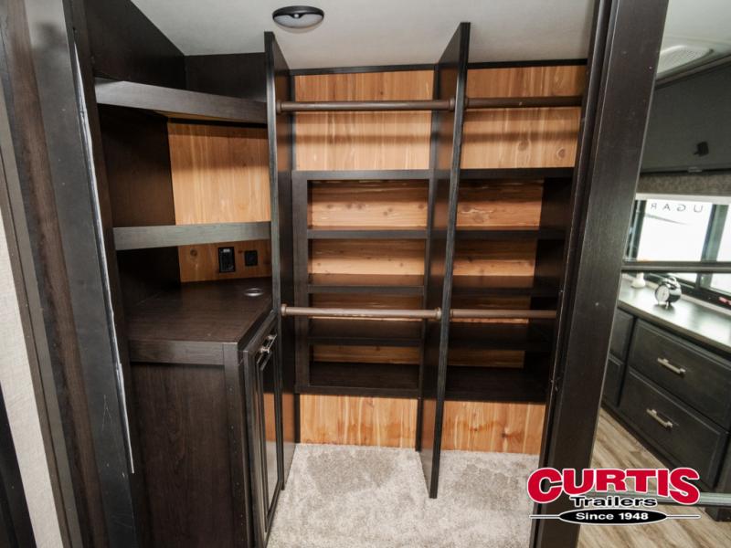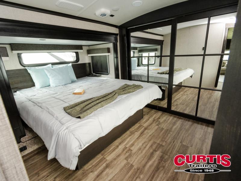 Trips to the lake are made comfortable in this triple slide out fifth wheel. Once you arrive at the campground, set up the two power awnings with LED lights, and there is an exterior TV for the big game. Head inside to relax on the theater seat directly across from the TV lift and fireplace, or play a game at the free-standing table. The chef of your group will love this Pinnacle kitchen with its residential refrigerator, kitchen island, a pantry, plus additional storage for canned goods or paper products. The full bath will allow you to stay clean throughout your trip, and you'll find residential bath backsplash, plus a shower with a seat for added comfort. Nothing says luxury like your own king bed slide out in the front bedroom, a walk-in closet for wrinkle-free clothes, and a flip-up dresser with a 32" TV!